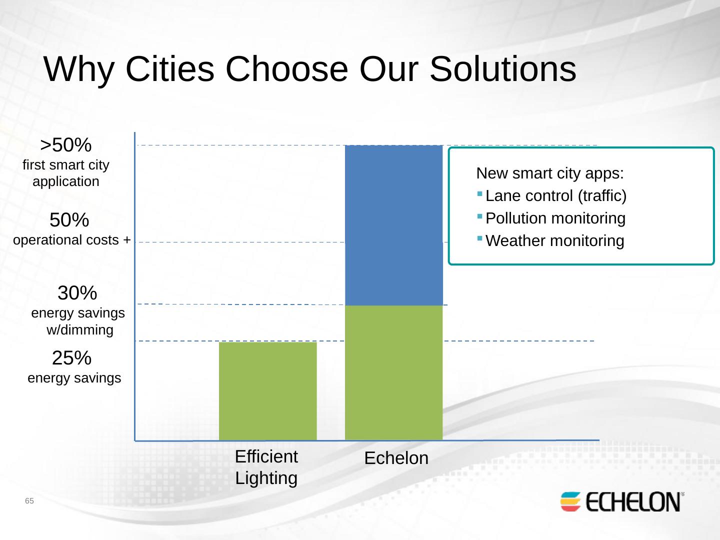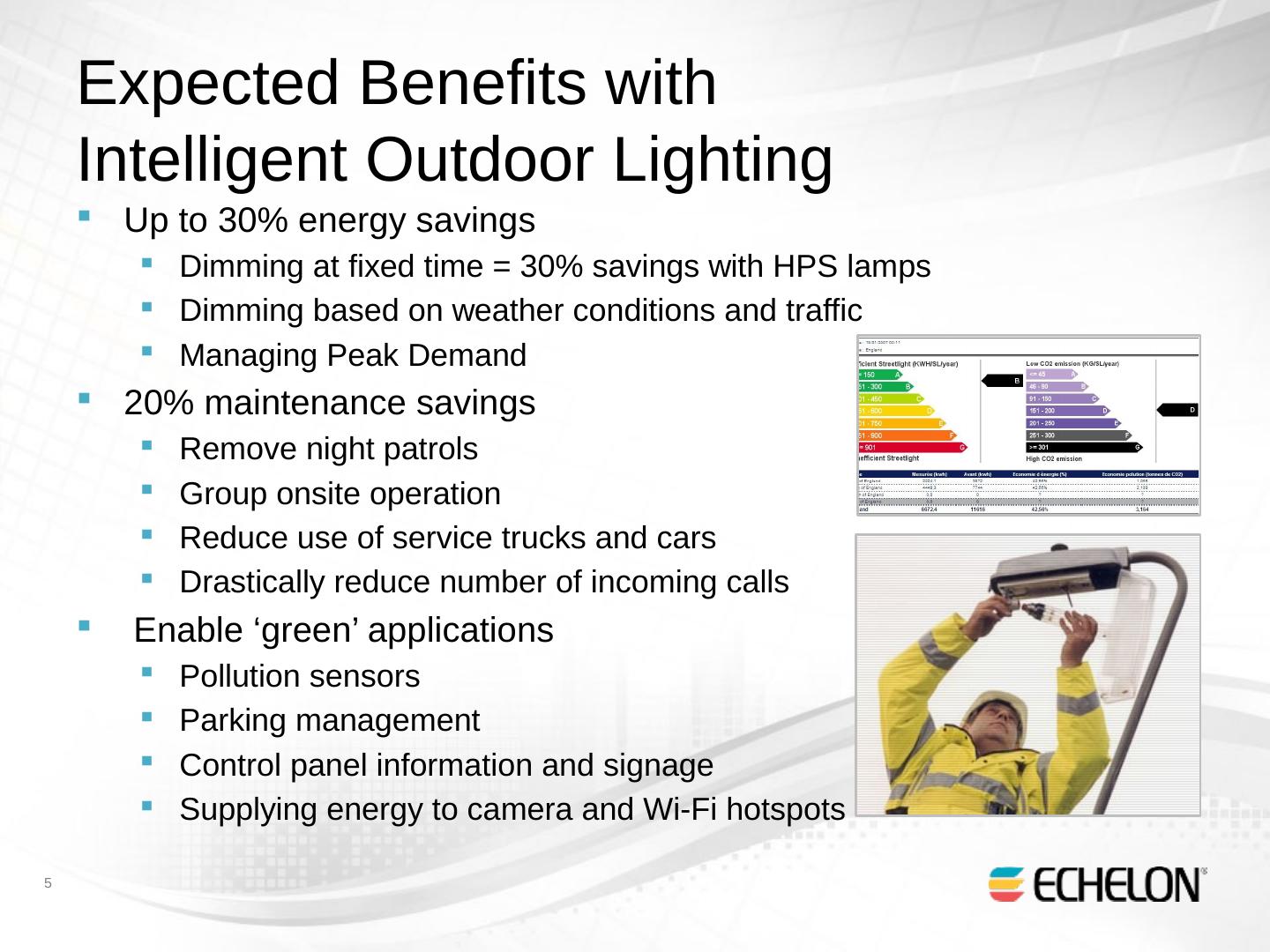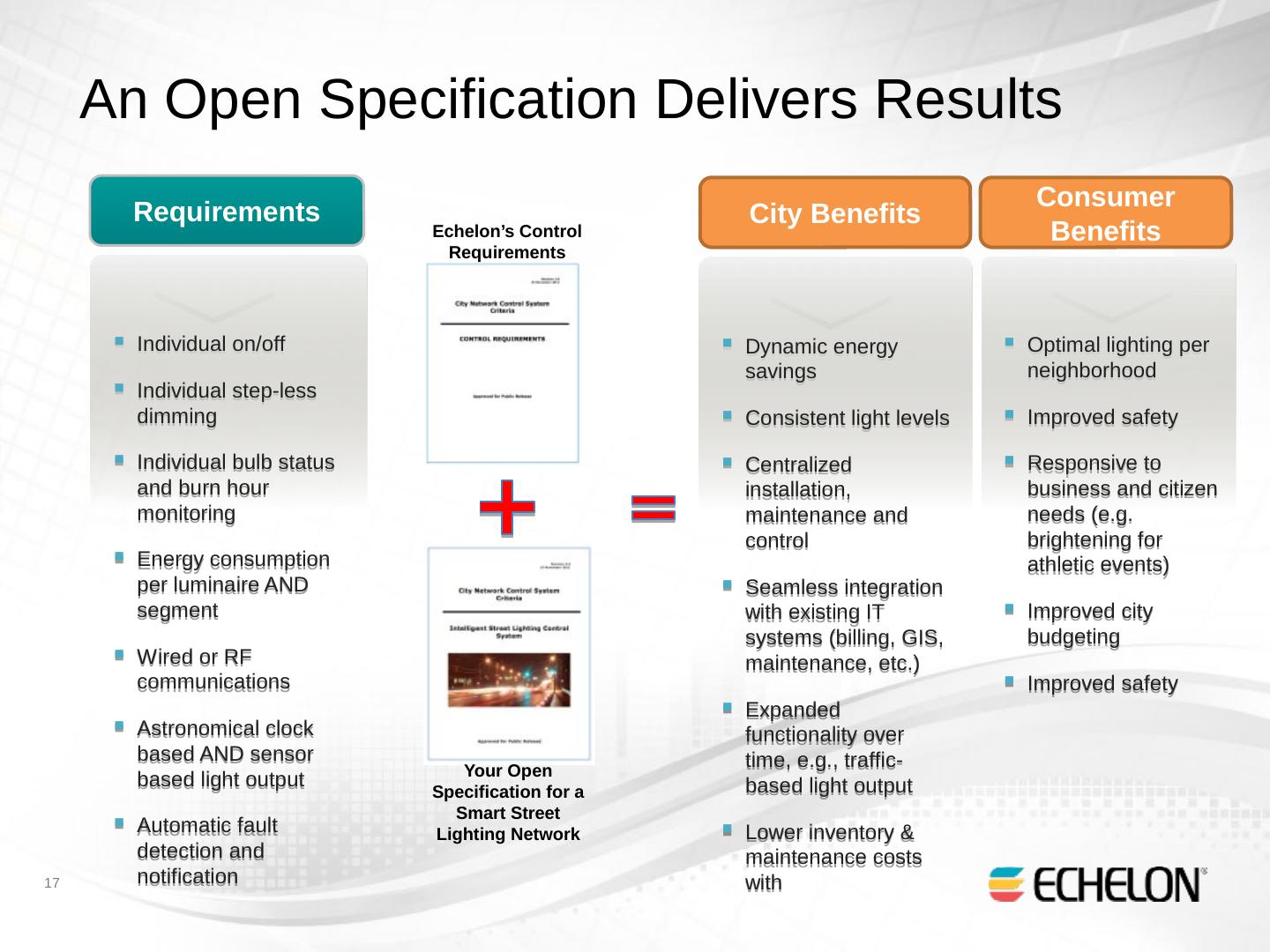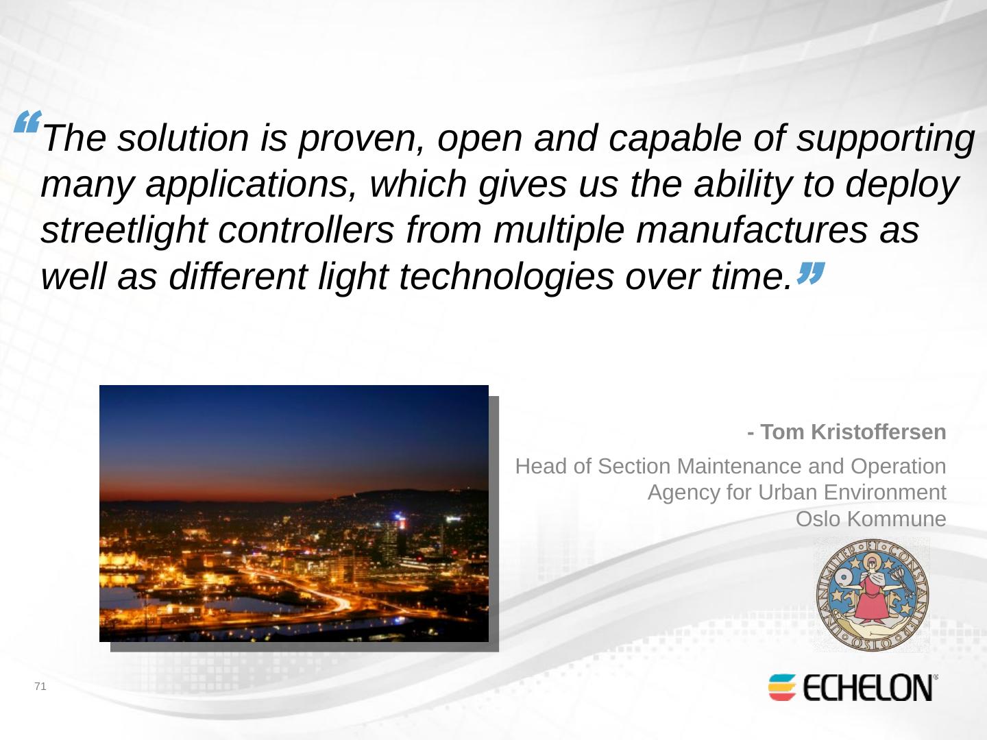 面向未来. 每一个设备都能“感知电网”; 开放标准化的接口确保与城市其他应用服务和电网应用集成; 能够远程更新路段控制器和灯具的软件; 支持XMPP即时通信协议.