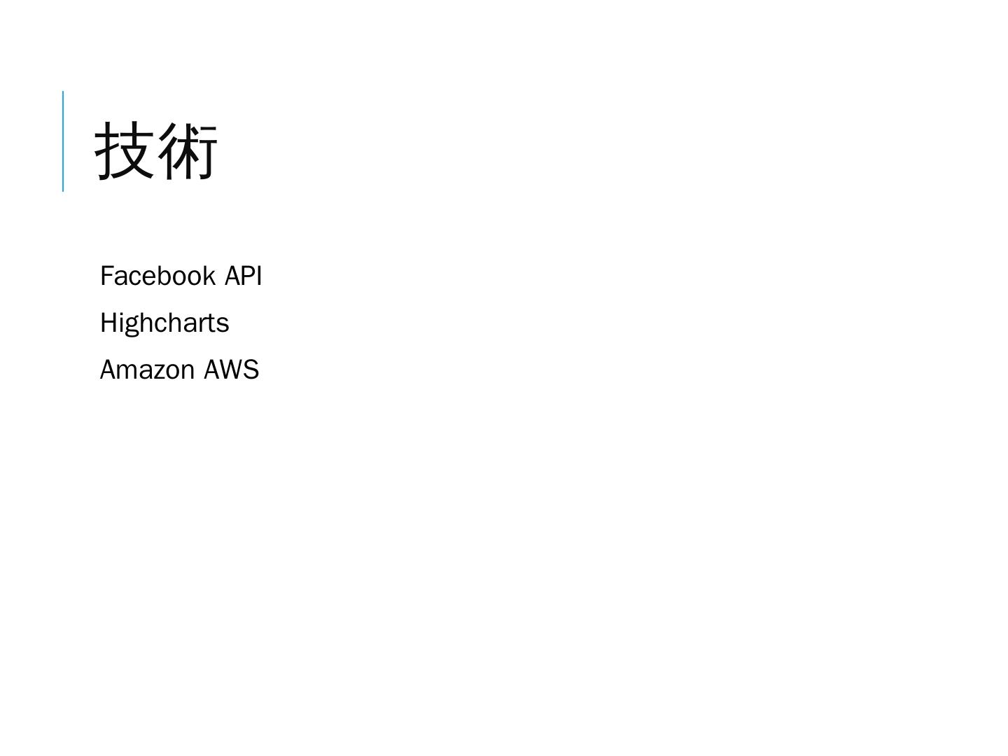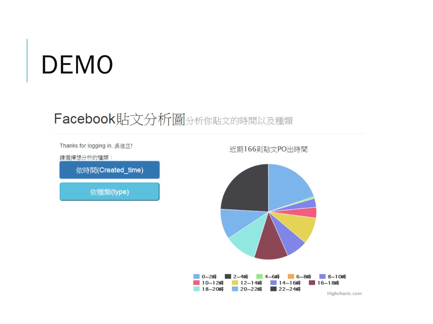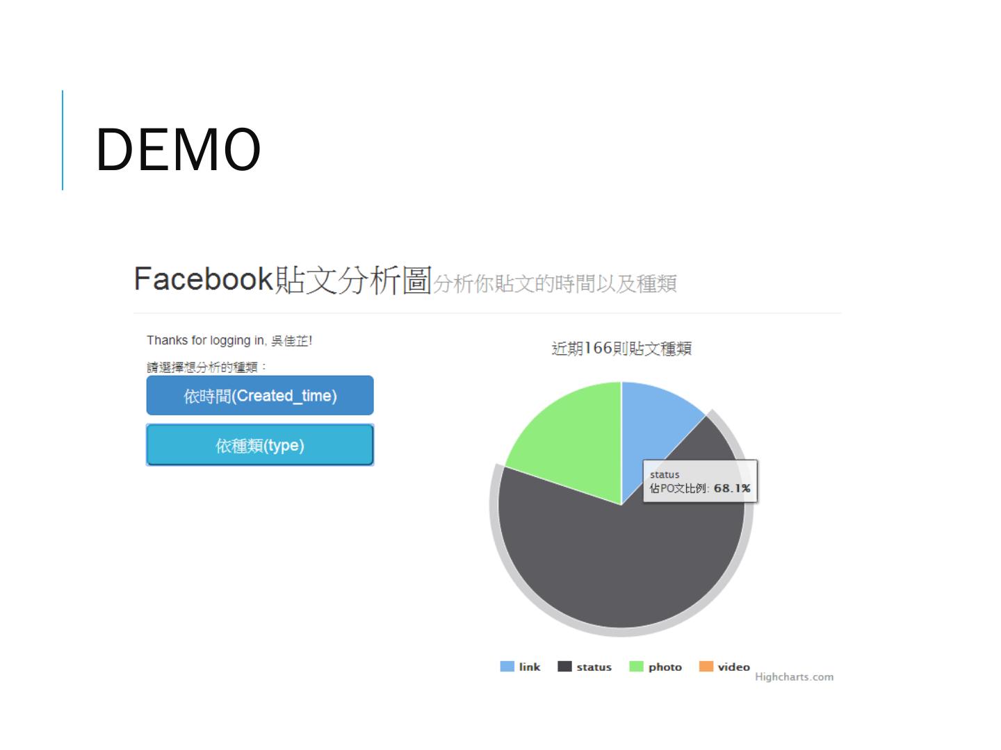 探究自己的FB使用習慣及背後的小故事(?). 技術. Facebook API; Highcharts; Amazon AWS. Demo ! 利用Facebook API登入並取得資料. Facebook Graph API 2.0.