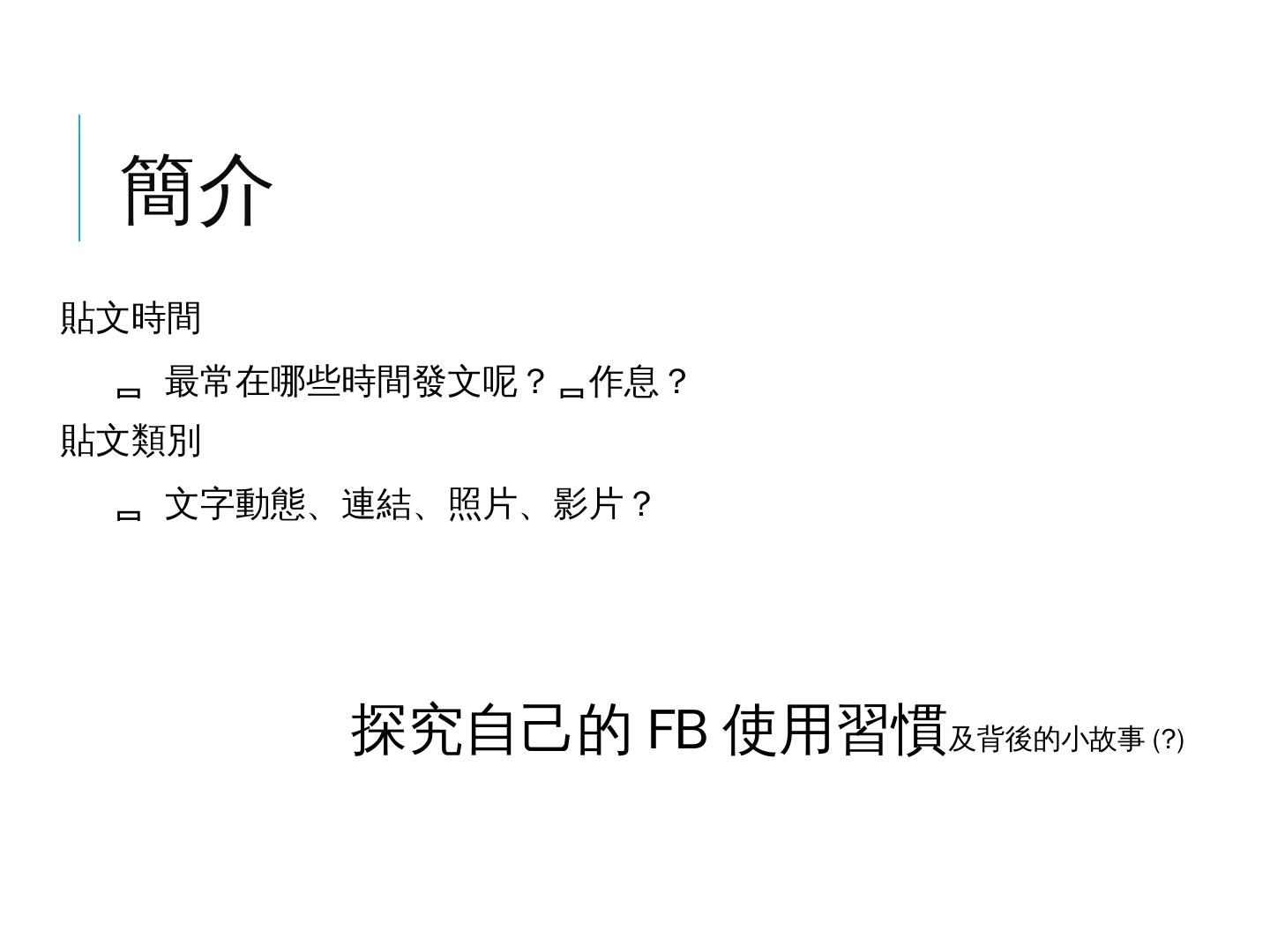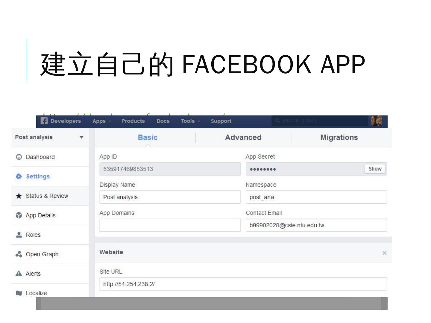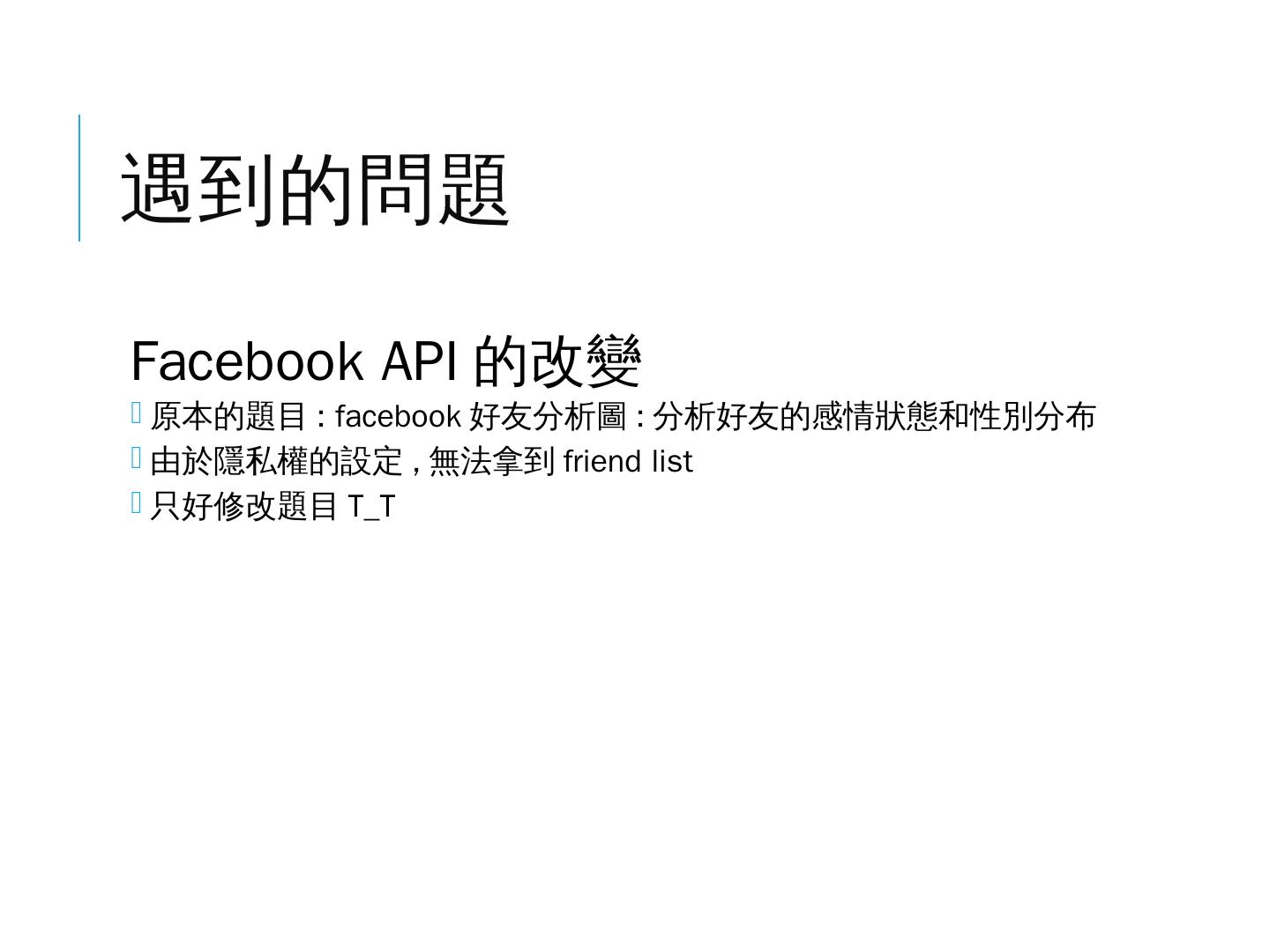 探究自己的FB使用習慣及背後的小故事(?). 技術. Facebook API; Highcharts; Amazon AWS. Demo ! 利用Facebook API登入並取得資料. Facebook Graph API 2.0.