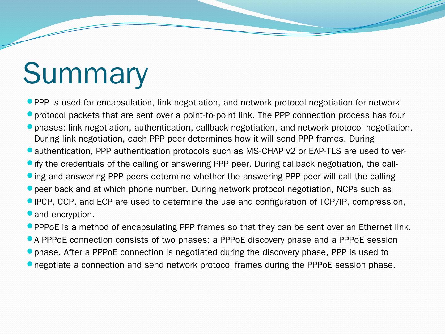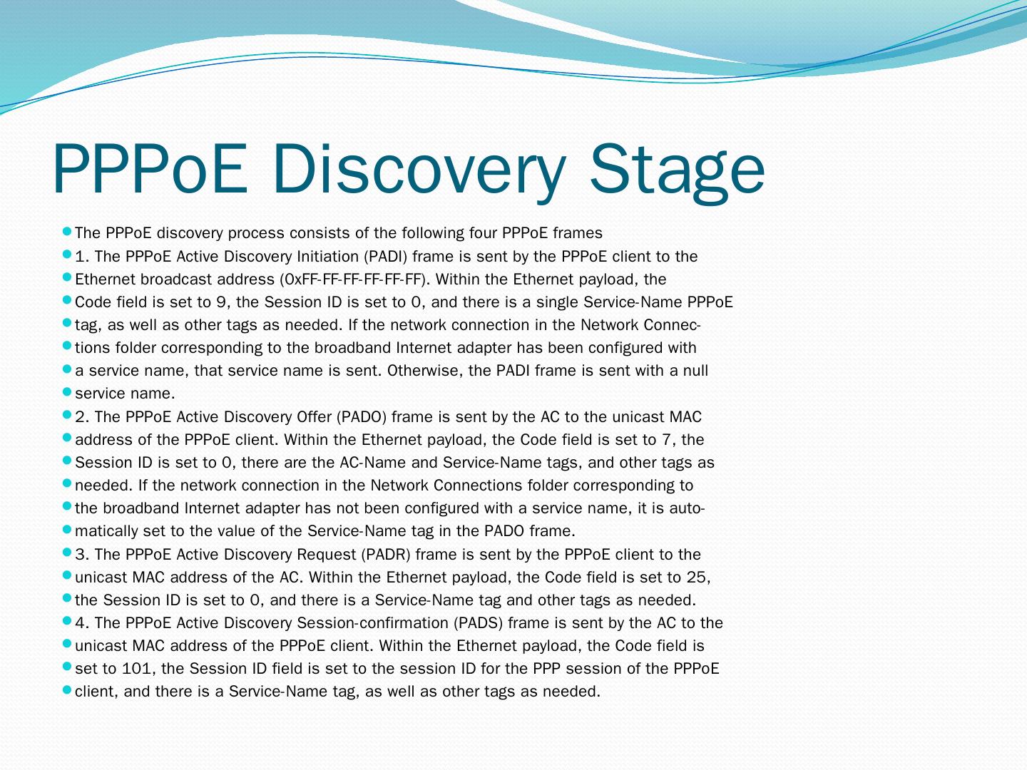 PPP over Ethernet (PPPoE) is a method of encapsulating PPP frames so that they can be sent; over an Ethernet network. PPPoE was created so that Internet ...