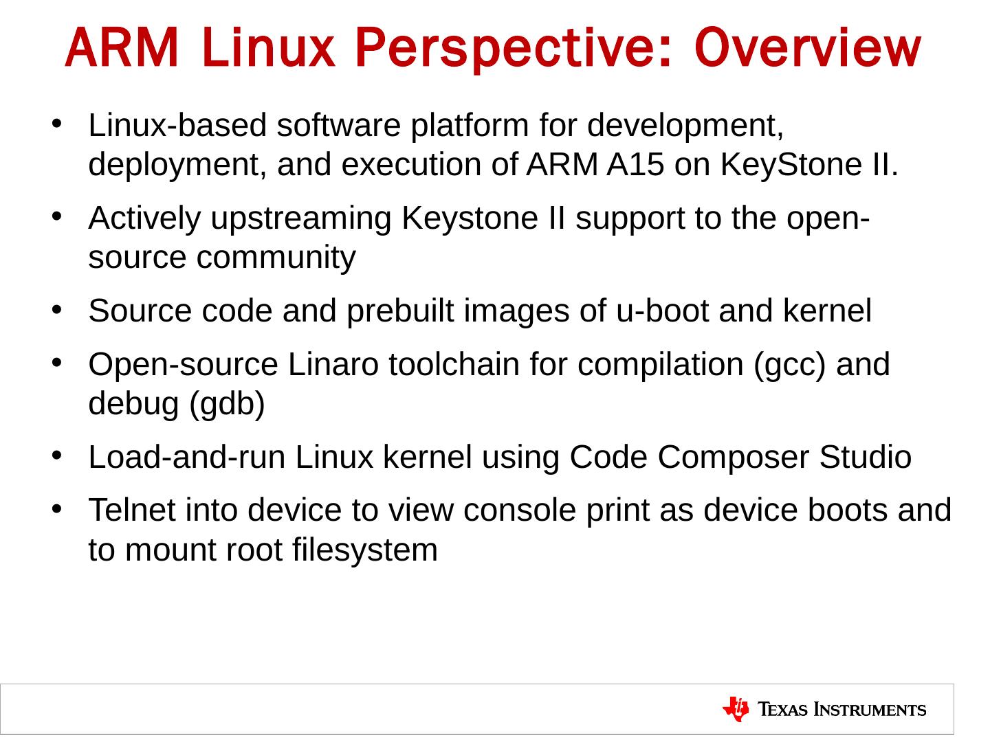 Bootloader ... Linux-based software platform for development, deployment, and execution of ... Generic Interrupt Controller (GIC) using Linux IRQ API for ARM.