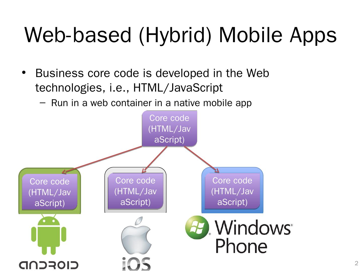 2 .Core code ( HTML/JavaScript) Web-based (Hybrid) Mobile Apps Business core code is developed in the Web technologies, i.e., HTML/JavaScript Run in a web container in a native mobile app 1 Core code ( HTML/JavaScript) Core code ( HTML/JavaScript) Core code ( HTML/JavaScript)