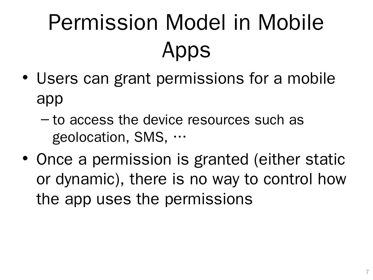7 .Permission Model in Mobile Apps Users can grant permissions for a mobile app to access the device resources such as geolocation , SMS, … Once a permission is granted (either static or dynamic), there is no way to control how the app uses the permissions 6