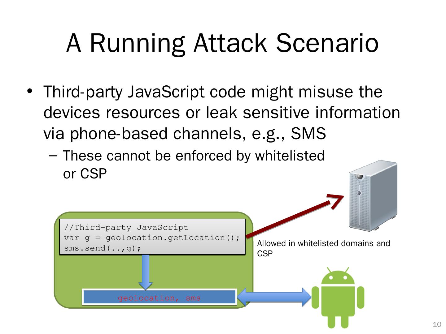 10 .A Running Attack Scenario Third-party JavaScript code might misuse the devices resources or leak sensitive information via phone-based channels, e.g., SMS These cannot be enforced by whitelisted or CSP 9 geolocation , sms //Third-party JavaScript var g = geolocation.getLocation (); sms.send (..,g); Allowed in whitelisted domains and CSP