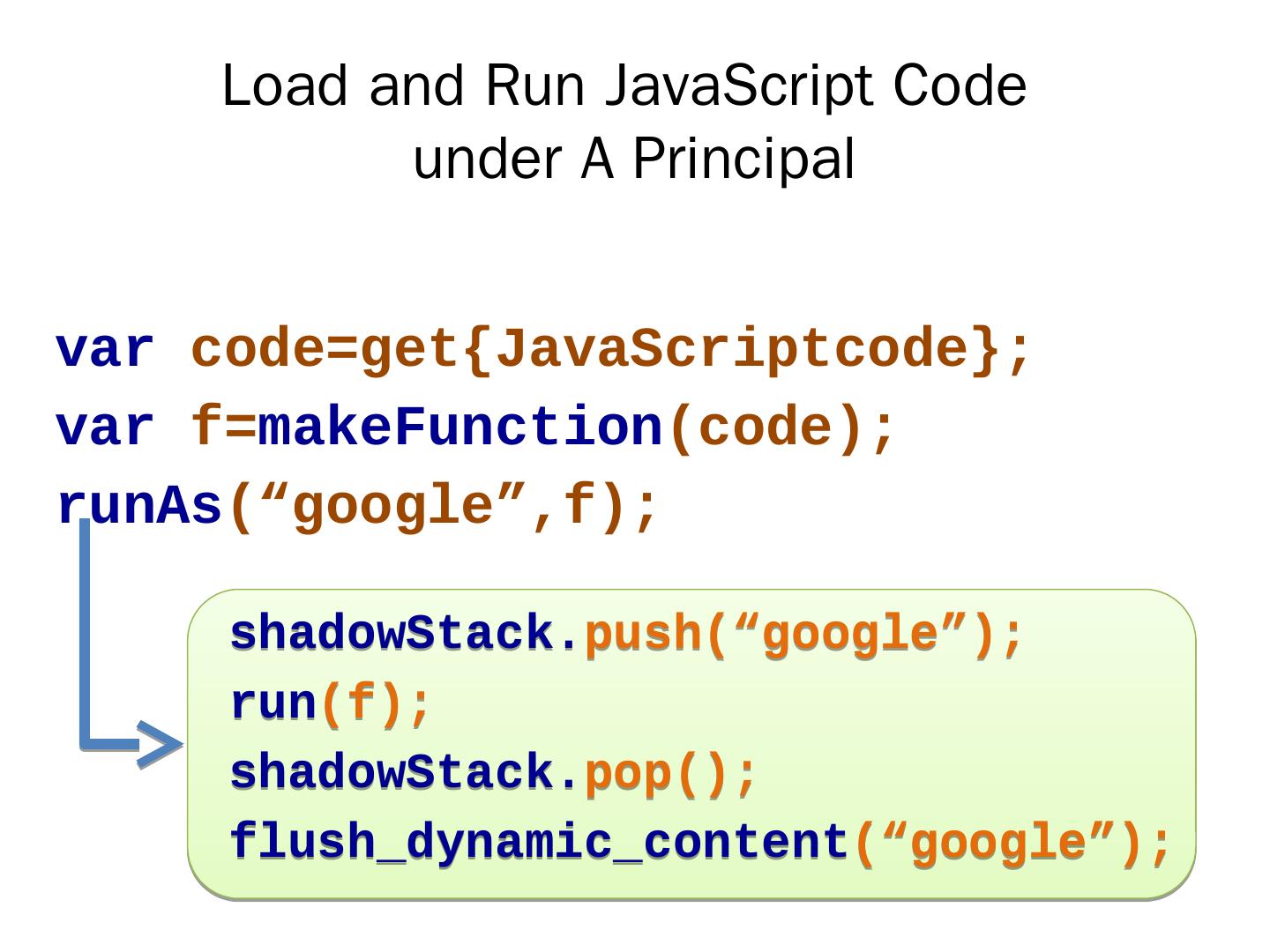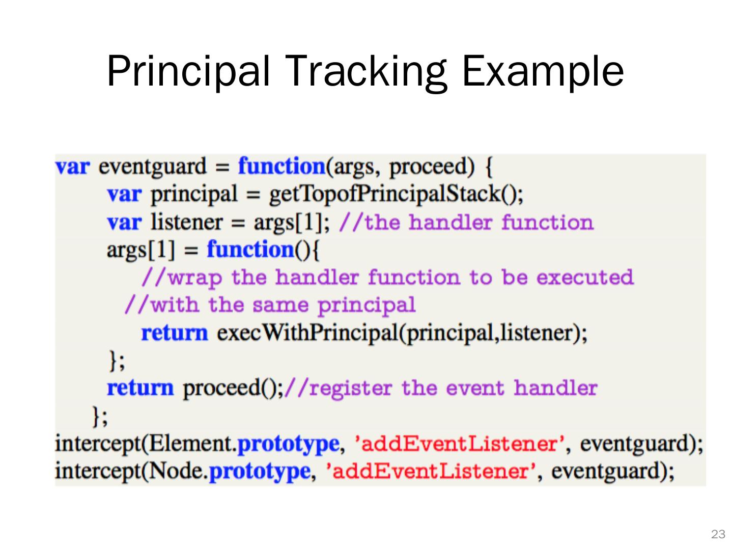 22 .Load and Run JavaScript Code under A Principal var code=get { JavaScriptcode }; var f= makeFunction (code); runAs (“ google ”,f); shadowStack. push (“ google ”); run (f); shadowStack. pop (); flush_dynamic_content (“ google ”);