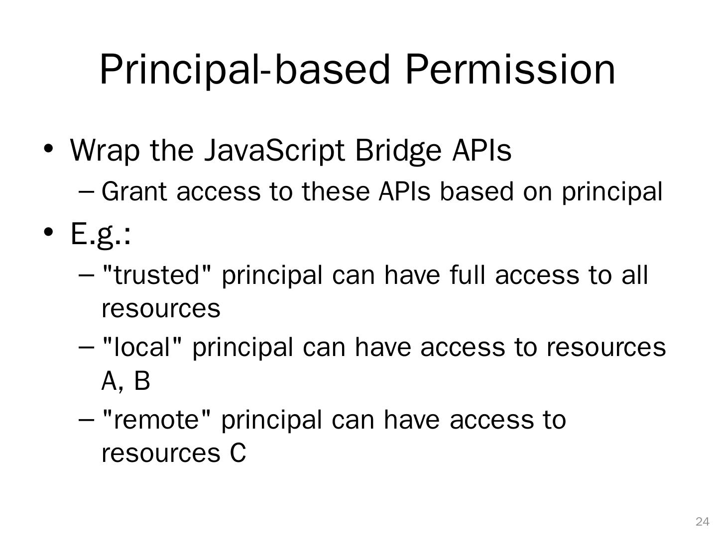 24 .Principal-based Permission Wrap the JavaScript Bridge APIs Grant access to these APIs based on principal E.g.: "trusted" principal can have full access to all resources "local" principal can have access to resources A, B "remote" principal can have access to resources C 23