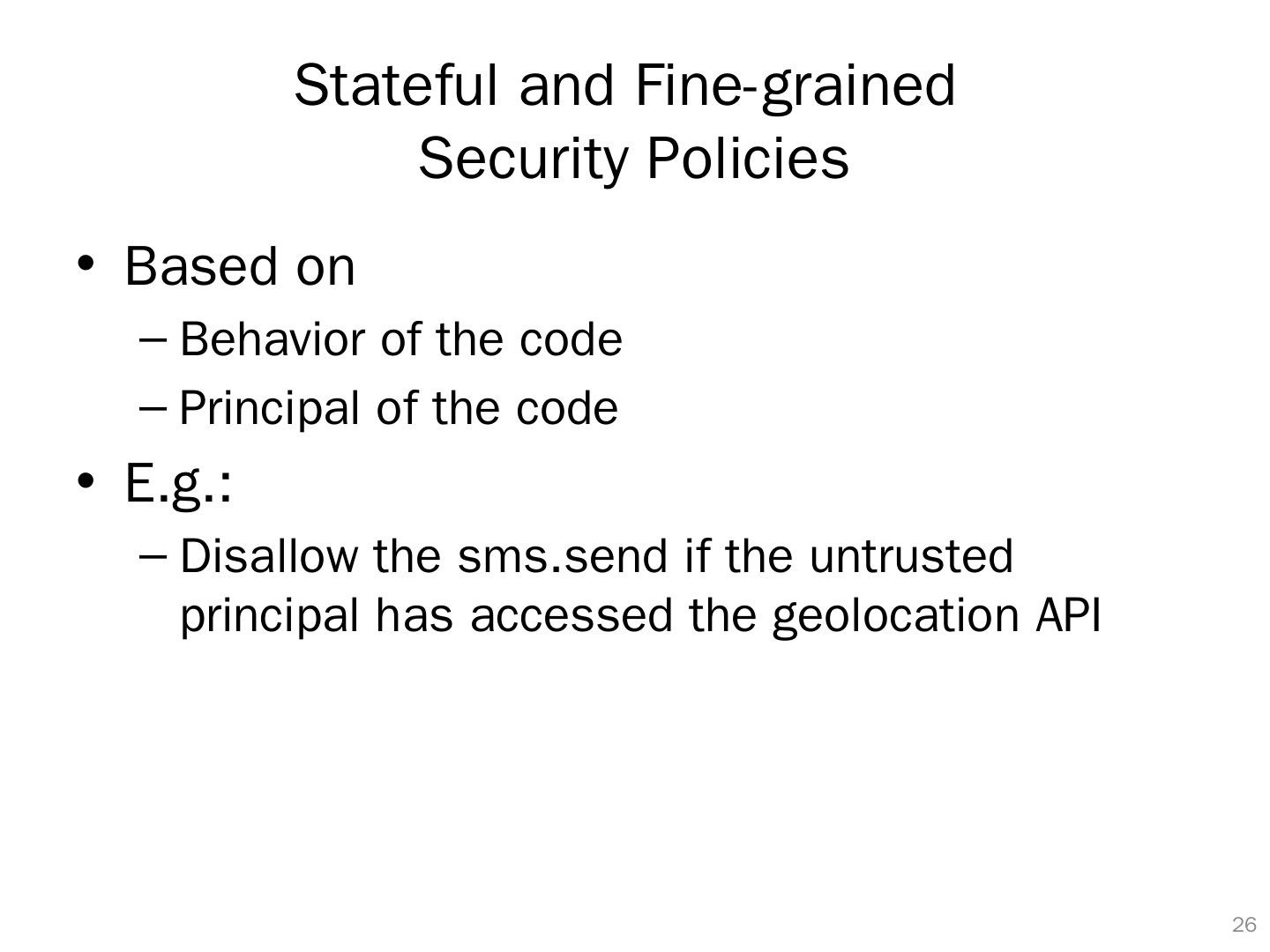 26 .Stateful and Fine-grained Security Policies Based on Behavior of the code Principal of the code E.g.: Disallow the sms.send if the untrusted principal has accessed the geolocation API 25