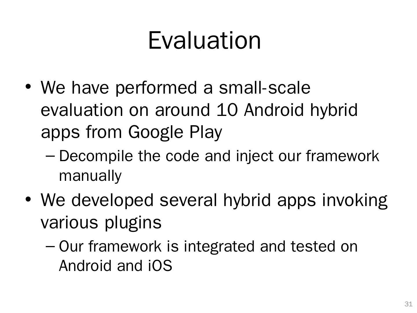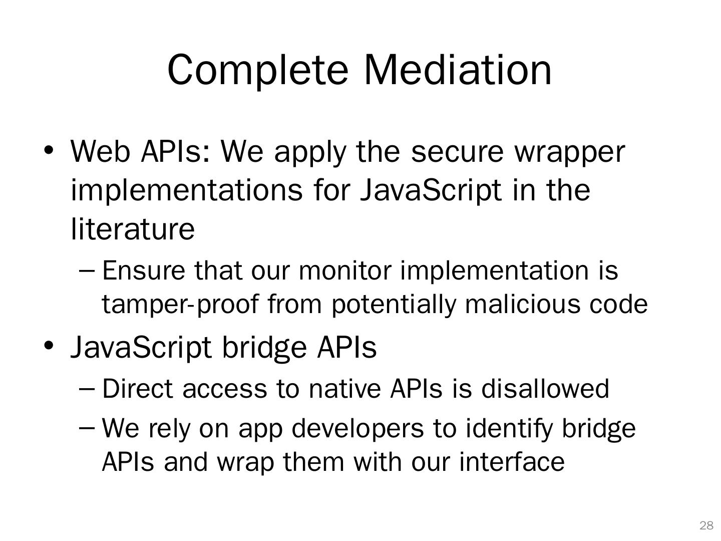 28 .Complete Mediation Web APIs: We apply the secure wrapper implementations for JavaScript in the literature Ensure that our monitor implementation is tamper-proof from potentially malicious code JavaScript bridge APIs Direct access to native APIs is disallowed We rely on app developers to identify bridge APIs and wrap them with our interface 27