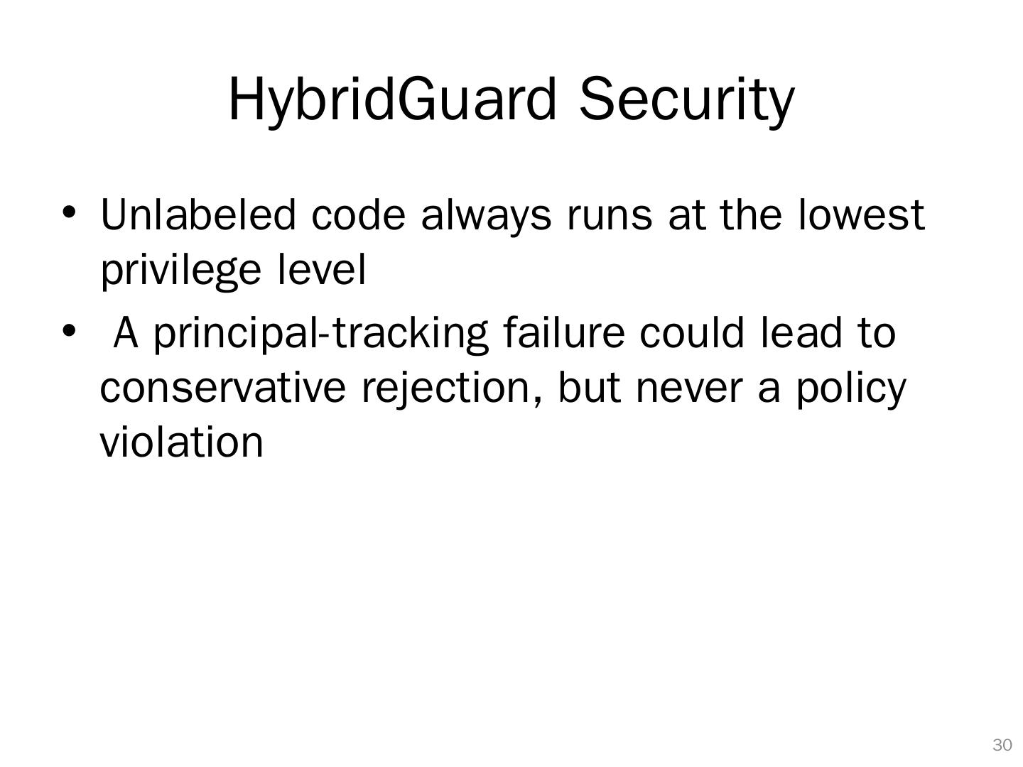 29 .HybridGuard Security 28 By lexical scoping Keeping original APIs with a protected lexical scope ; wraps all channels generating JS code at runtime Labeling all dynamically written content with the authoring principal