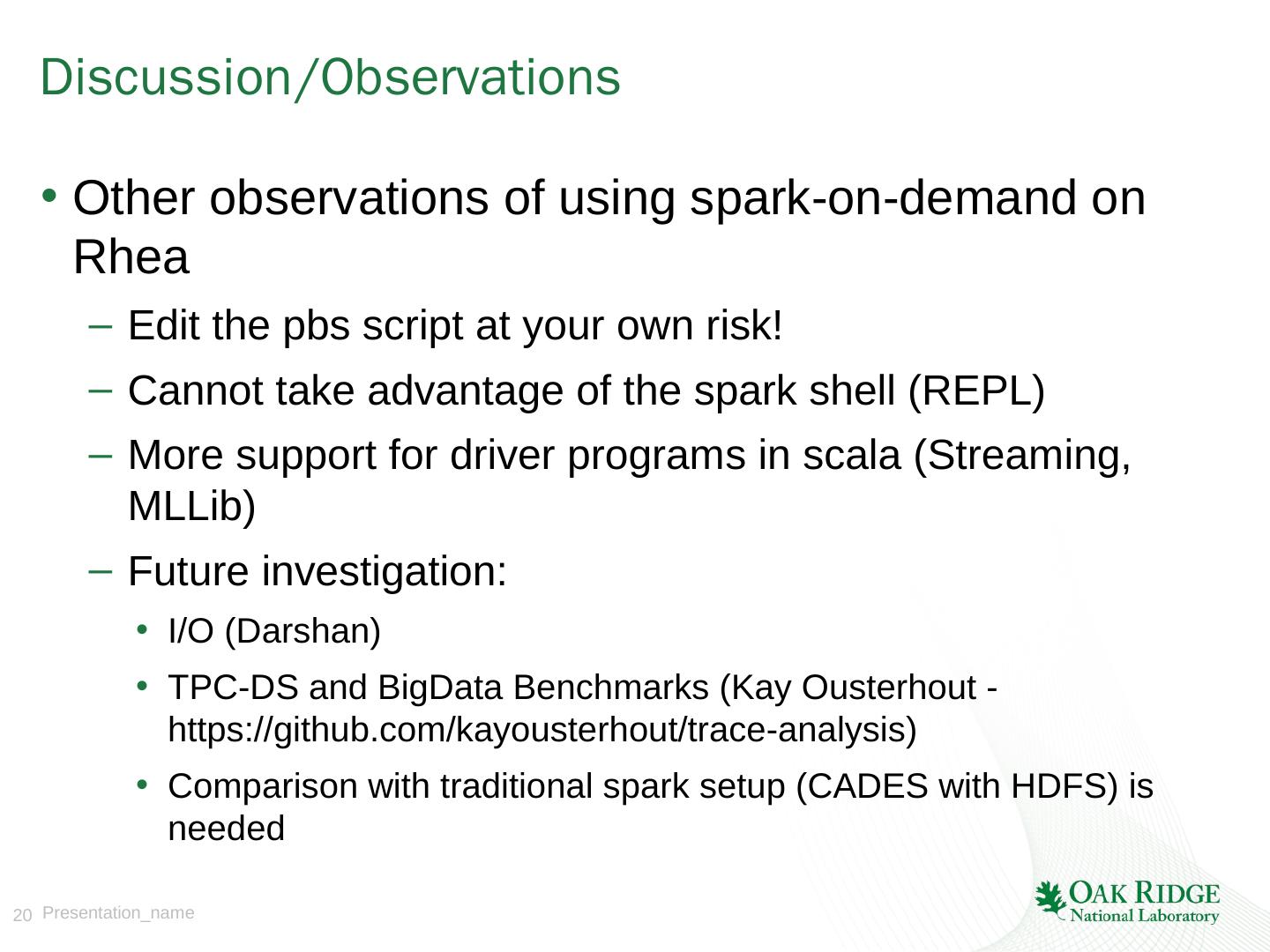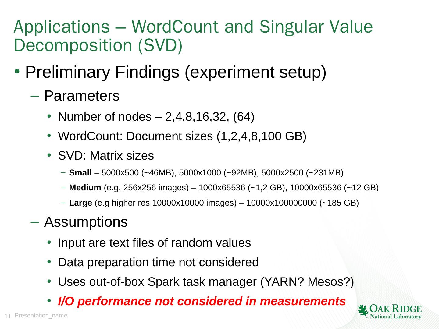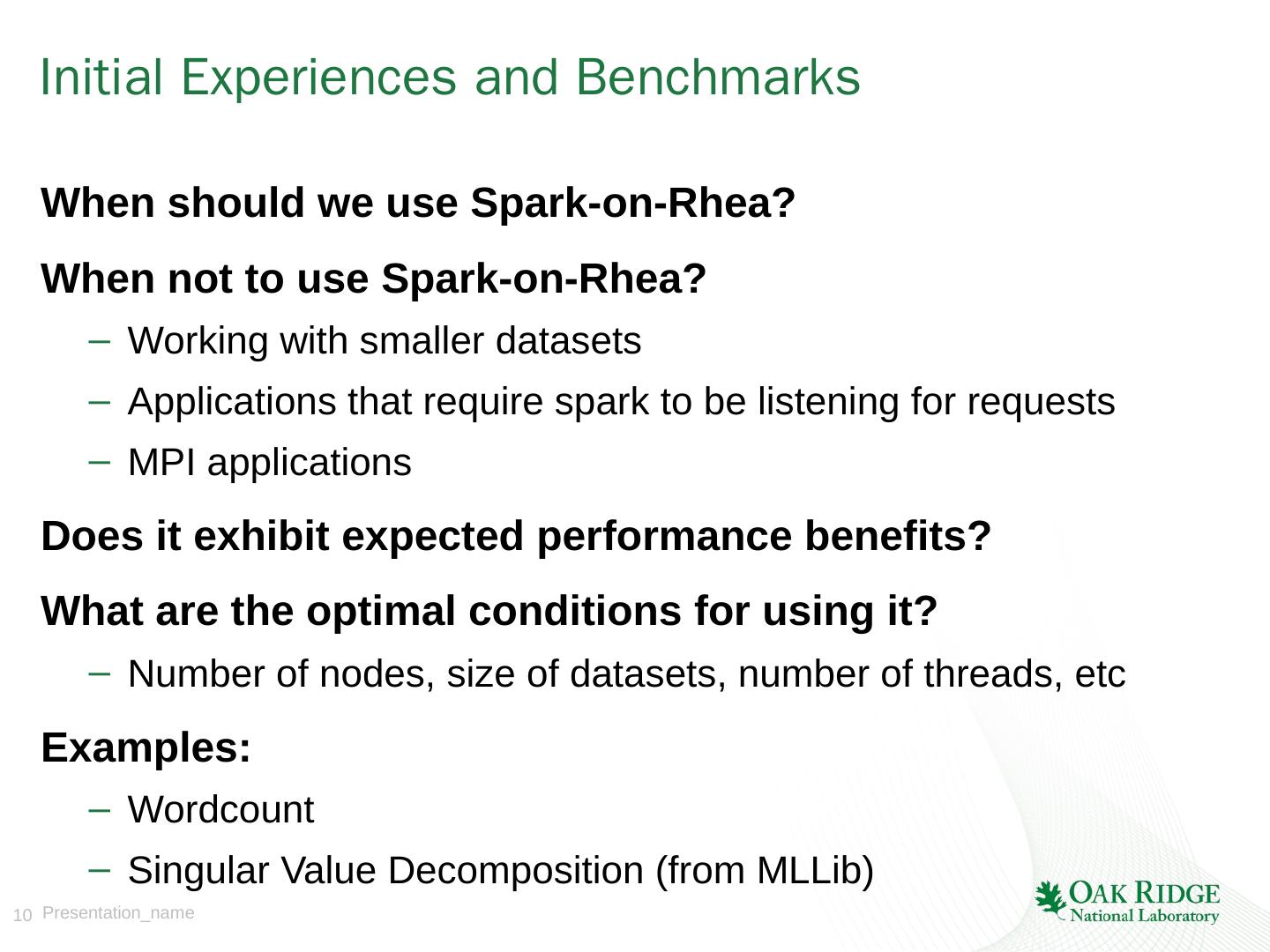 Spark-streaming; GraphX; MLLib. 10. Presentation_name. Initial Experiences and Benchmarks. When should we use Spark-on-Rhea? When not to use ...