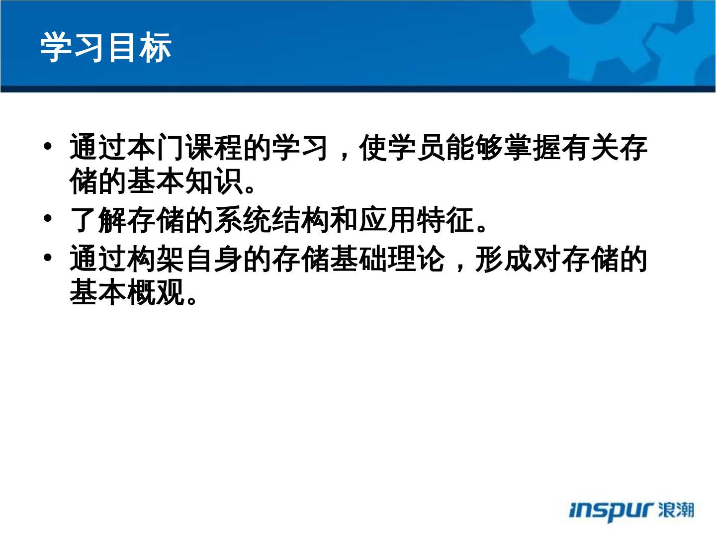 2 .学习目标 通过本门课程的学习,使学员能够掌握 有关 存储 的 基本知识。 了解 存储 的 系统结构和应用特征。 通过构架自身 的 存储 基础理论 ,形成 对 存储 的 基本概观。
