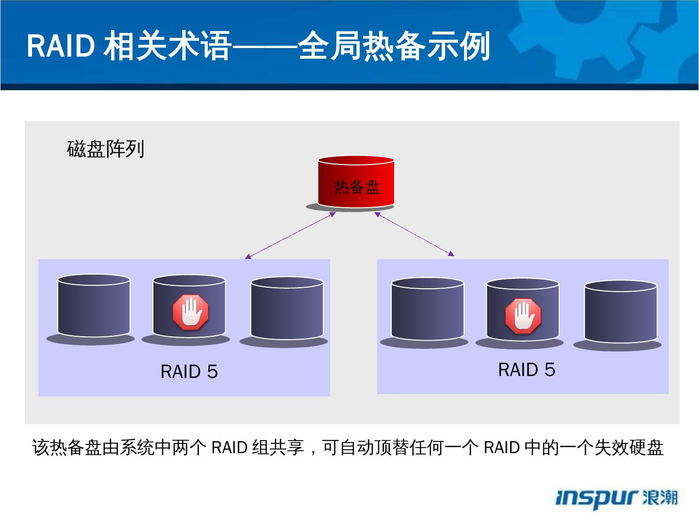 27 .RAID 相关术语 —— 全局热备示例 该热备盘由系统中两个 RAID 组共享,可自动顶替任何一个 RAID 中的一个失效硬盘 RAID 5 RAID 5 磁盘阵列 热备盘