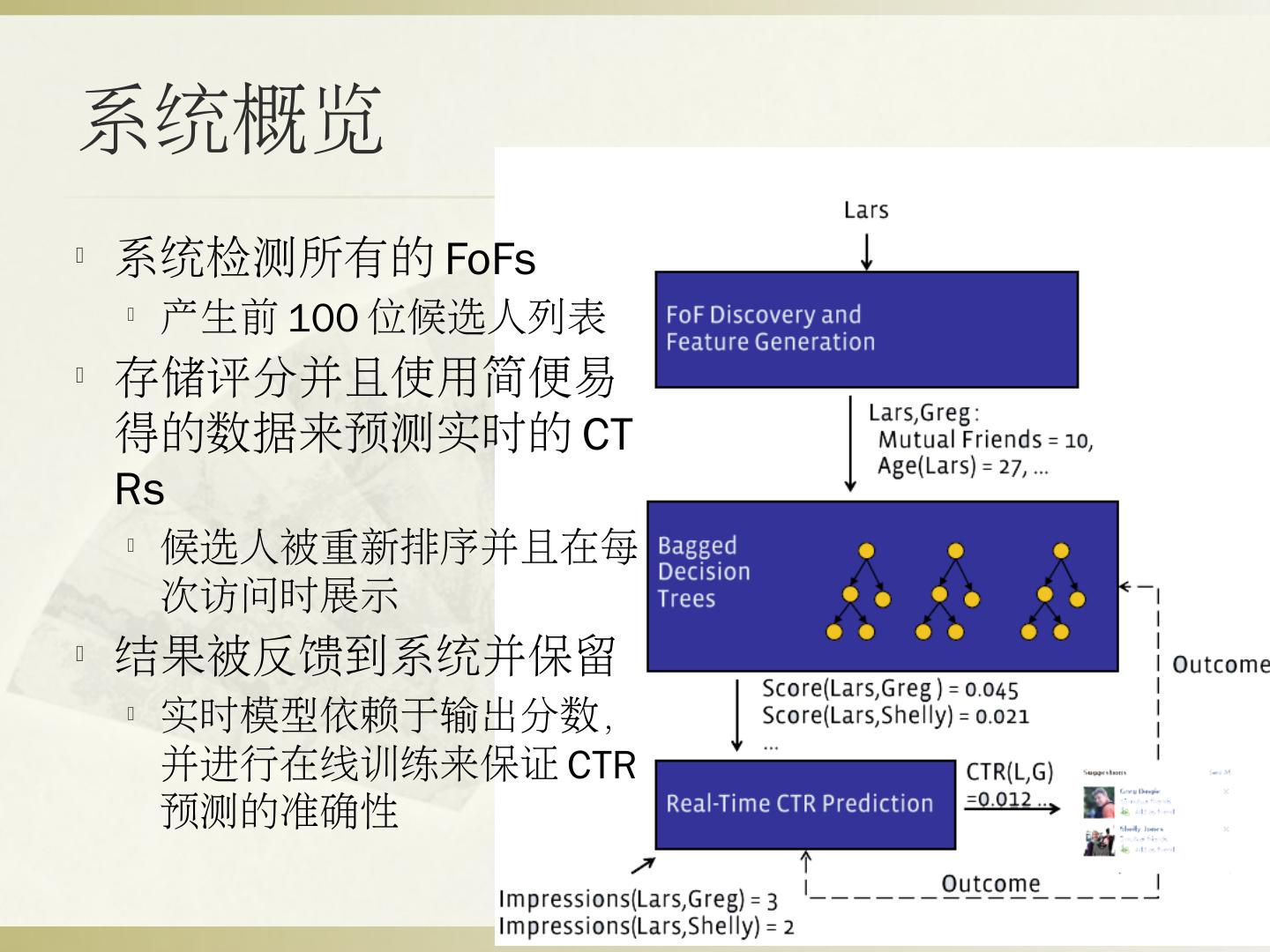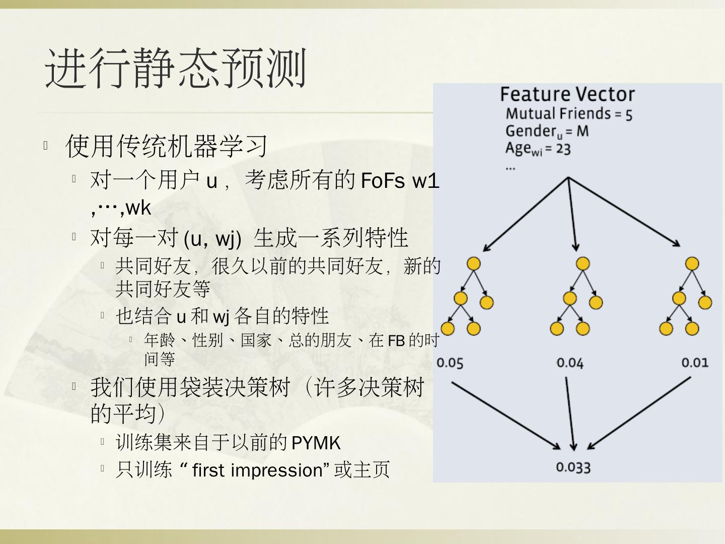 共同好友,很久以前的共同好友,新的共同好友等; 也结合u和wj各自的特性. 年龄、性别、国家、总的朋友、在FB的时间等. 我们使用袋装决策树(许多决策树的平均).
