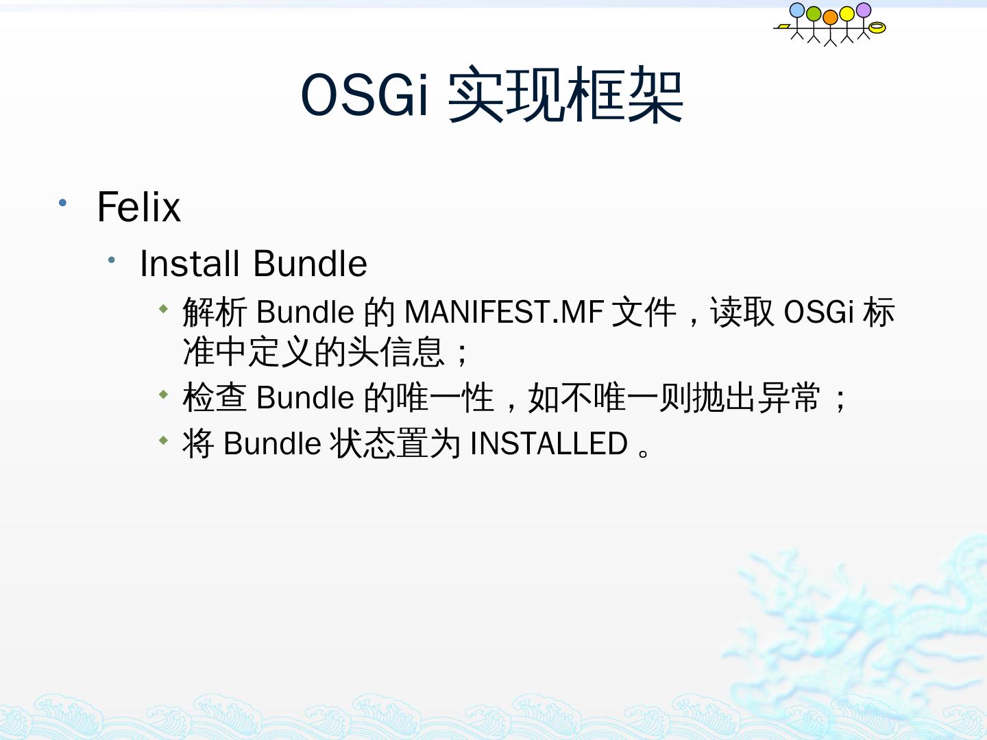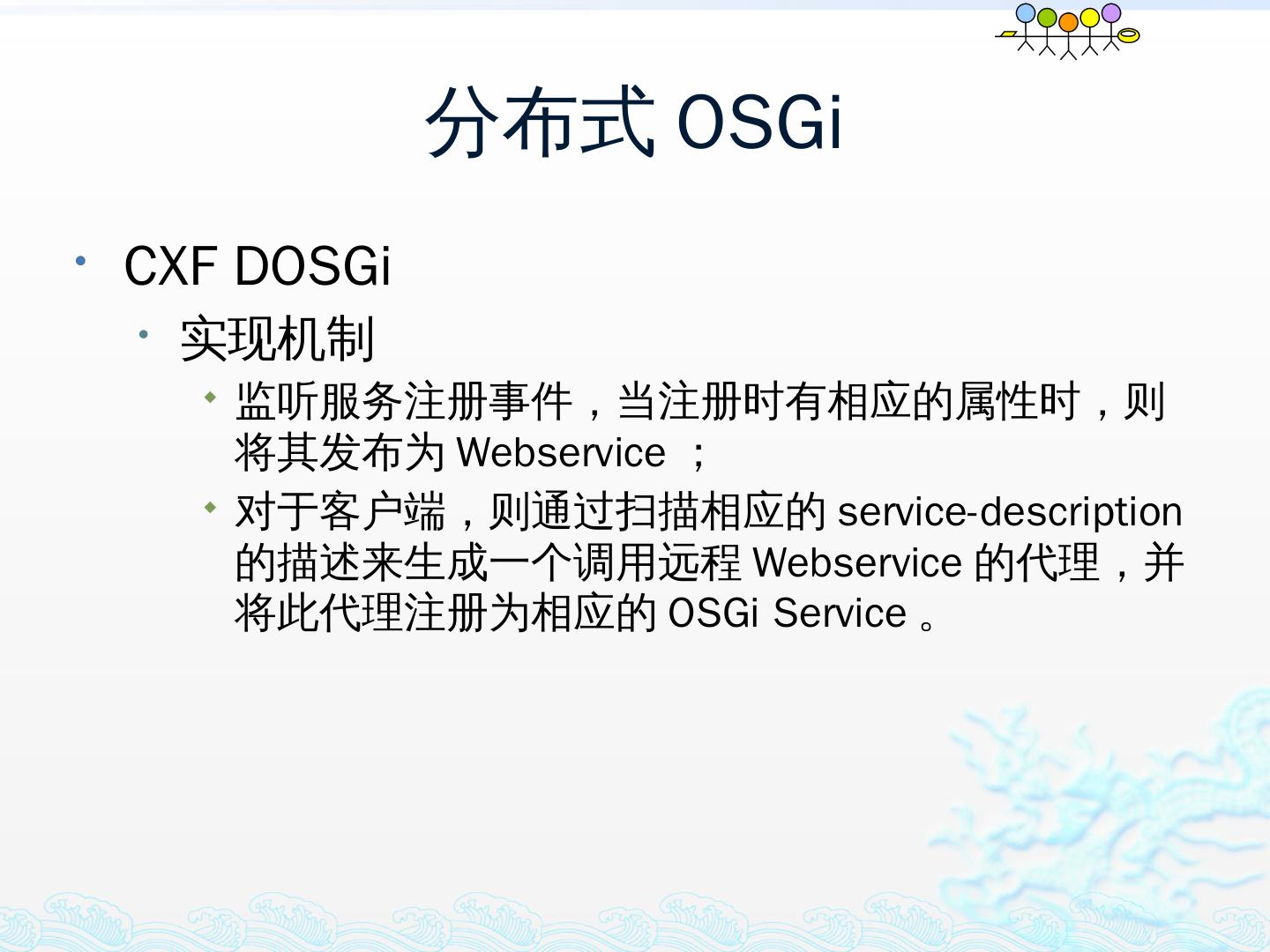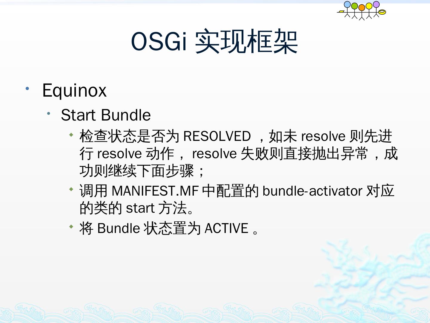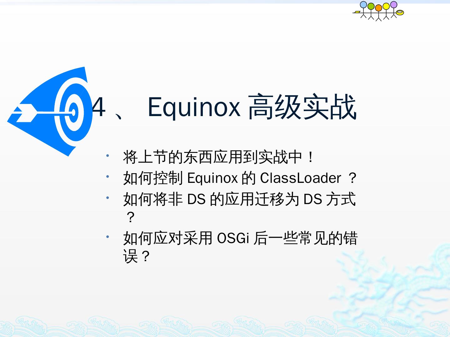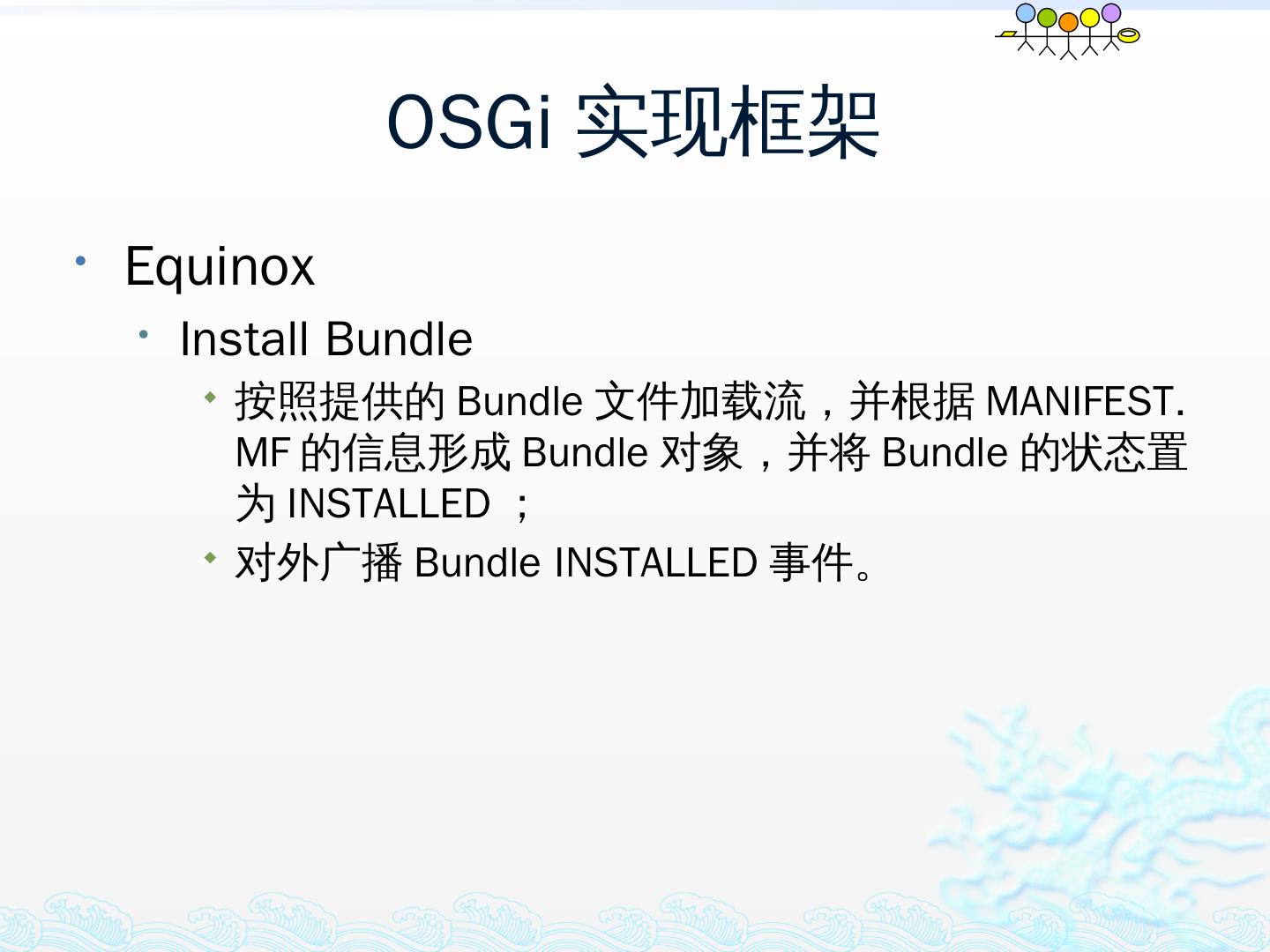 学习OSGi规范R4.1,掌握OSGi核心概念;; 学习OSGi R4实现框架的实现机制,以更好的使用这些框架;; 学习基于Equinox开发OSGi Based的应用;; 扩展Equinox,更 ...