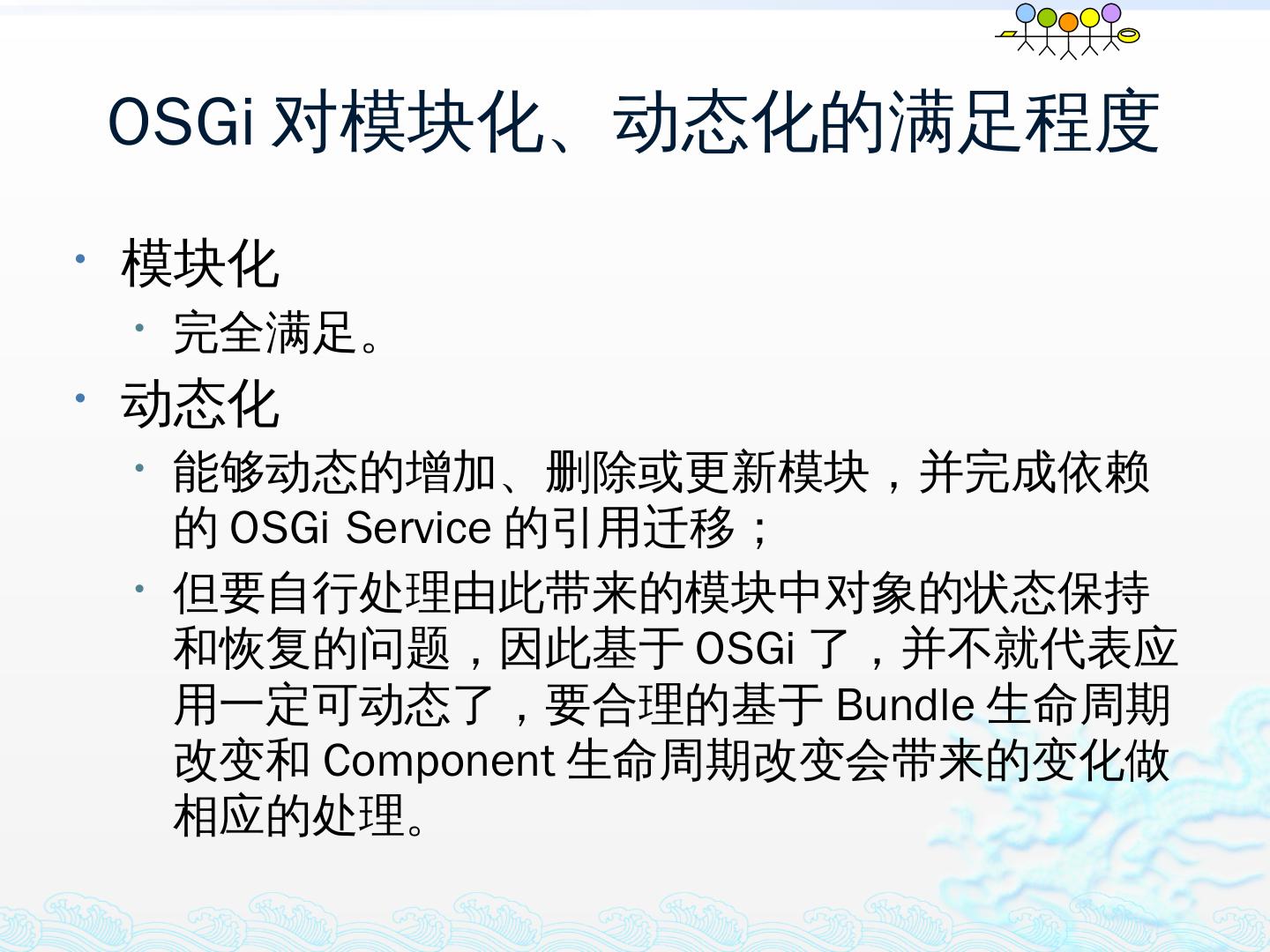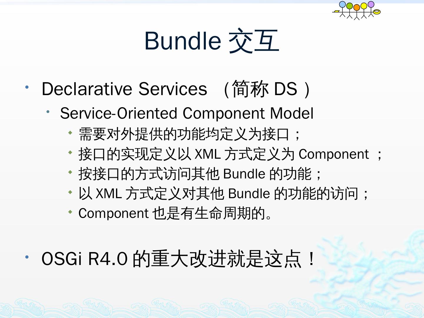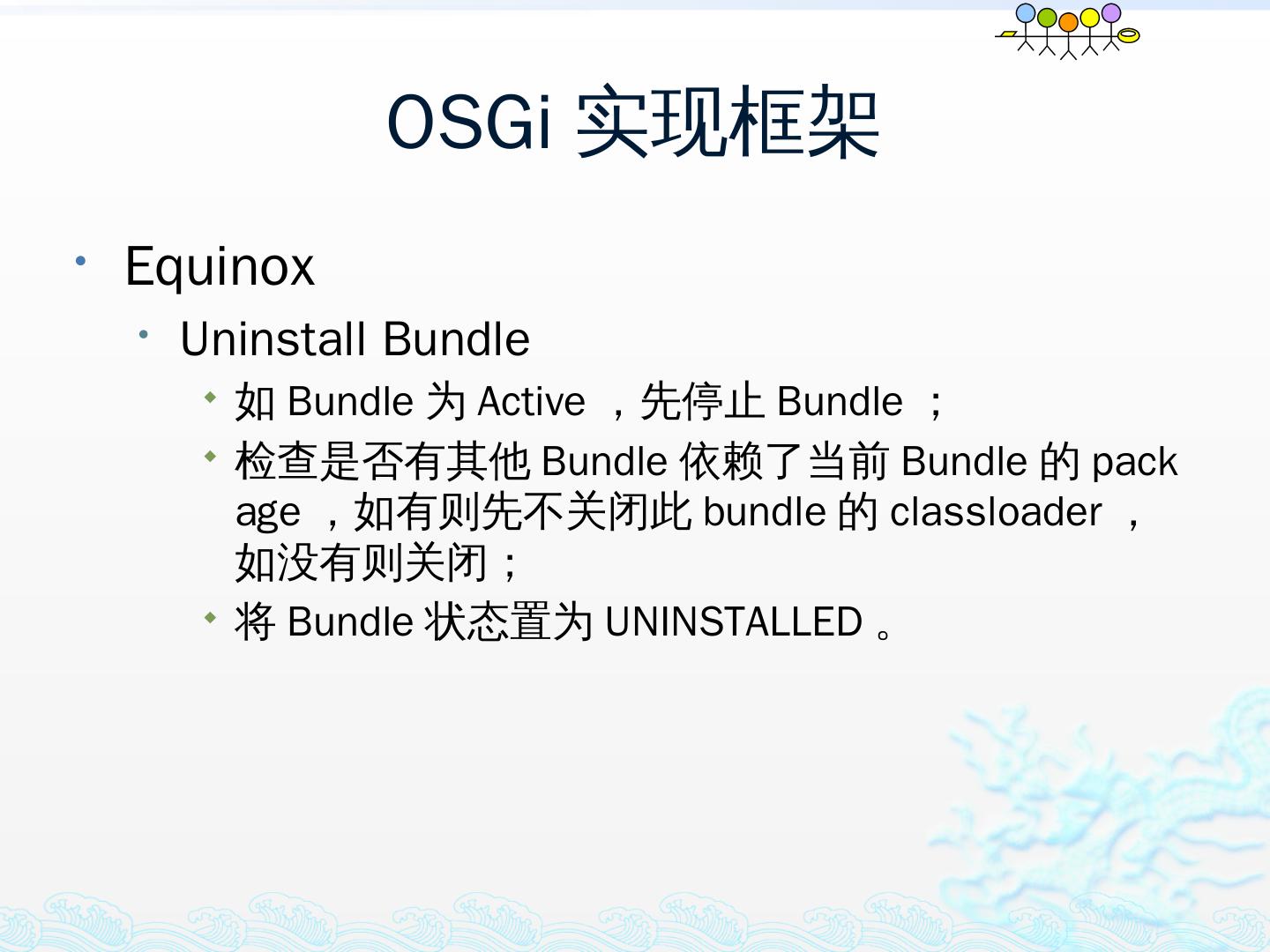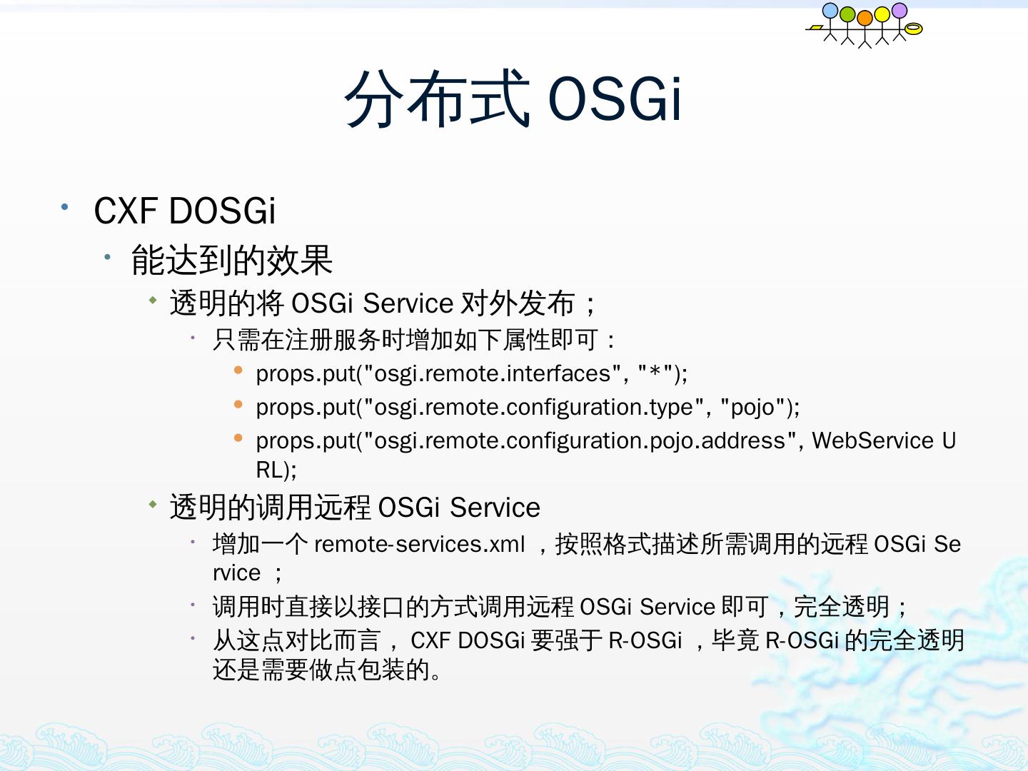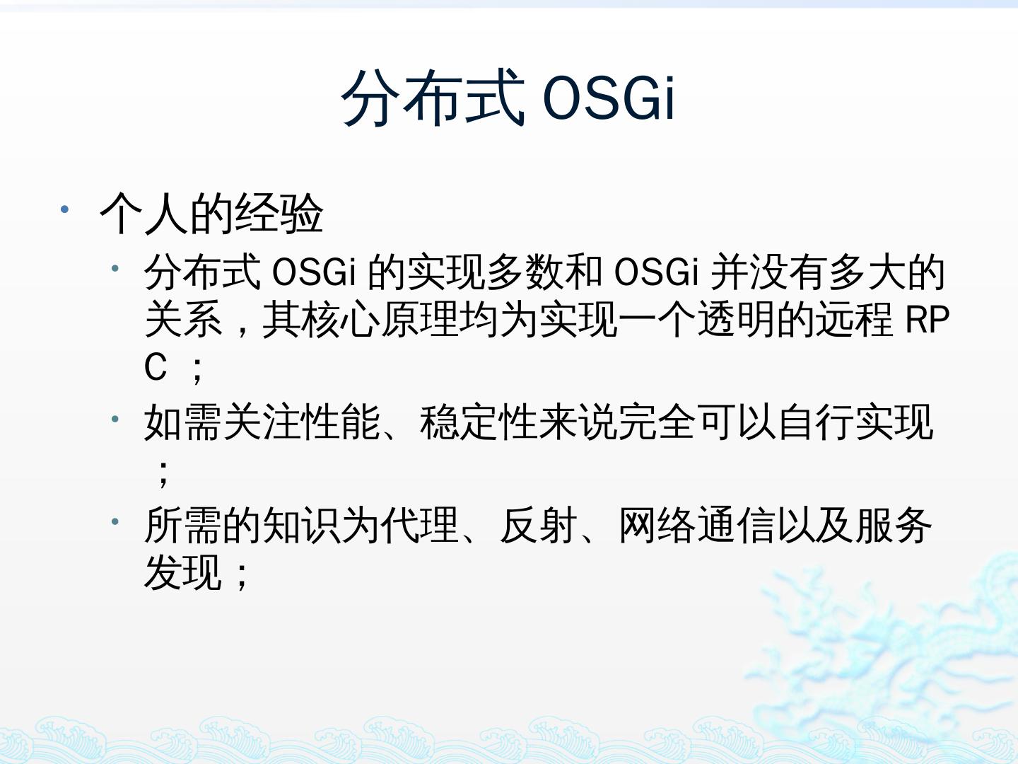 学习OSGi规范R4.1,掌握OSGi核心概念;; 学习OSGi R4实现框架的实现机制,以更好的使用这些框架;; 学习基于Equinox开发OSGi Based的应用;; 扩展Equinox,更 ...