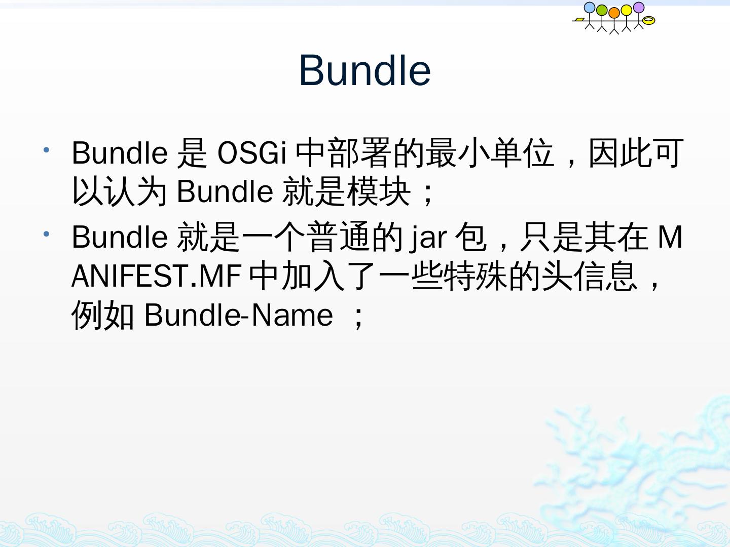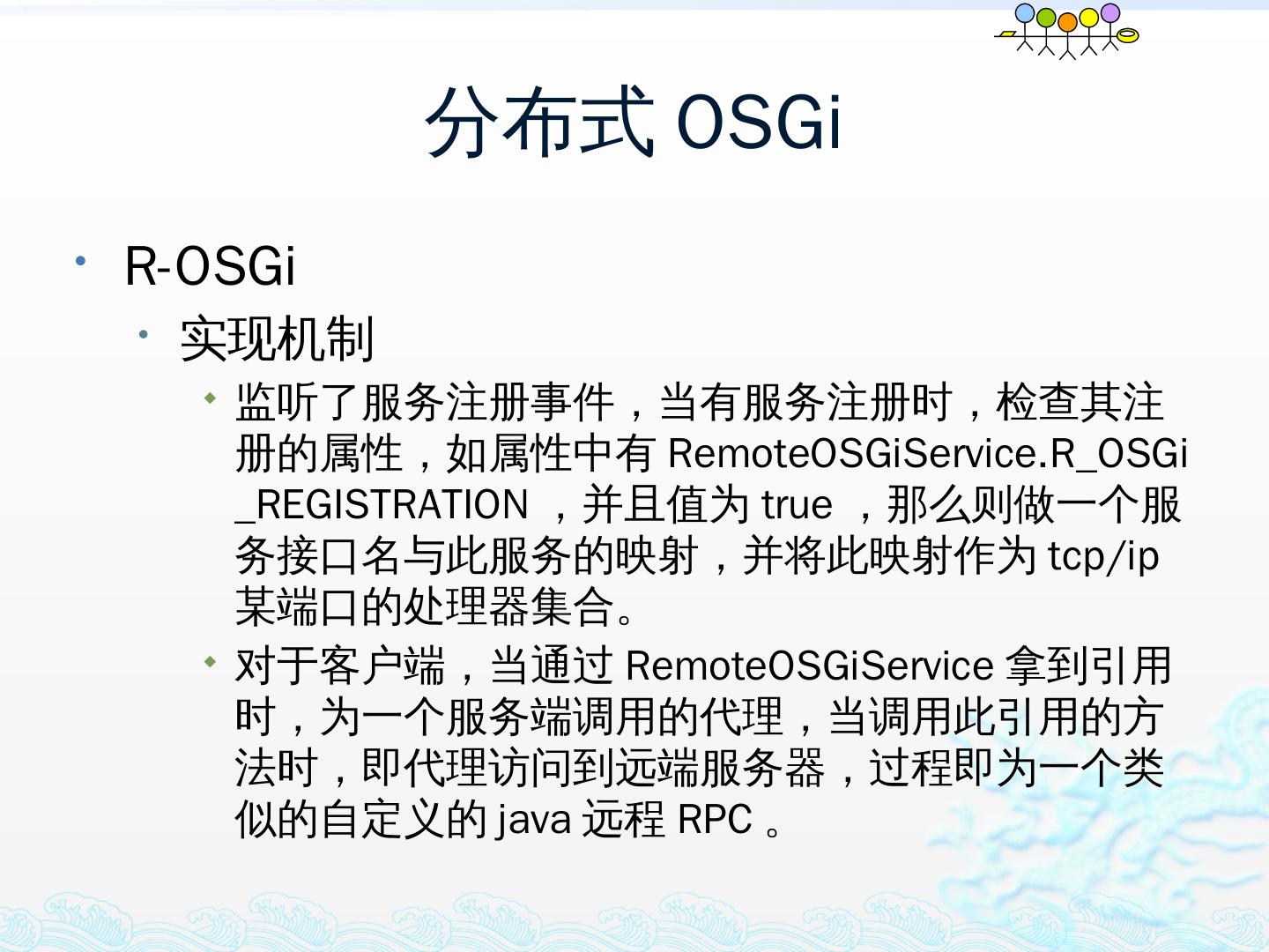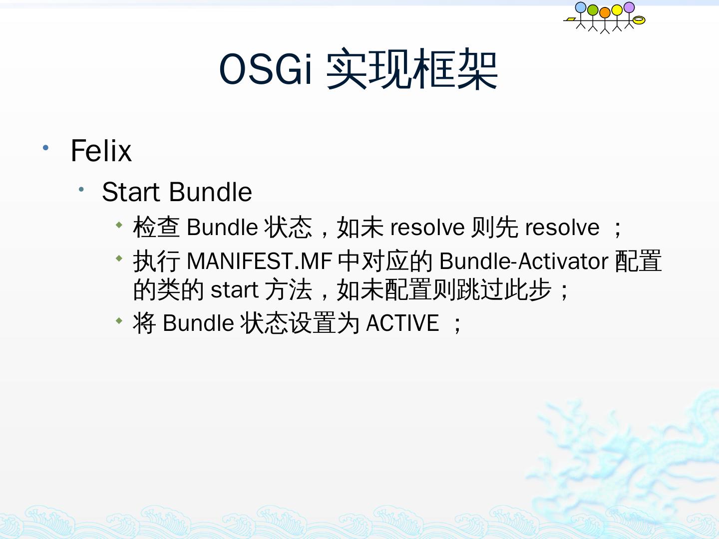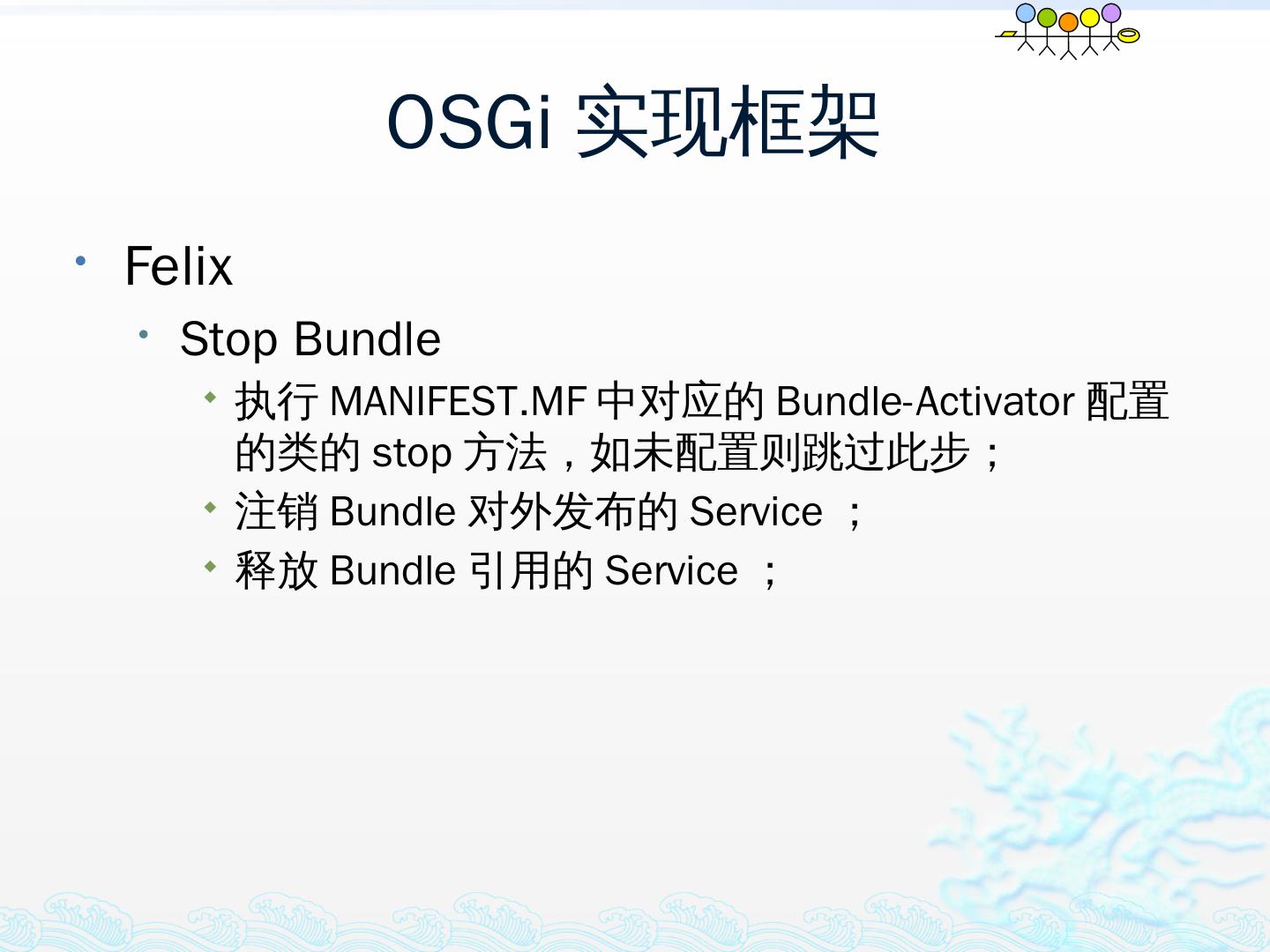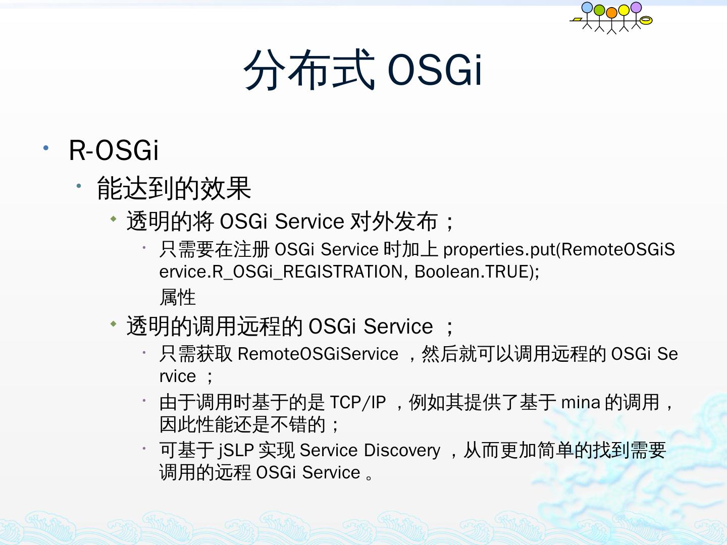 学习OSGi规范R4.1,掌握OSGi核心概念;; 学习OSGi R4实现框架的实现机制,以更好的使用这些框架;; 学习基于Equinox开发OSGi Based的应用;; 扩展Equinox,更 ...