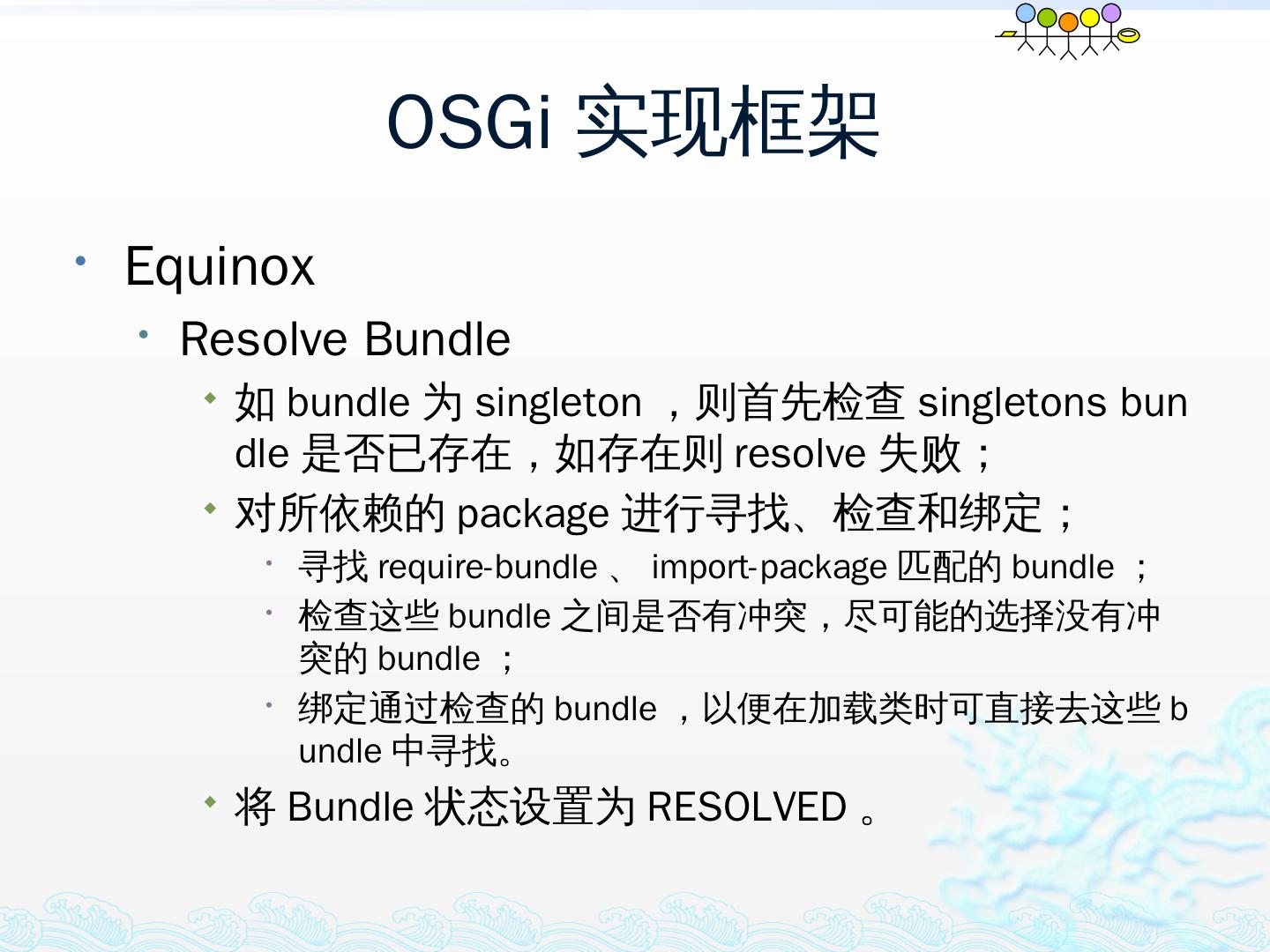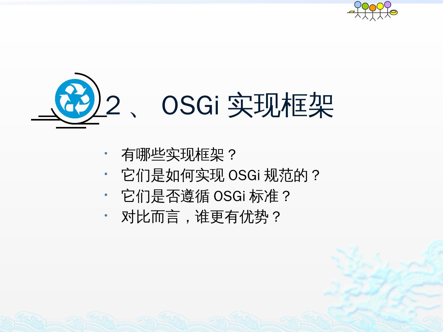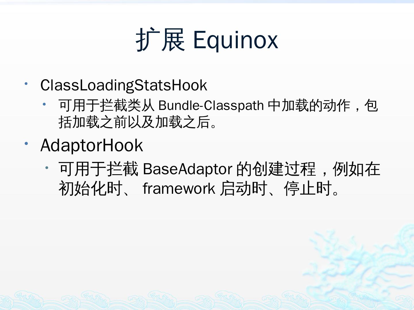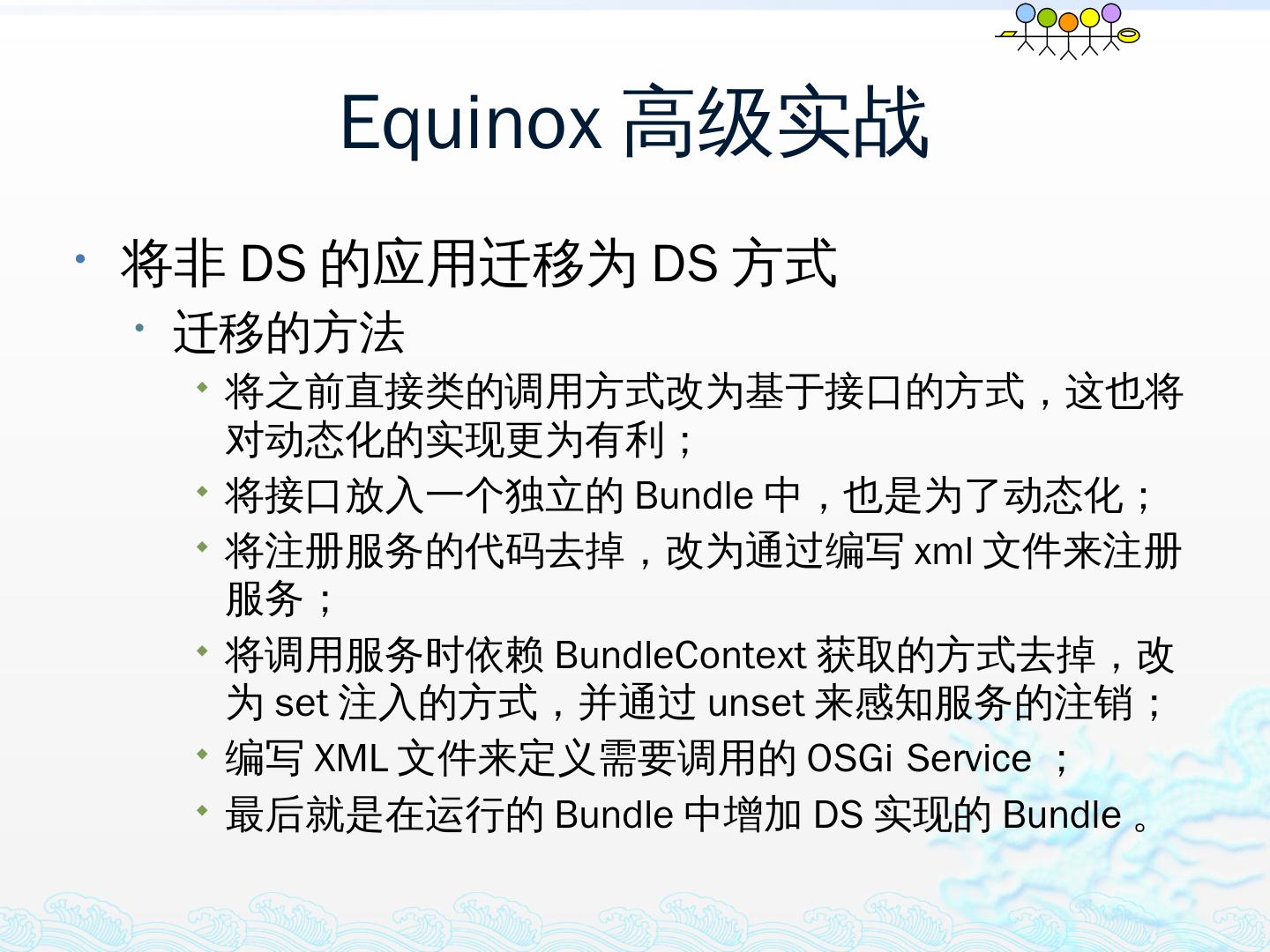 学习OSGi规范R4.1,掌握OSGi核心概念;; 学习OSGi R4实现框架的实现机制,以更好的使用这些框架;; 学习基于Equinox开发OSGi Based的应用;; 扩展Equinox,更 ...