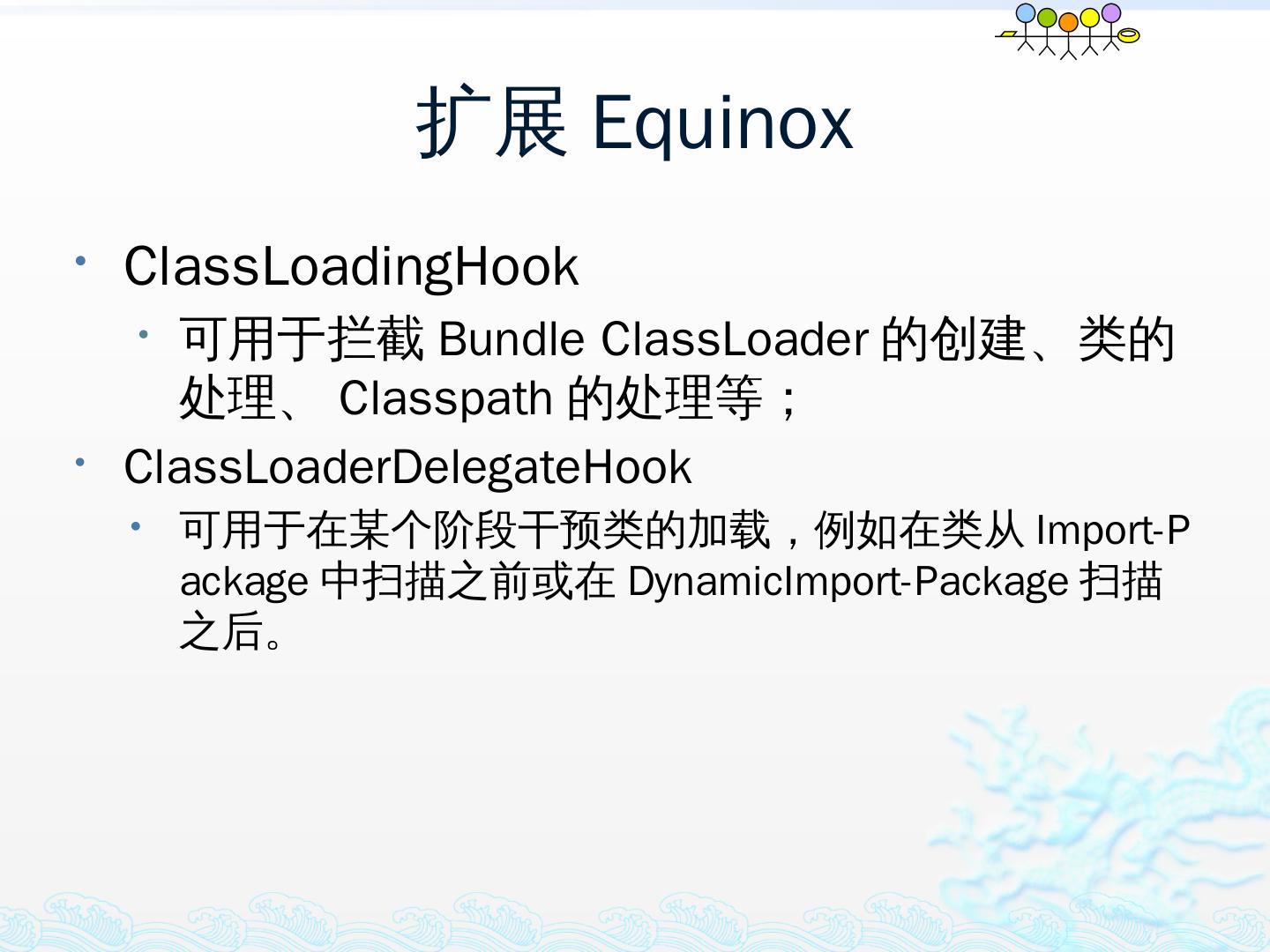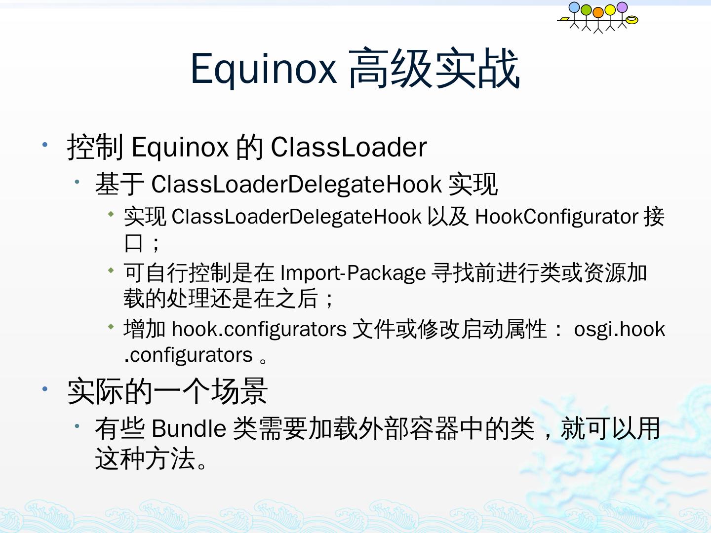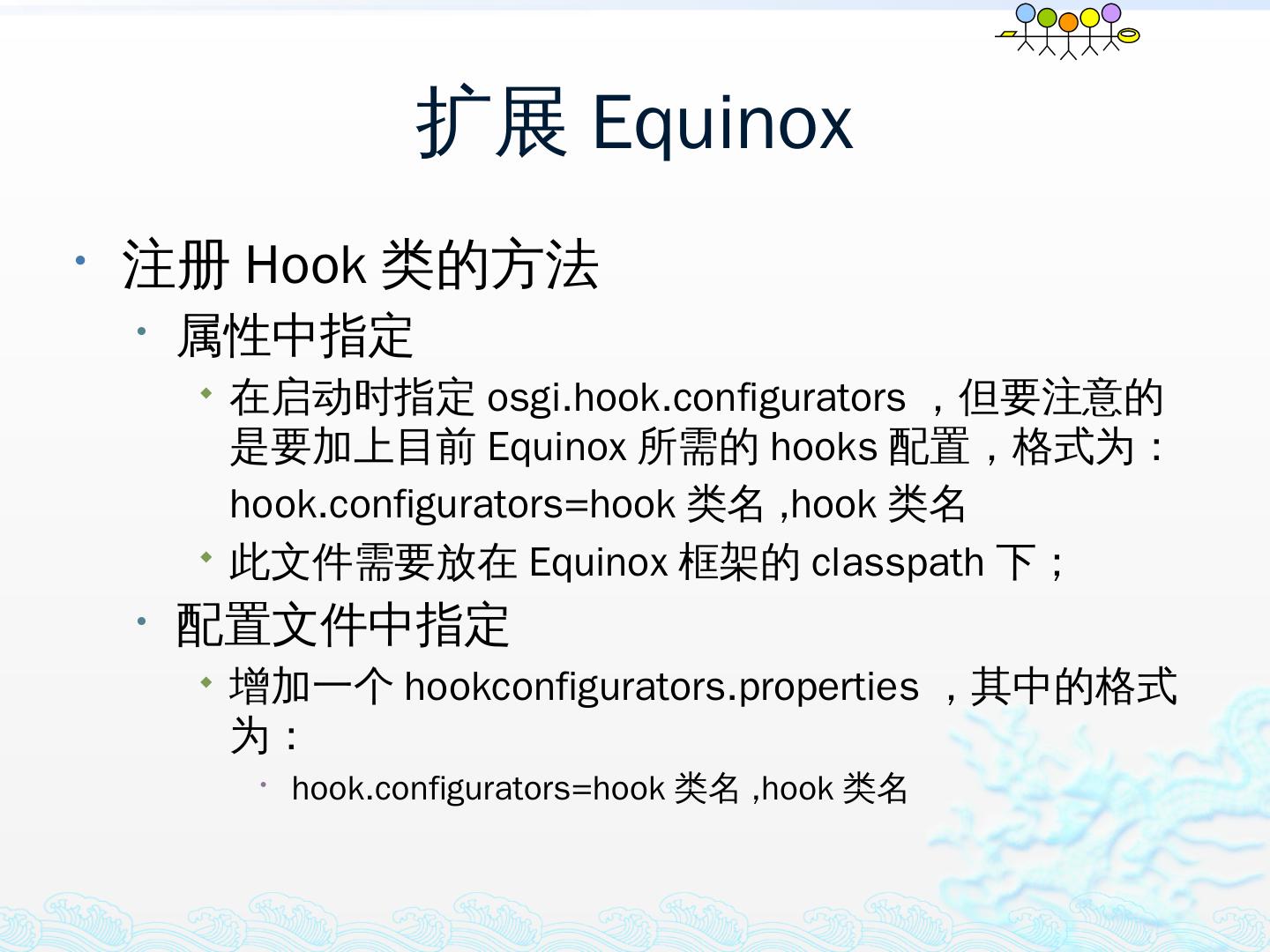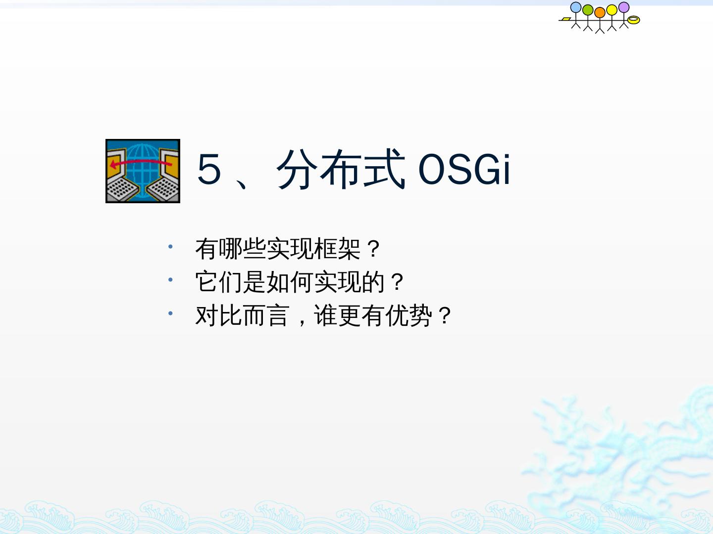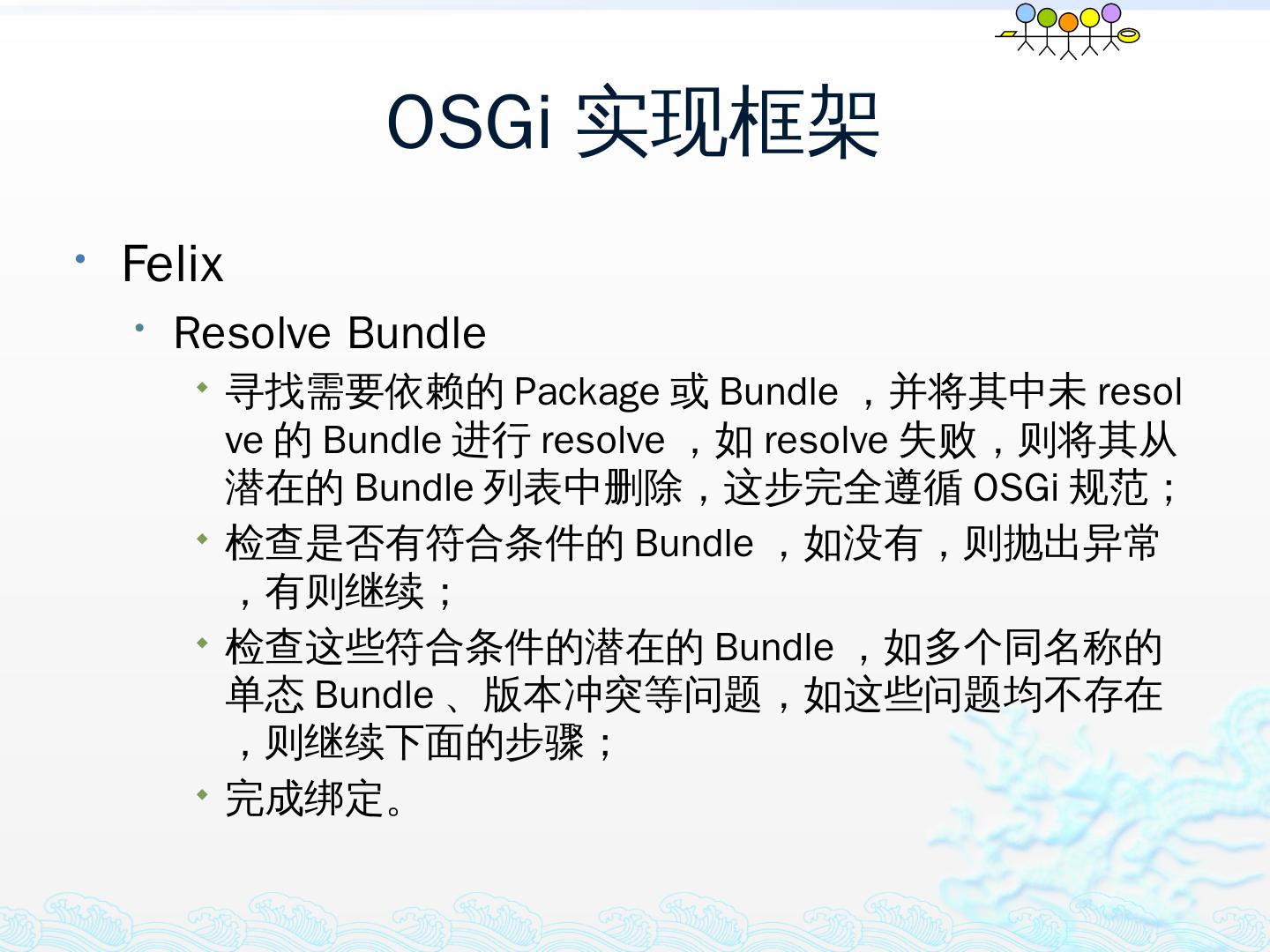 学习OSGi规范R4.1,掌握OSGi核心概念;; 学习OSGi R4实现框架的实现机制,以更好的使用这些框架;; 学习基于Equinox开发OSGi Based的应用;; 扩展Equinox,更 ...