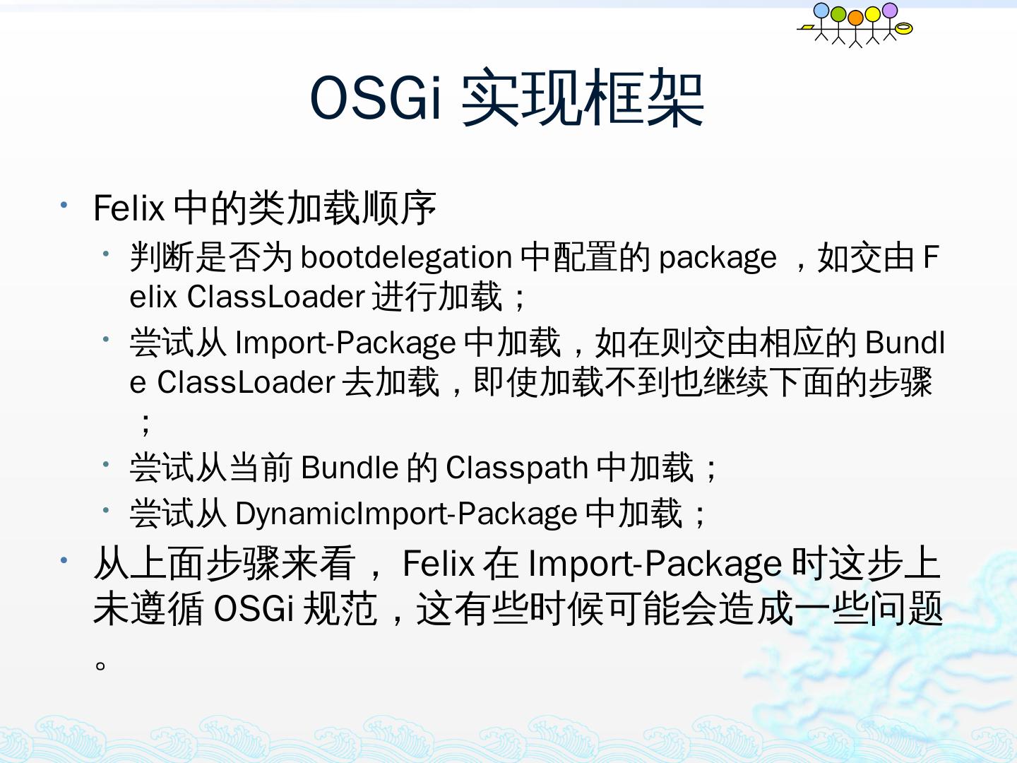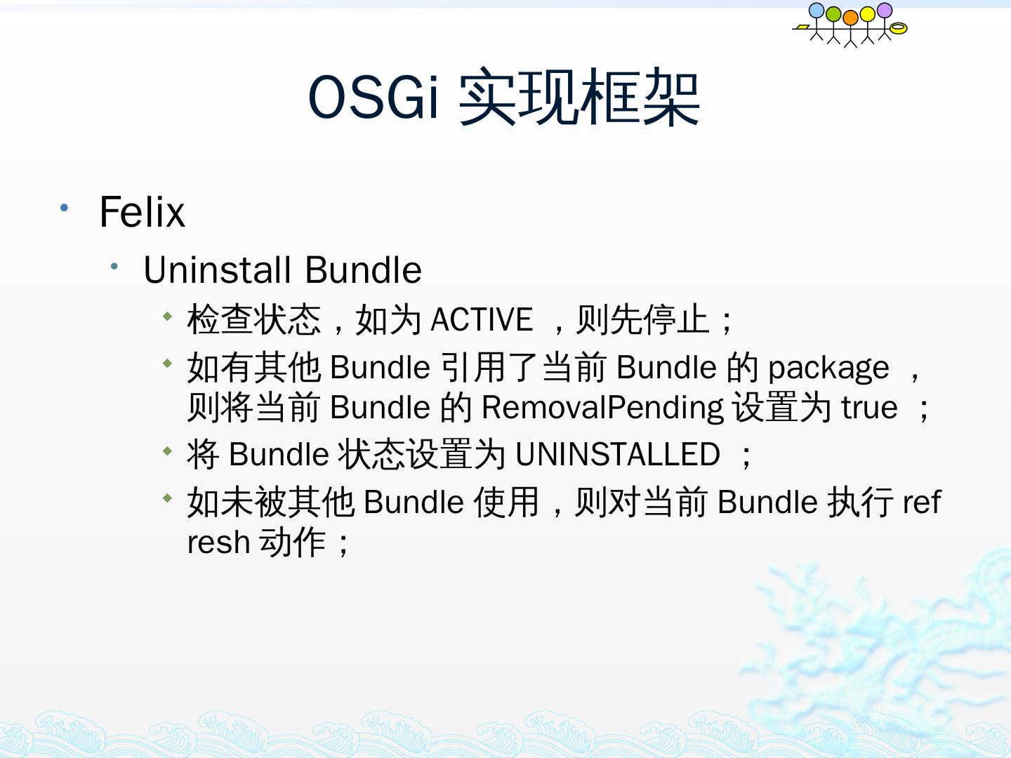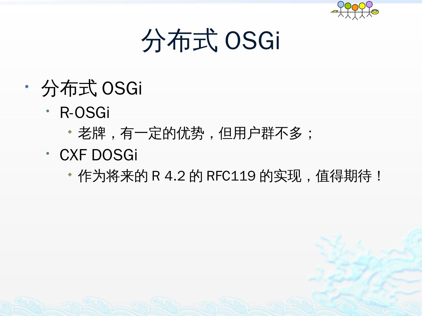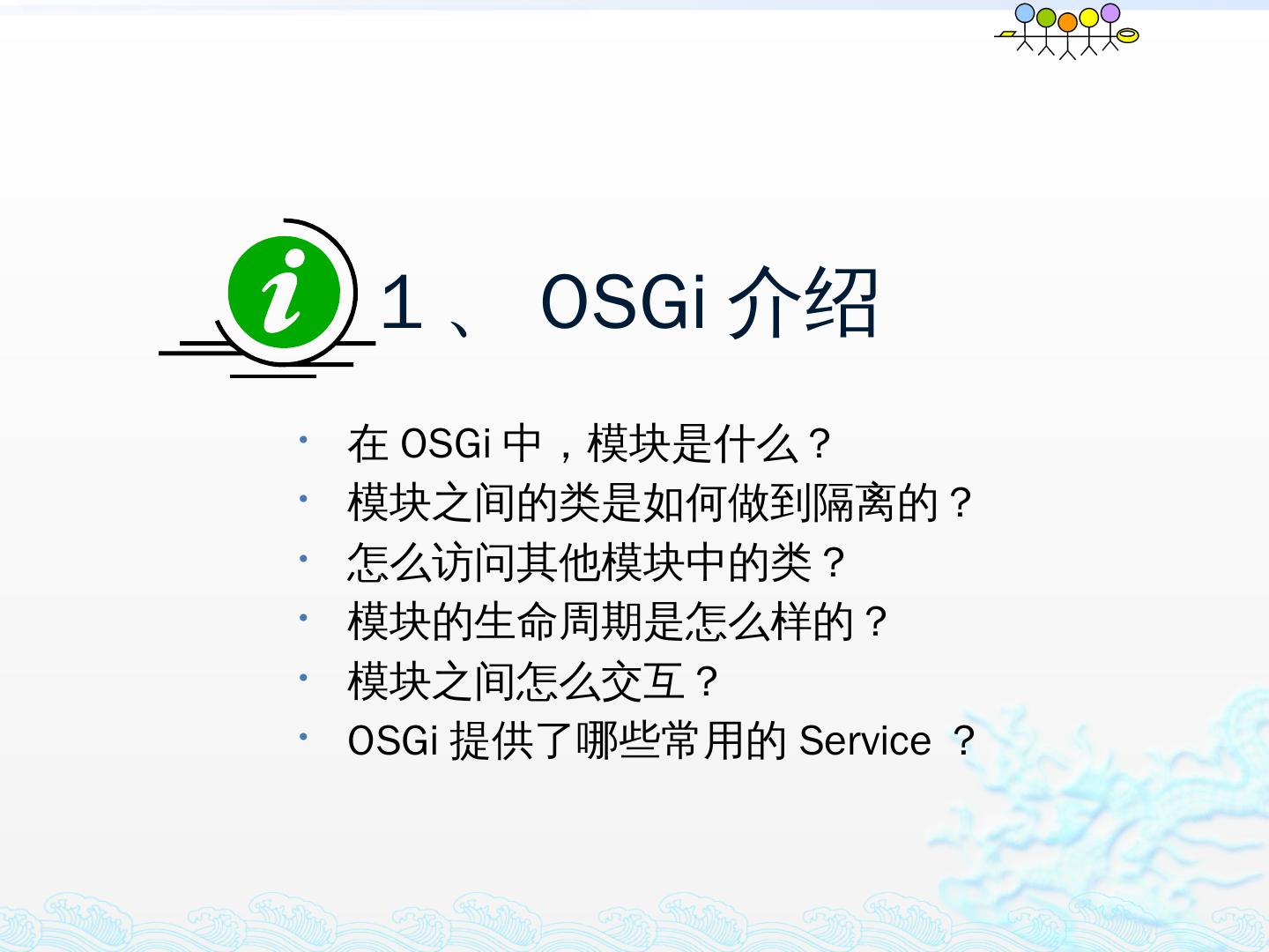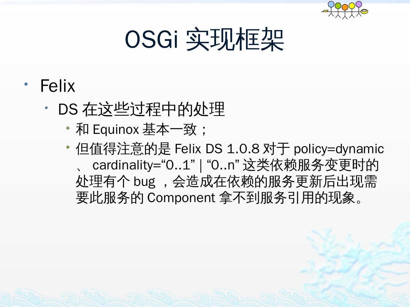 学习OSGi规范R4.1,掌握OSGi核心概念;; 学习OSGi R4实现框架的实现机制,以更好的使用这些框架;; 学习基于Equinox开发OSGi Based的应用;; 扩展Equinox,更 ...