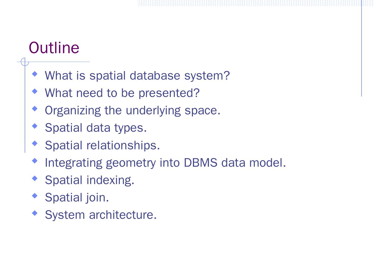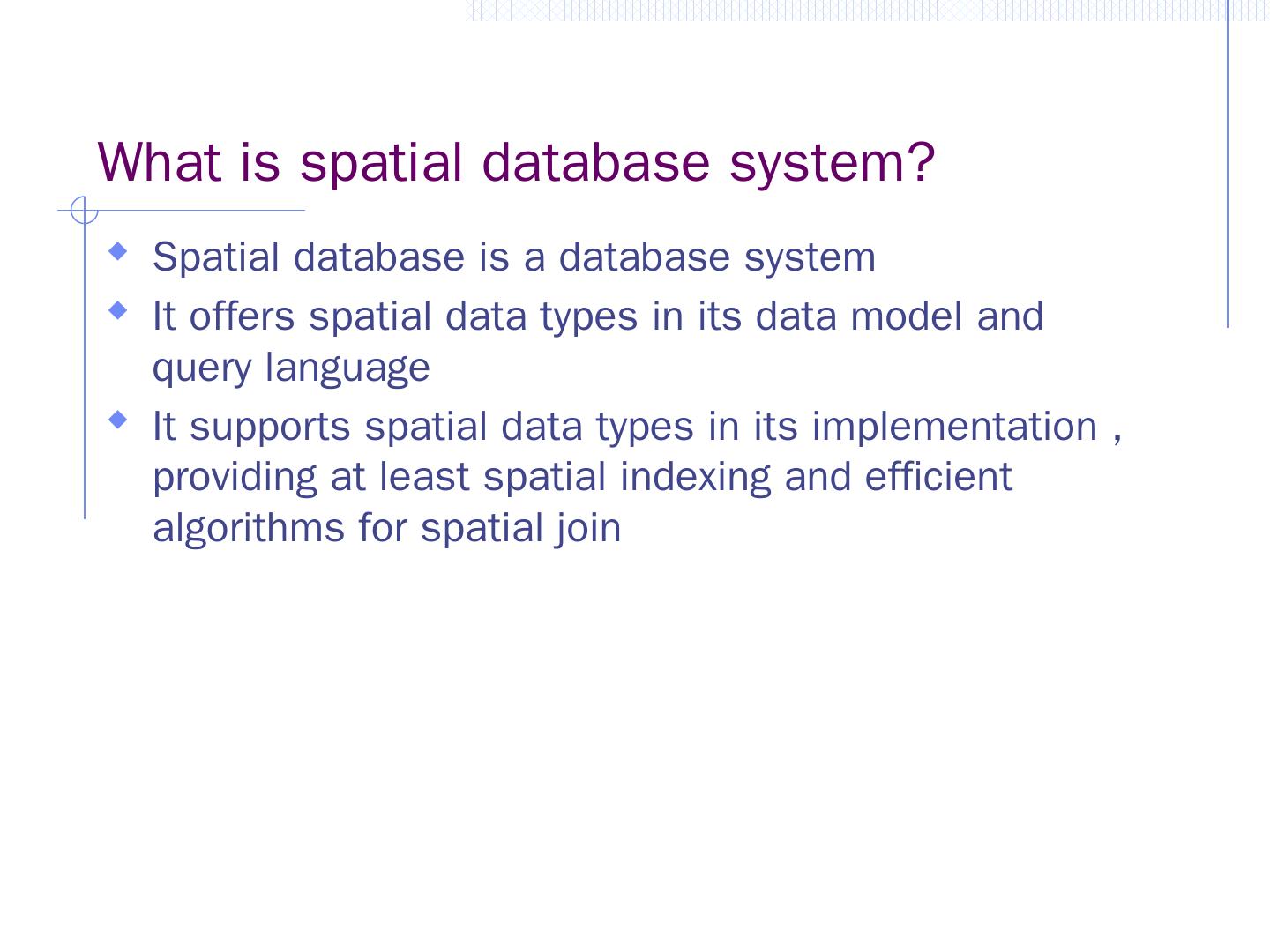 Spatial database is a database system; It offers spatial data types in its data model ... providing at least spatial indexing and efficient algorithms for spatial join.