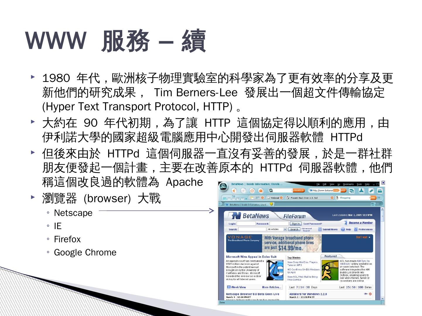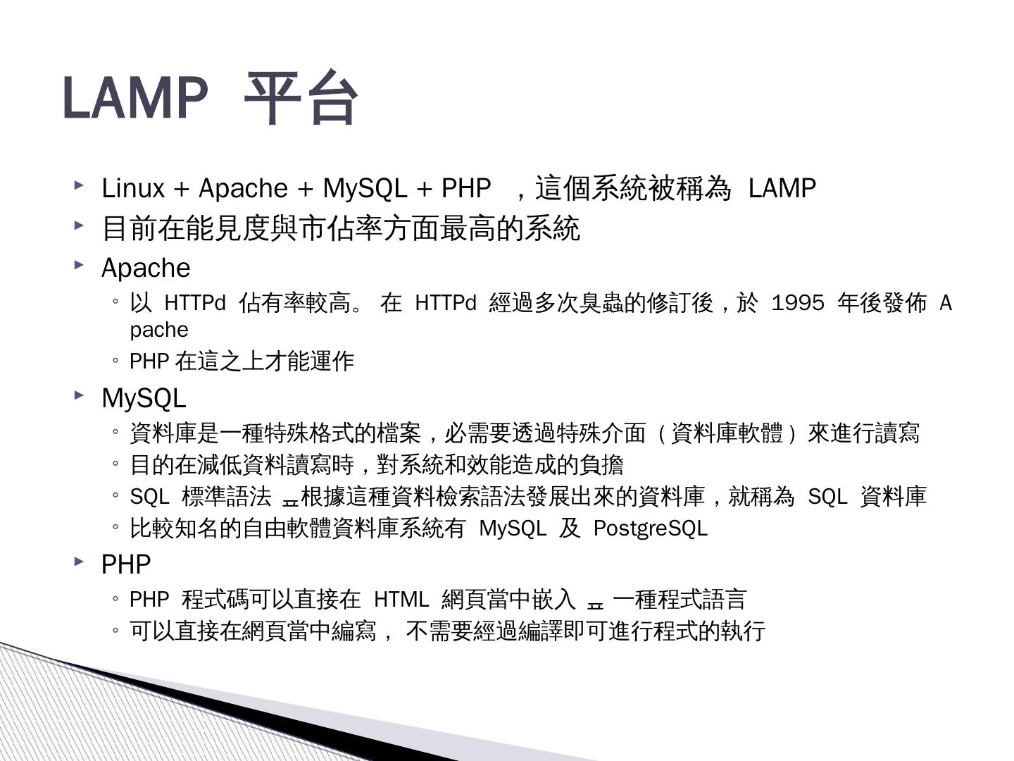 Apache ::自由軟體,可以在任何作業系統上面安裝。 IIS :: Windows 家族所開發, 僅能在Windows 作業系統上面安裝與執行。 僅提供使用者瀏覽的單向靜態網頁.