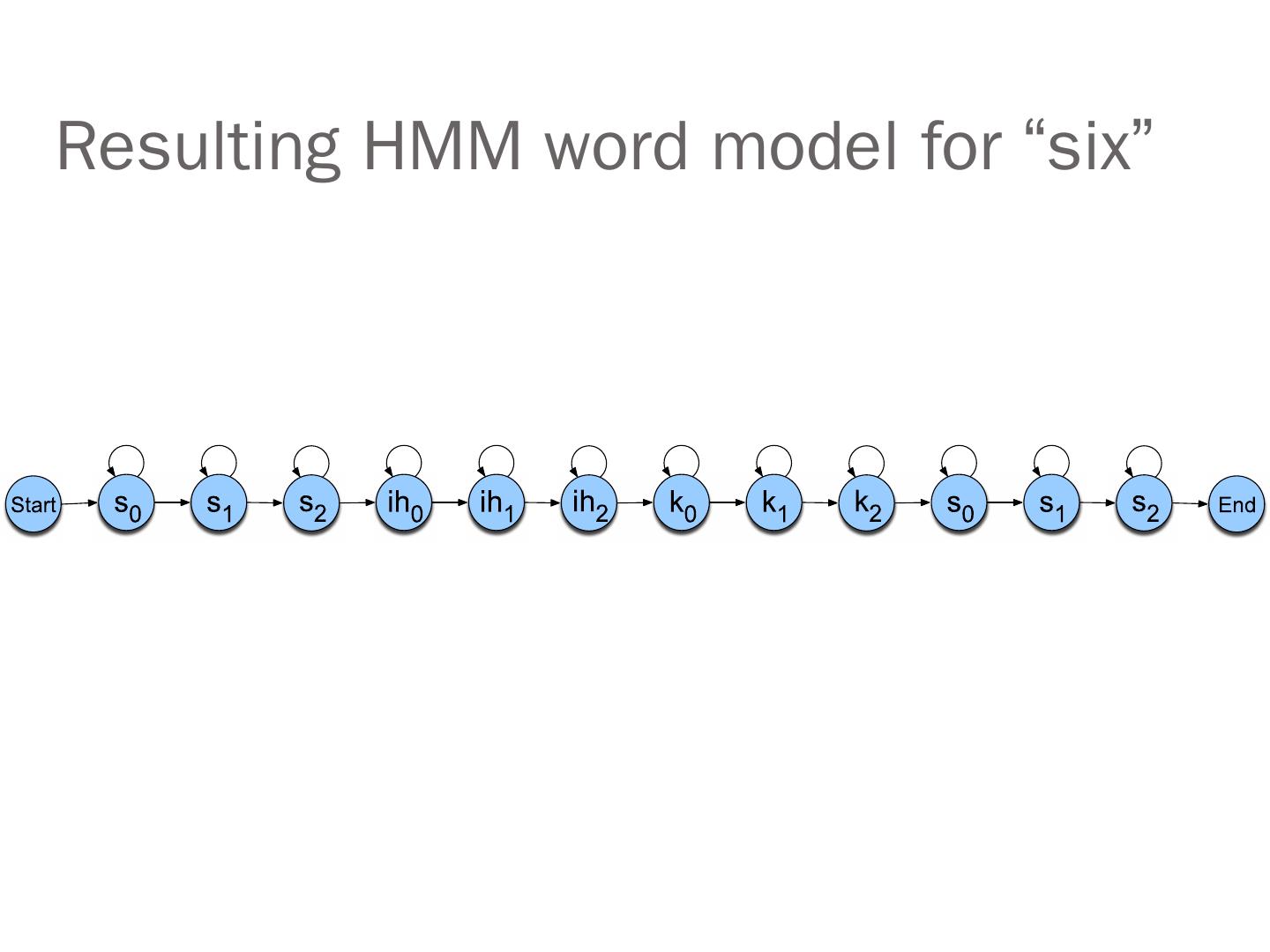 ay. k. Each phone has 3. subphones. Resulting HMM word model for. “ six. ” HMM for the digit recognition task. Markov chain for weather. Markov chain for words.
