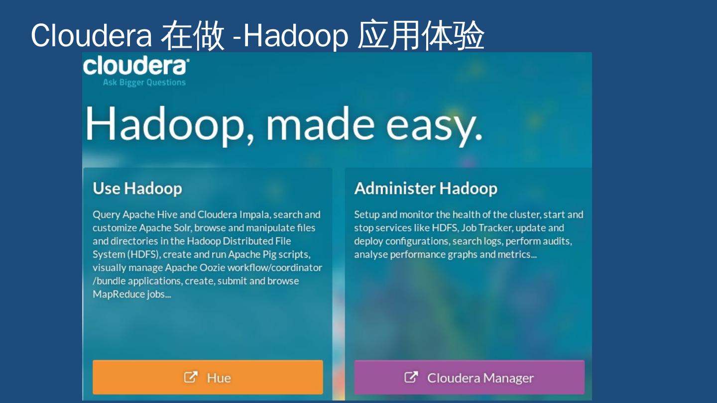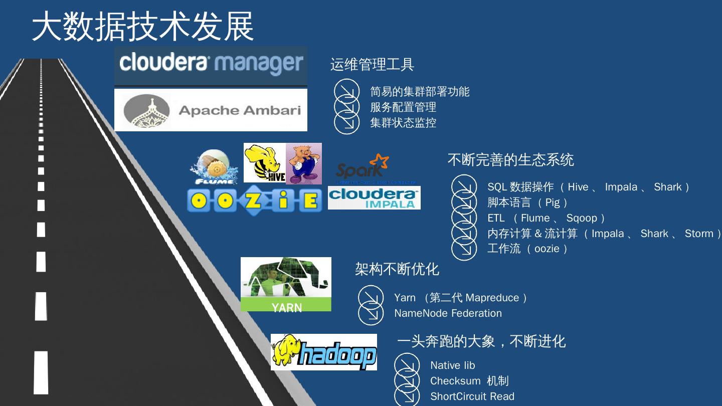 SQL数据操作(Hive、Impala、Shark); 脚本语言(Pig); ETL(Flume、Sqoop); 内存计算&流计算(Impala、Shark、Storm); 工作流(oozie). 运维管理工具. 简易的集群 ...