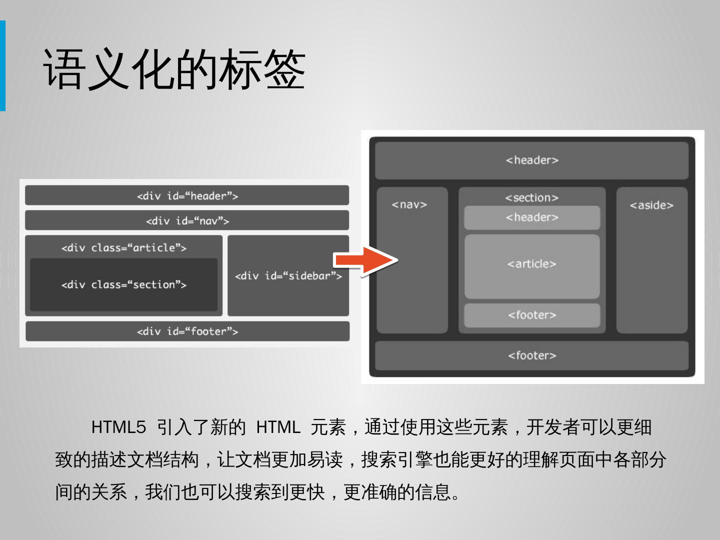 语义. 语义化的标签. HTML5 引入了新的HTML 元素,通过使用这些元素,开发者可以 .... 因为虽然基本代码是一样的,但是你仍然需要为每个平台分别编译应用程序。