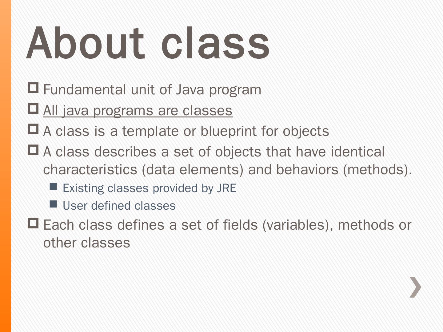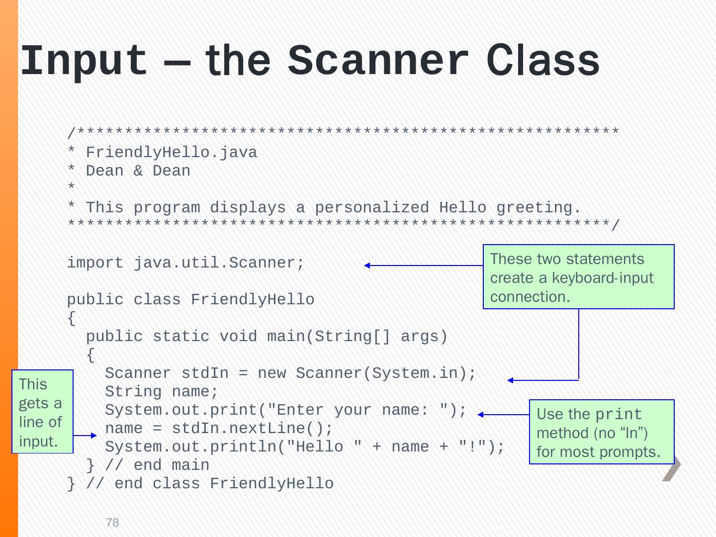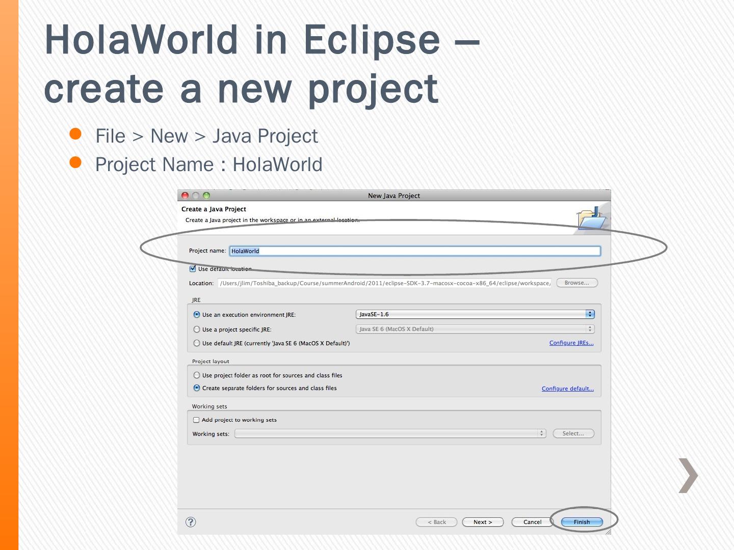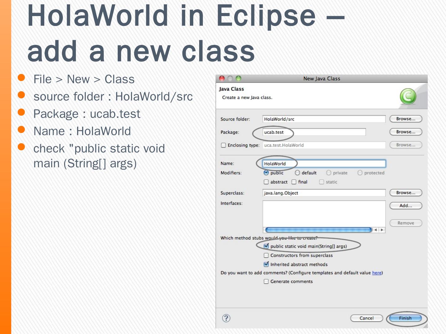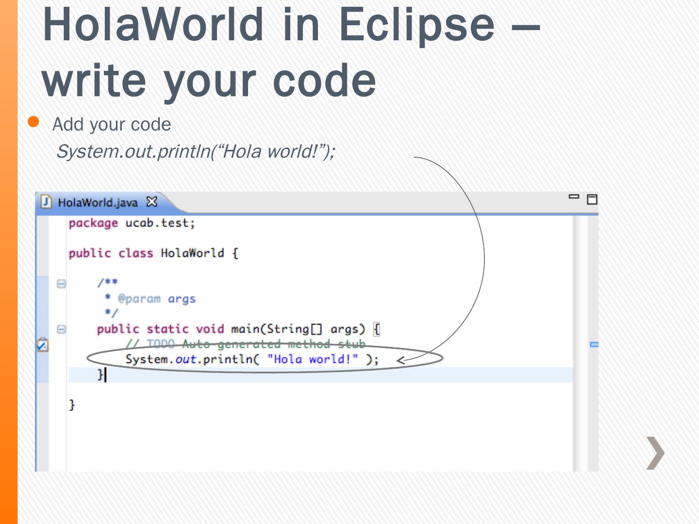 Our first Java program – HolaWorld.java */. public class HolaWorld {. //main(). public static void main ( String[] args ) {. System.out.println( ”Hola world!" ); }.