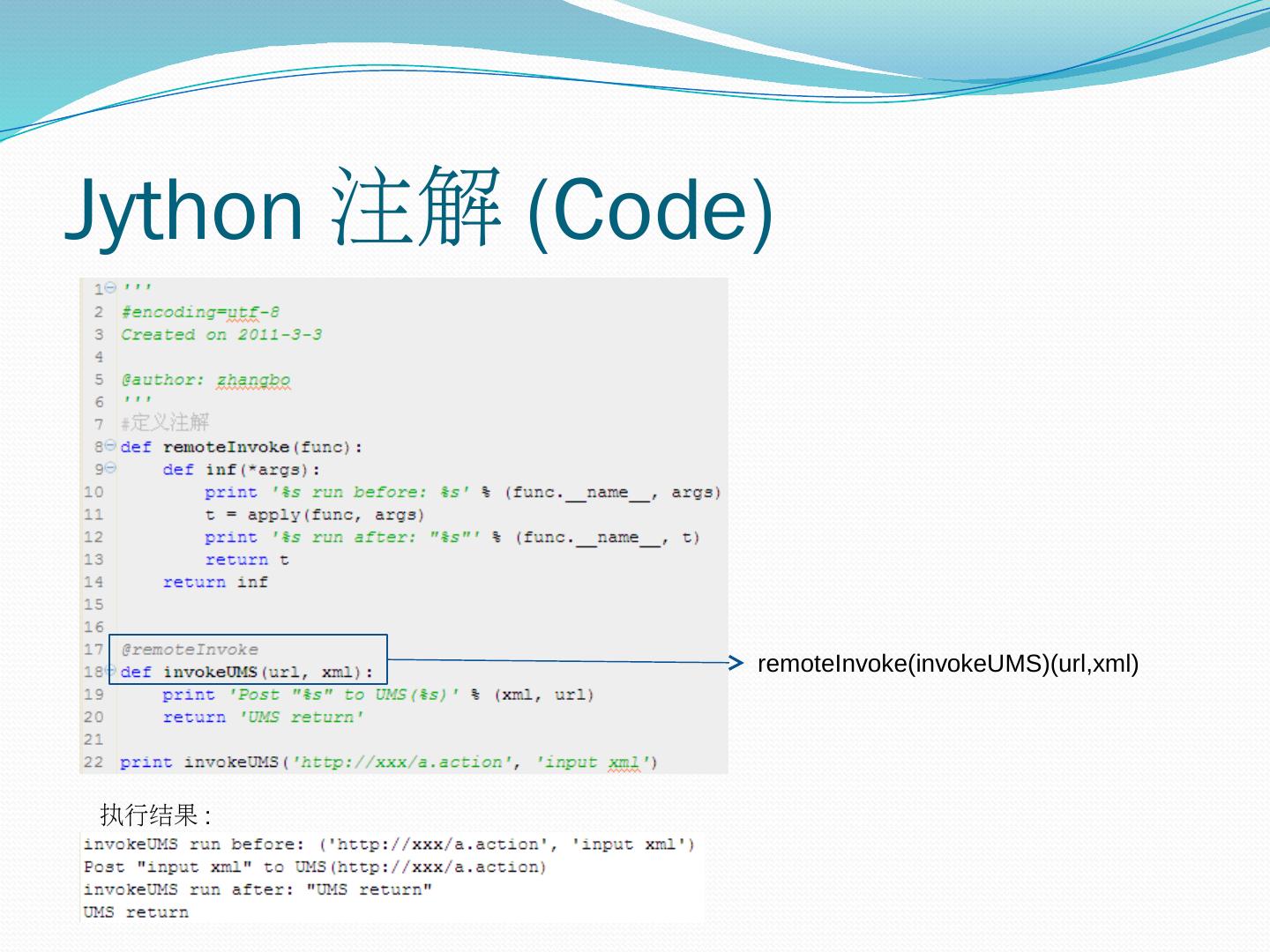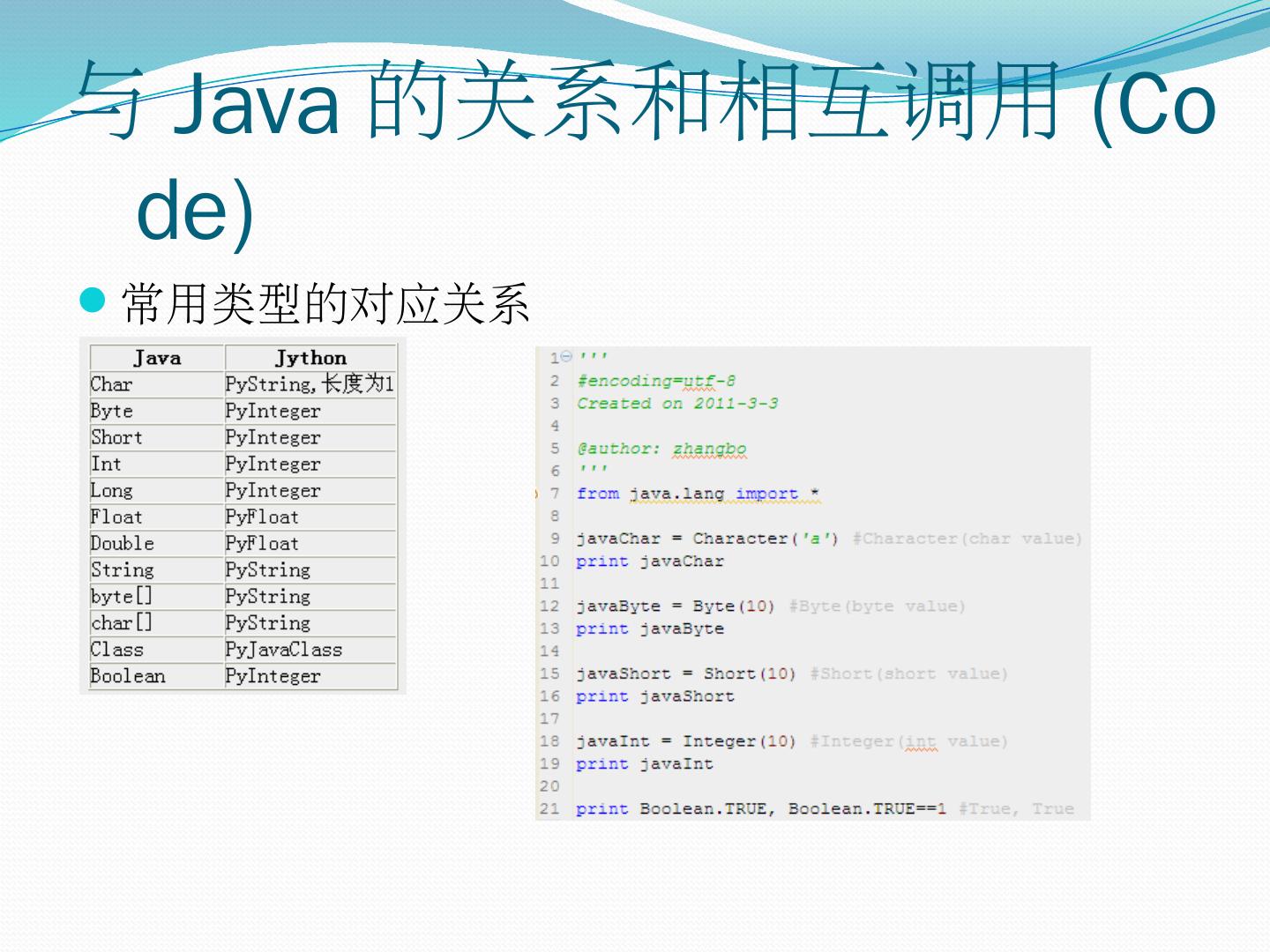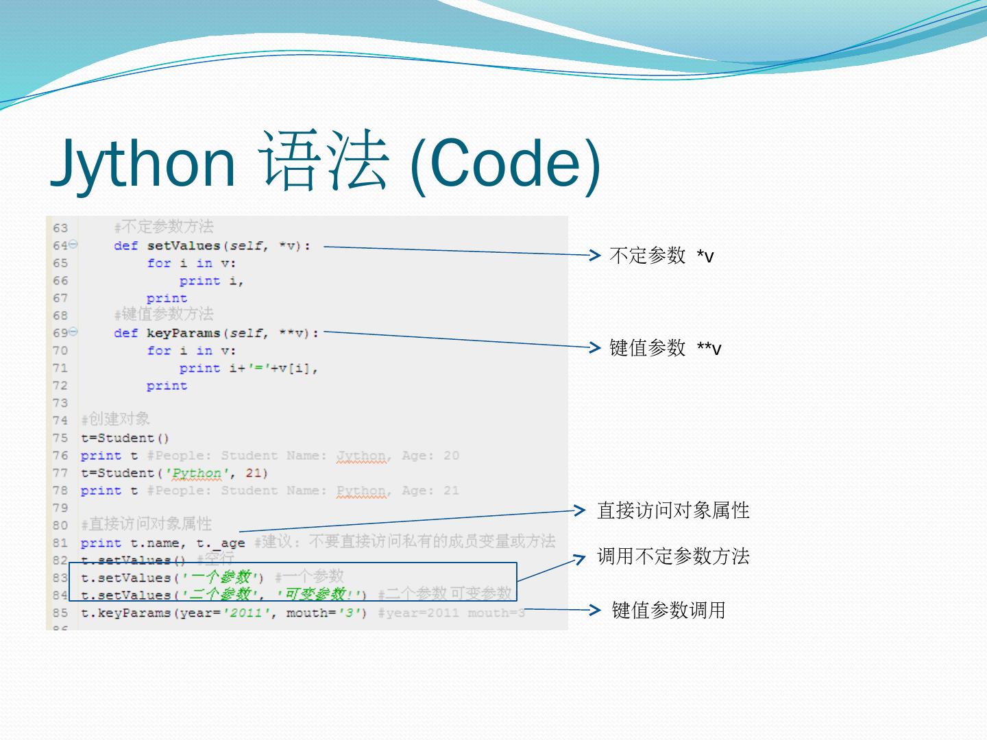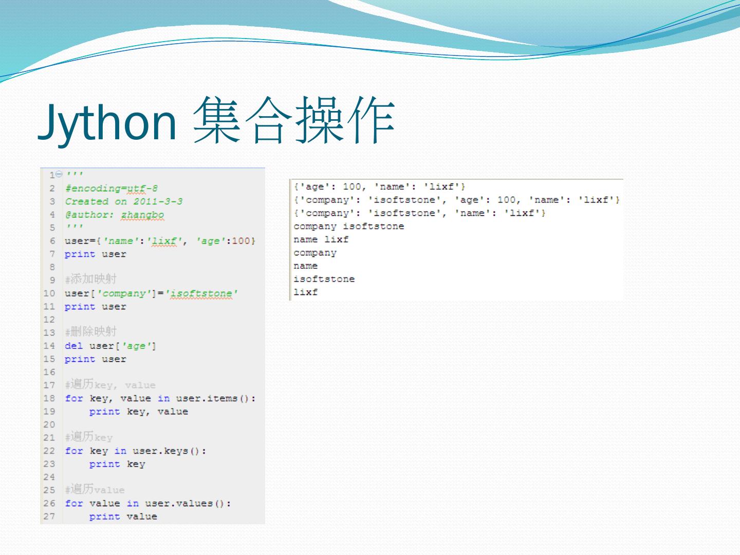 Jython是一种完整的语言,而不是一个Java翻译器或仅仅是一个Python编译器,它是一个Python语言在Java中的完全实现。 Jython ... Jython语法(Code). doc写在类, ...