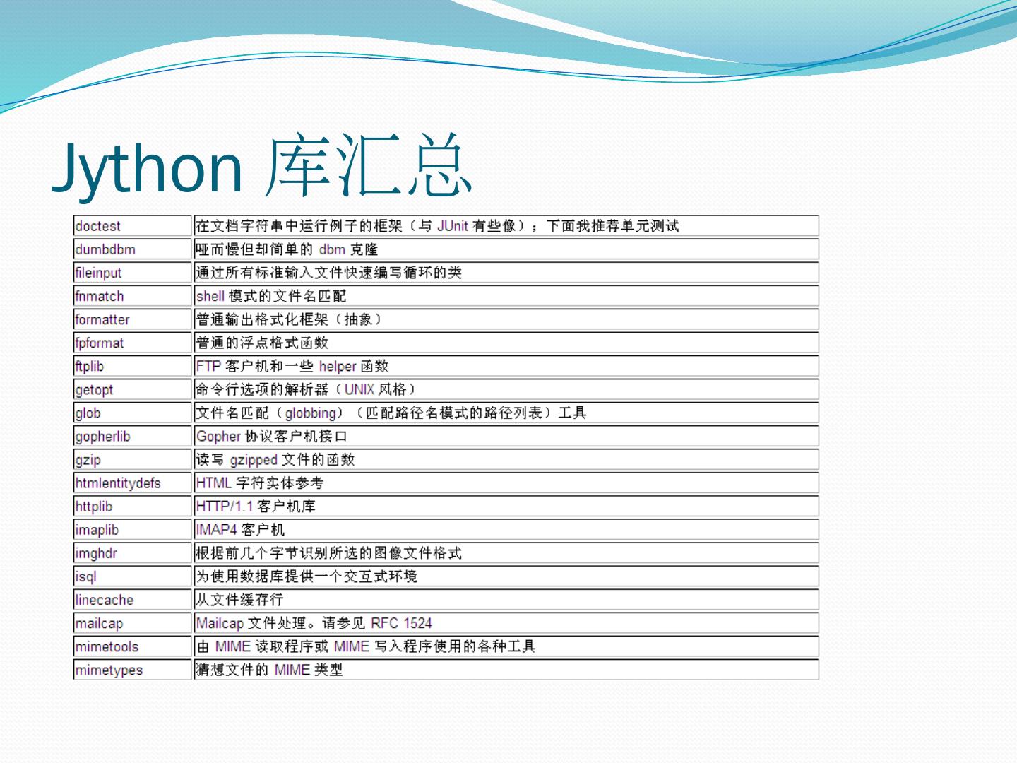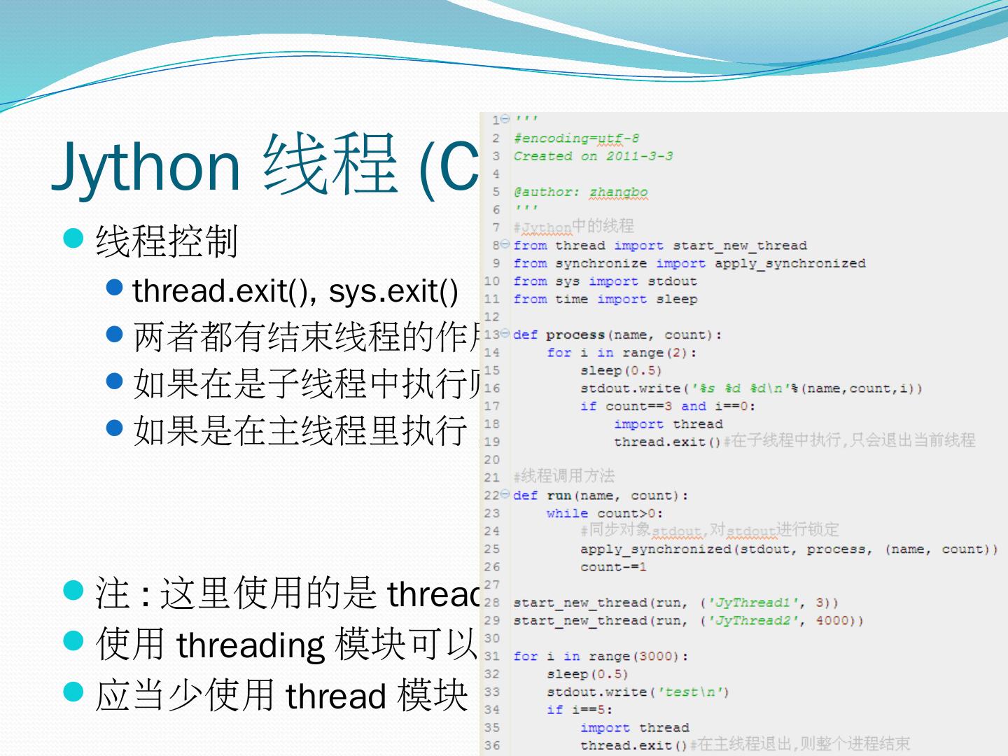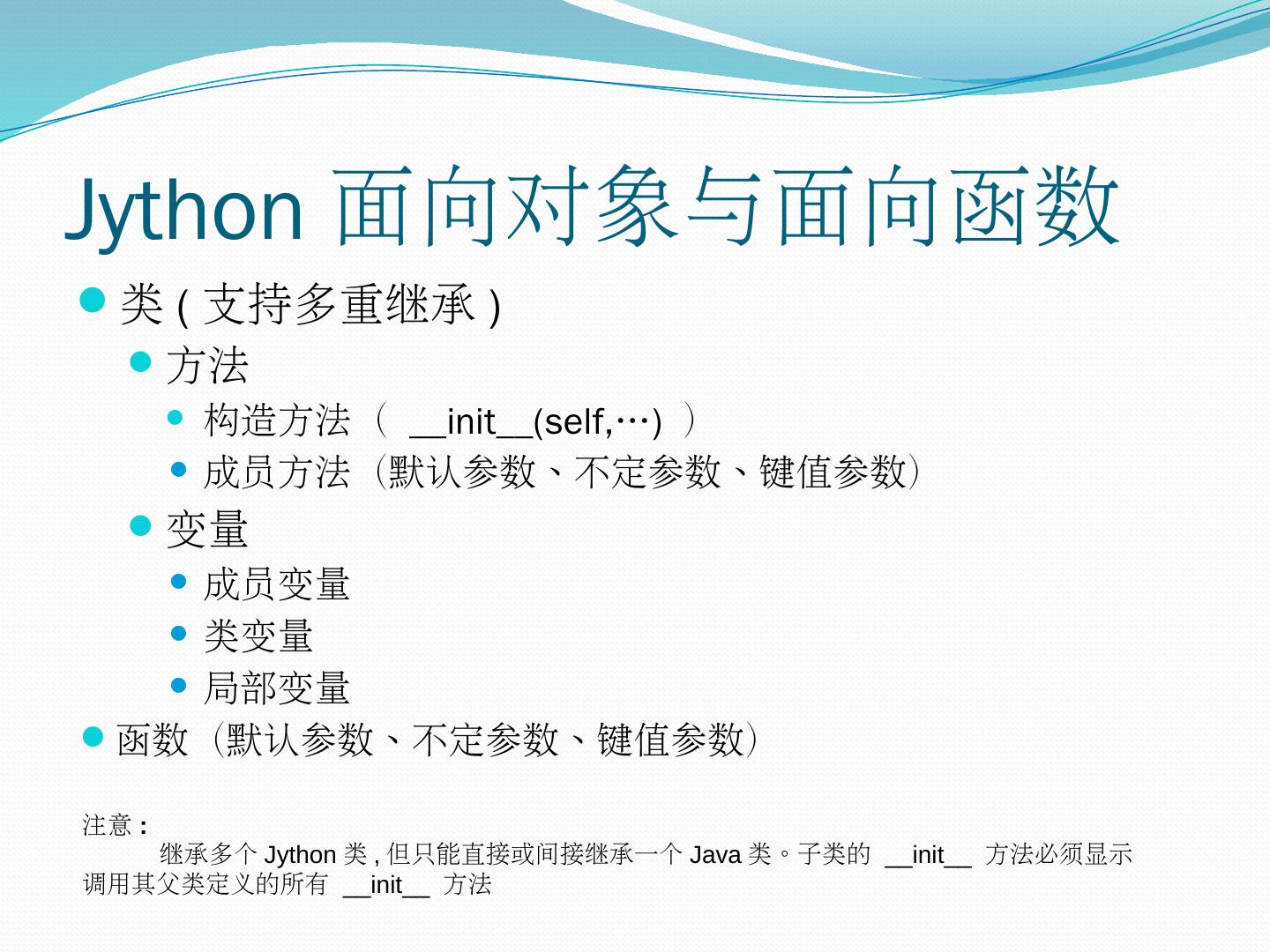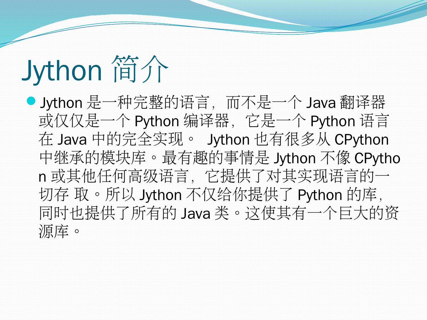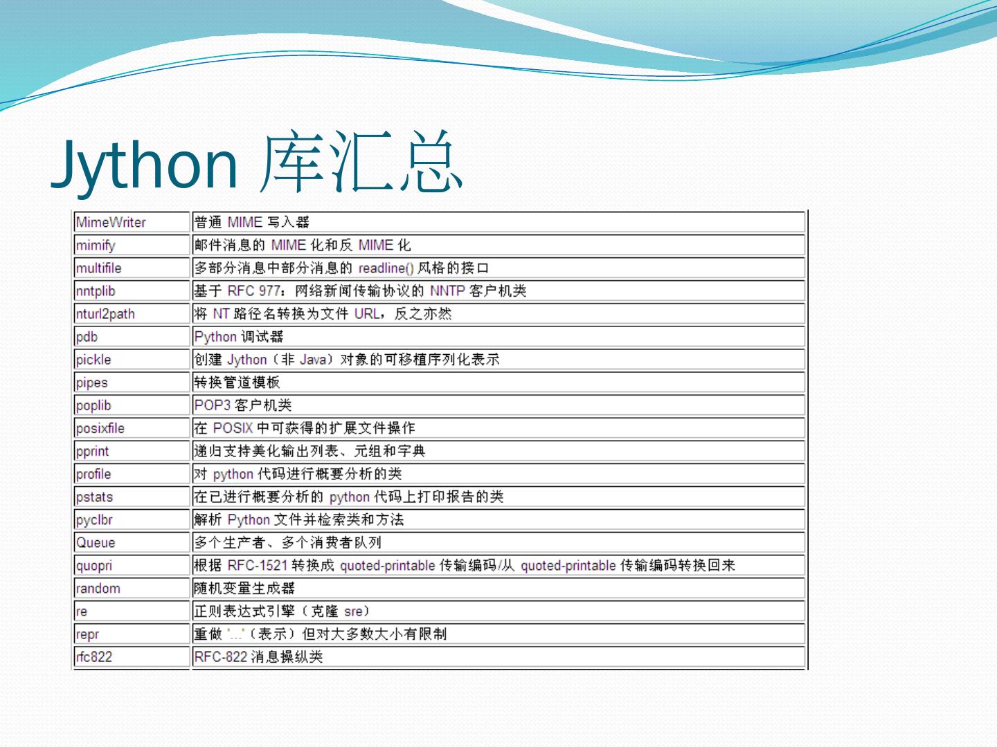 Jython是一种完整的语言,而不是一个Java翻译器或仅仅是一个Python编译器,它是一个Python语言在Java中的完全实现。 Jython ... Jython语法(Code). doc写在类, ...