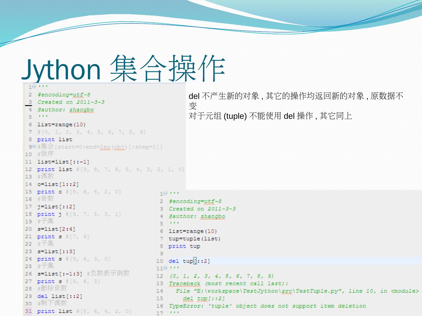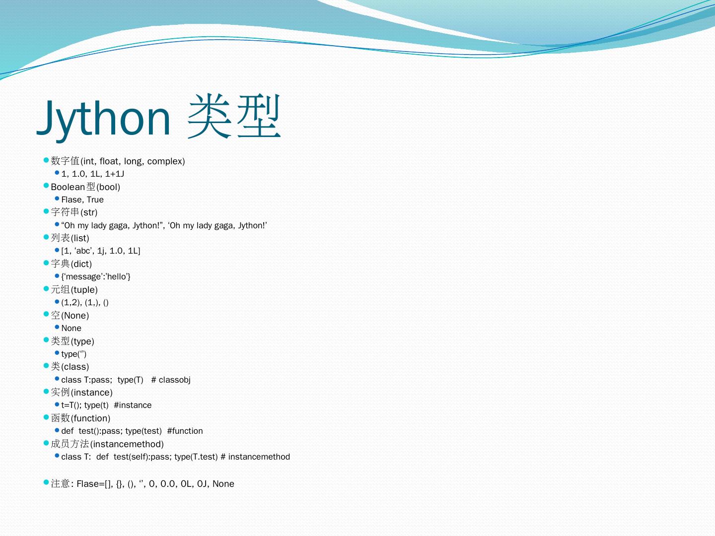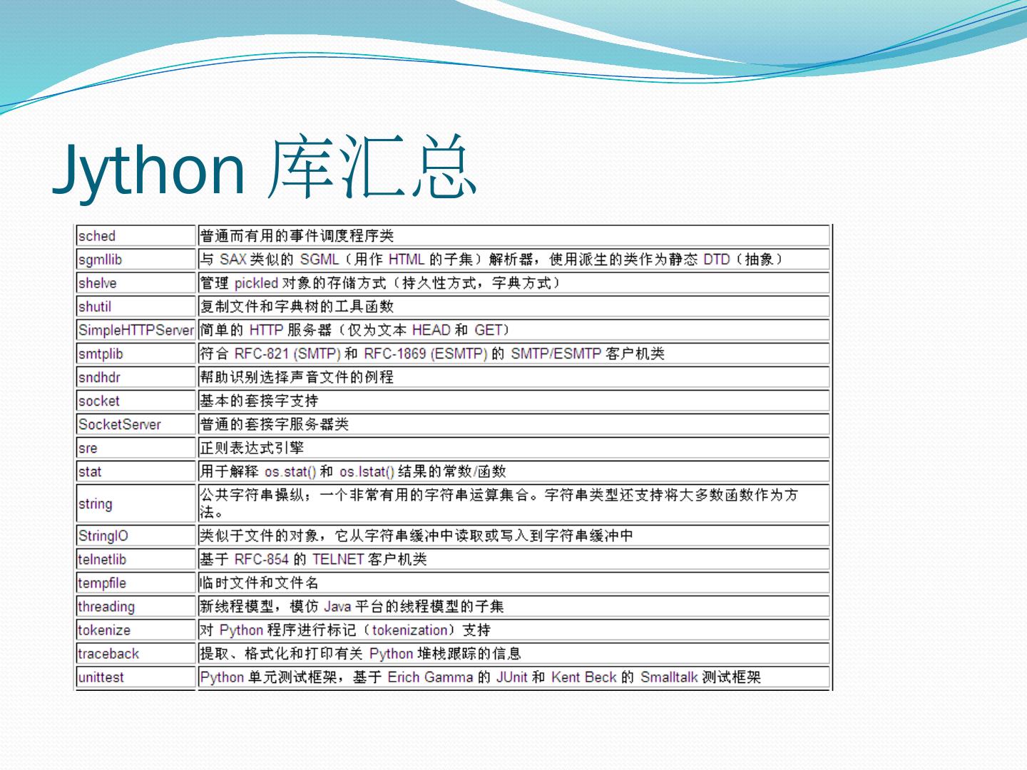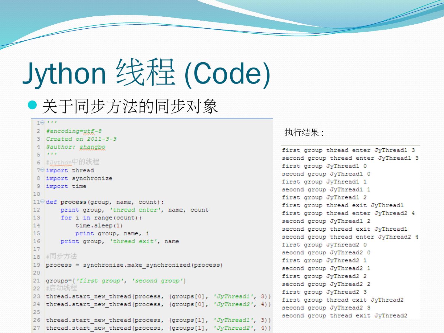 Jython是一种完整的语言,而不是一个Java翻译器或仅仅是一个Python编译器,它是一个Python语言在Java中的完全实现。 Jython ... Jython语法(Code). doc写在类, ...