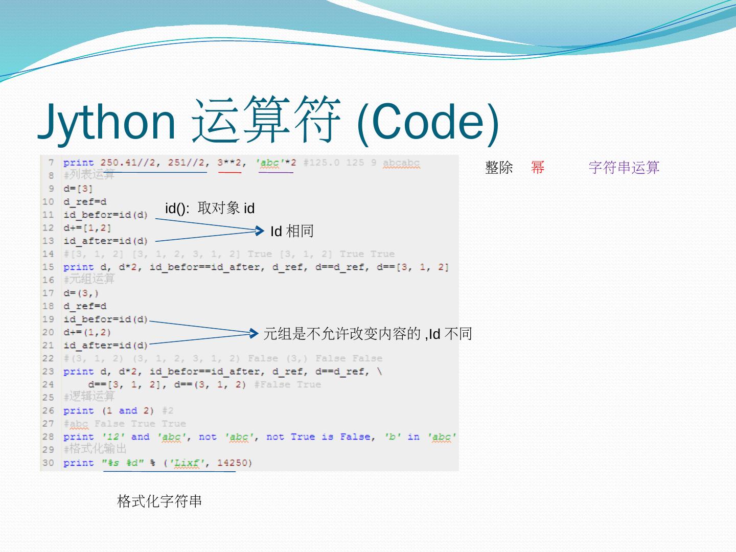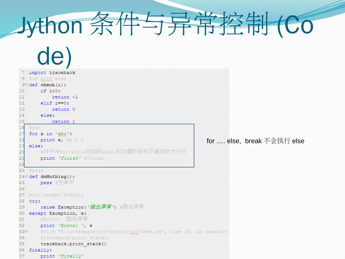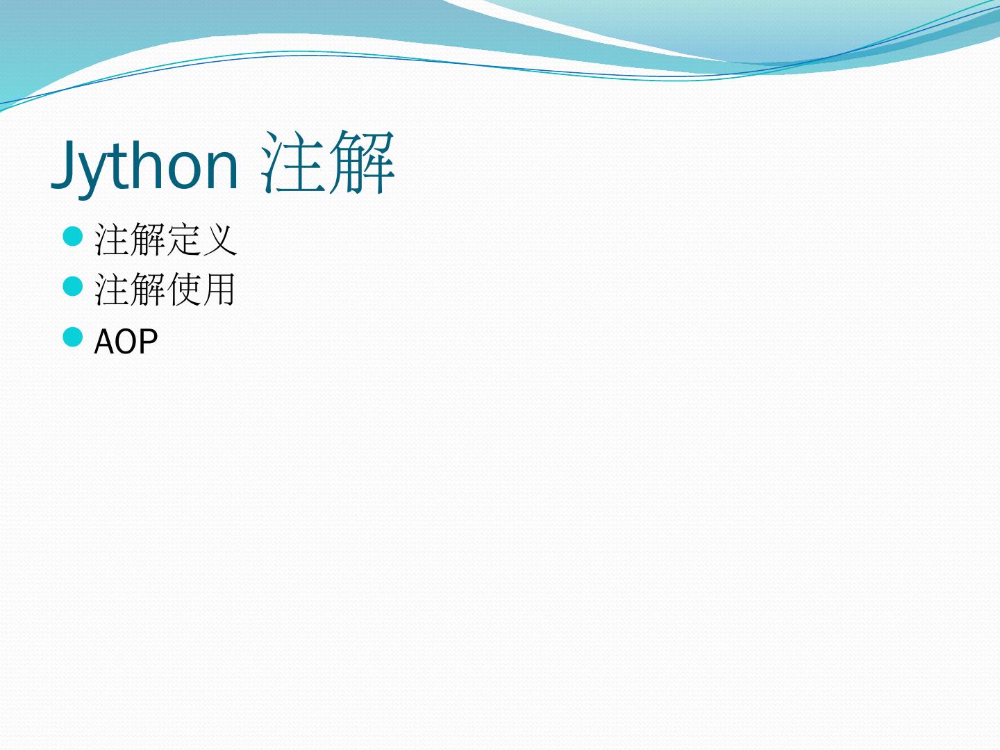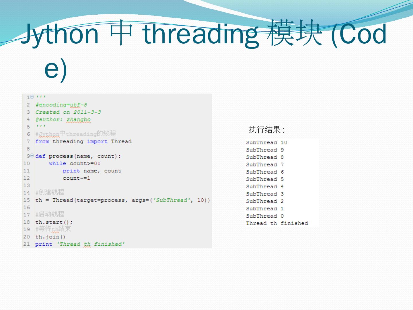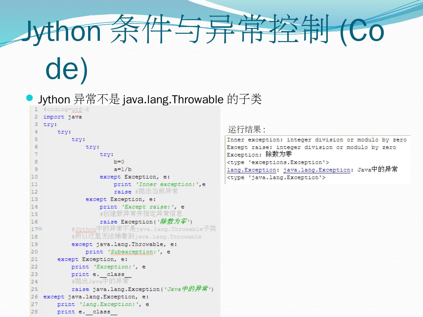Jython是一种完整的语言,而不是一个Java翻译器或仅仅是一个Python编译器,它是一个Python语言在Java中的完全实现。 Jython ... Jython语法(Code). doc写在类, ...