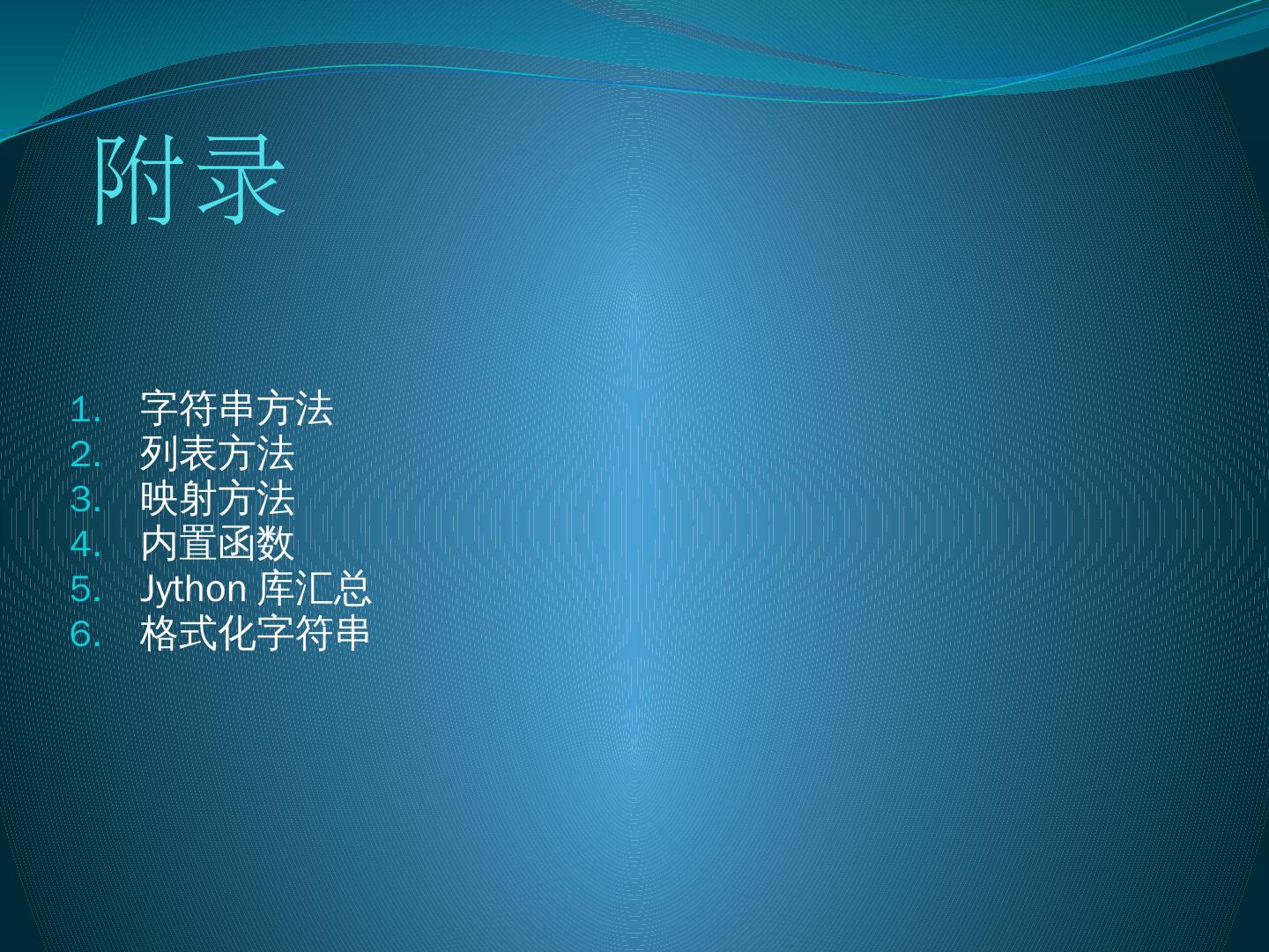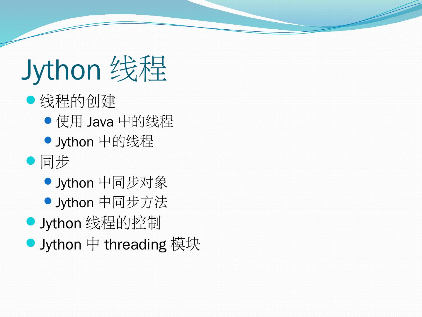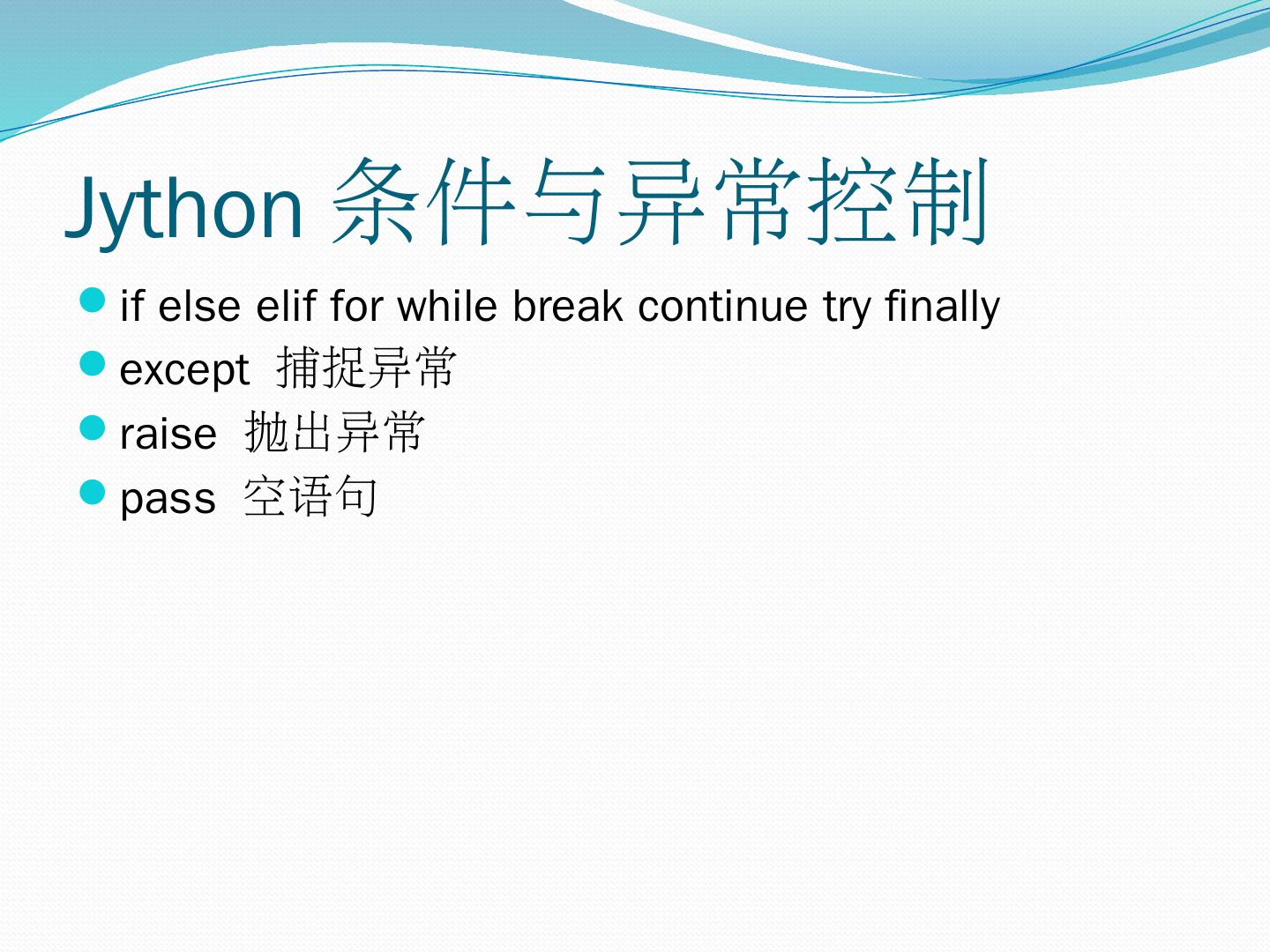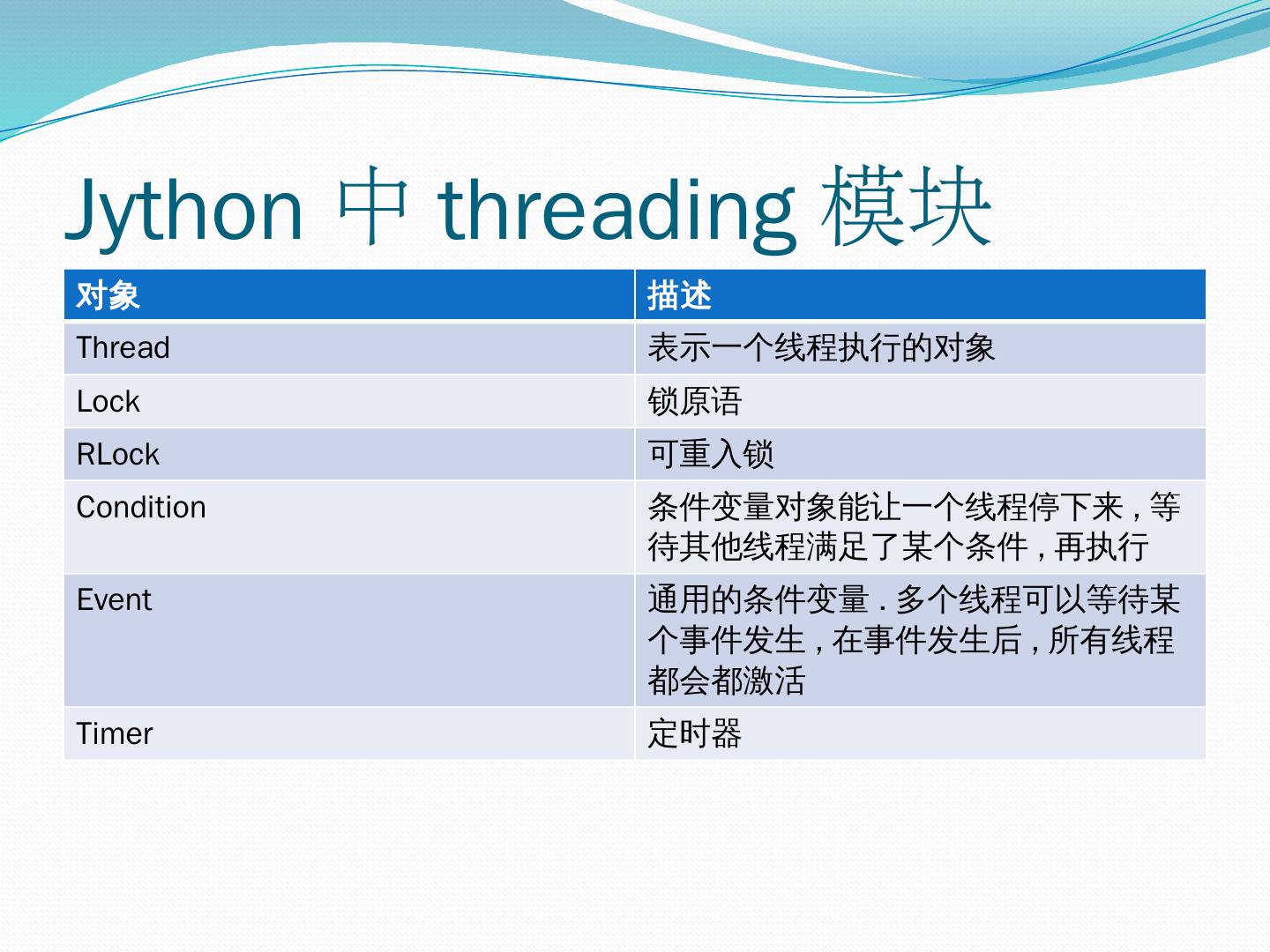 Jython是一种完整的语言,而不是一个Java翻译器或仅仅是一个Python编译器,它是一个Python语言在Java中的完全实现。 Jython ... Jython语法(Code). doc写在类, ...