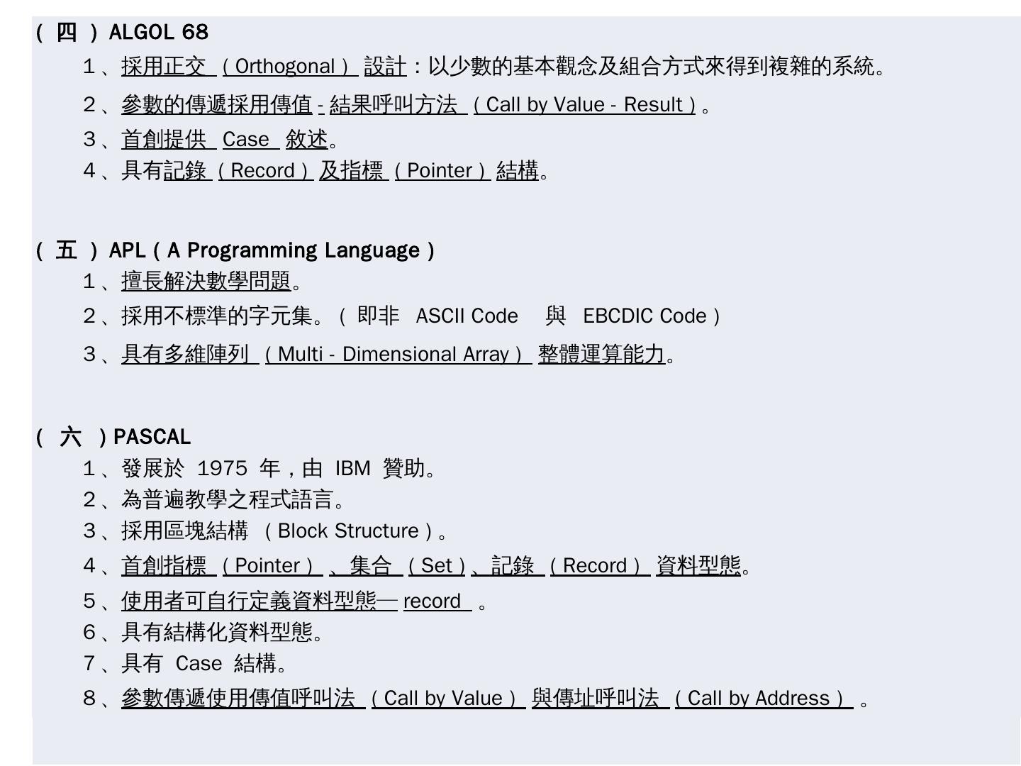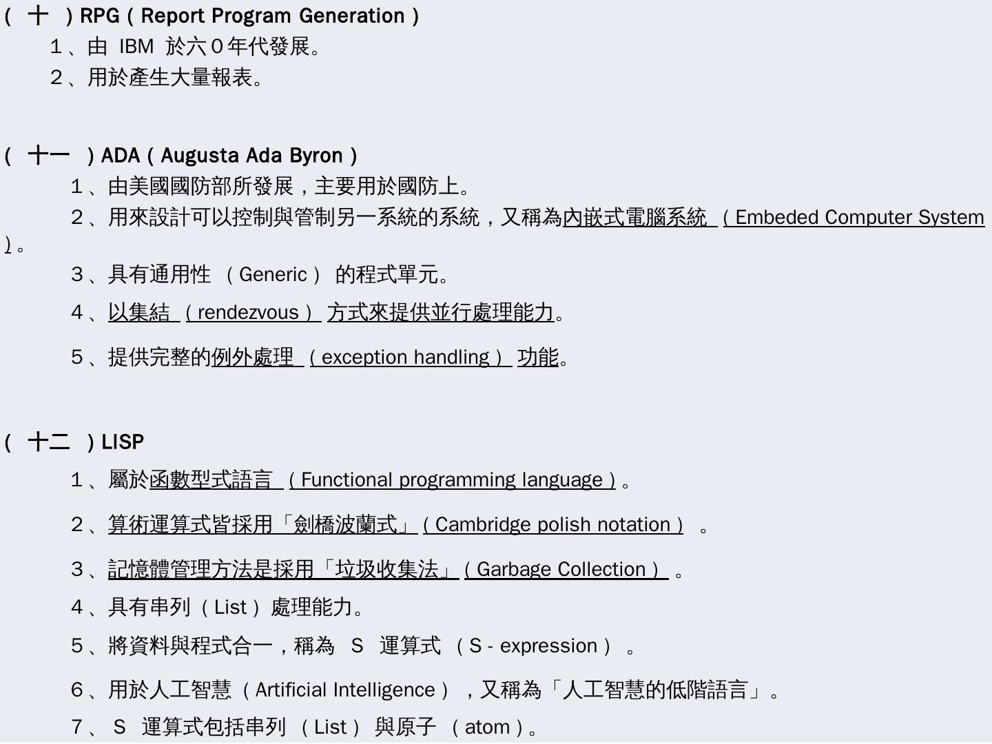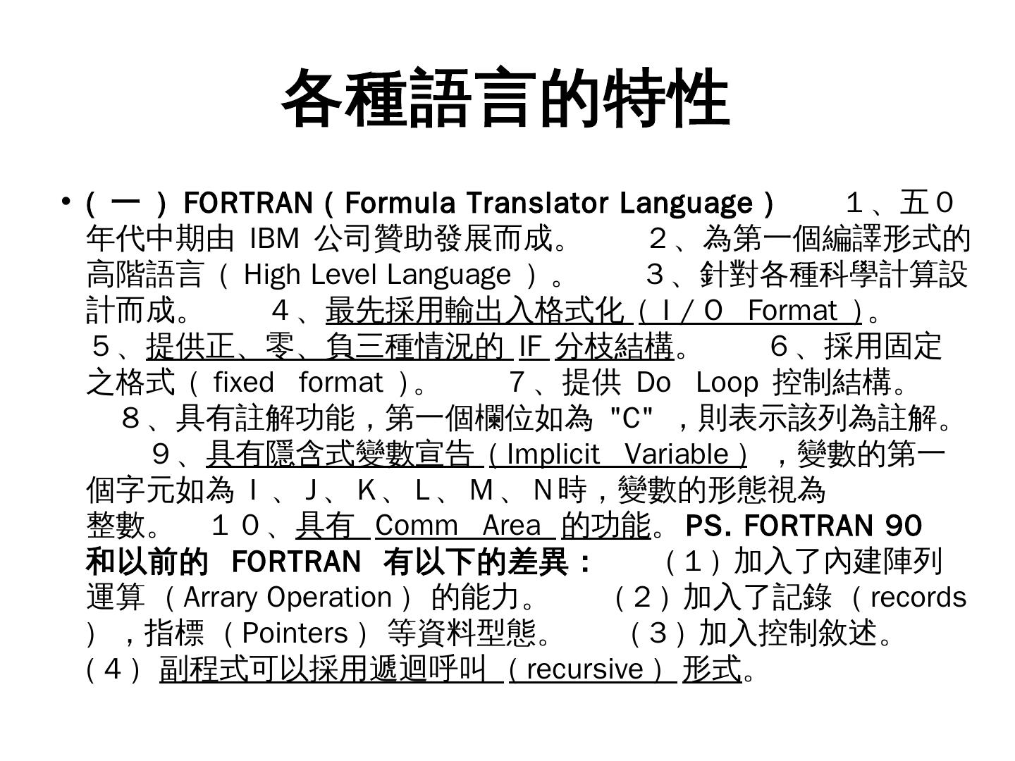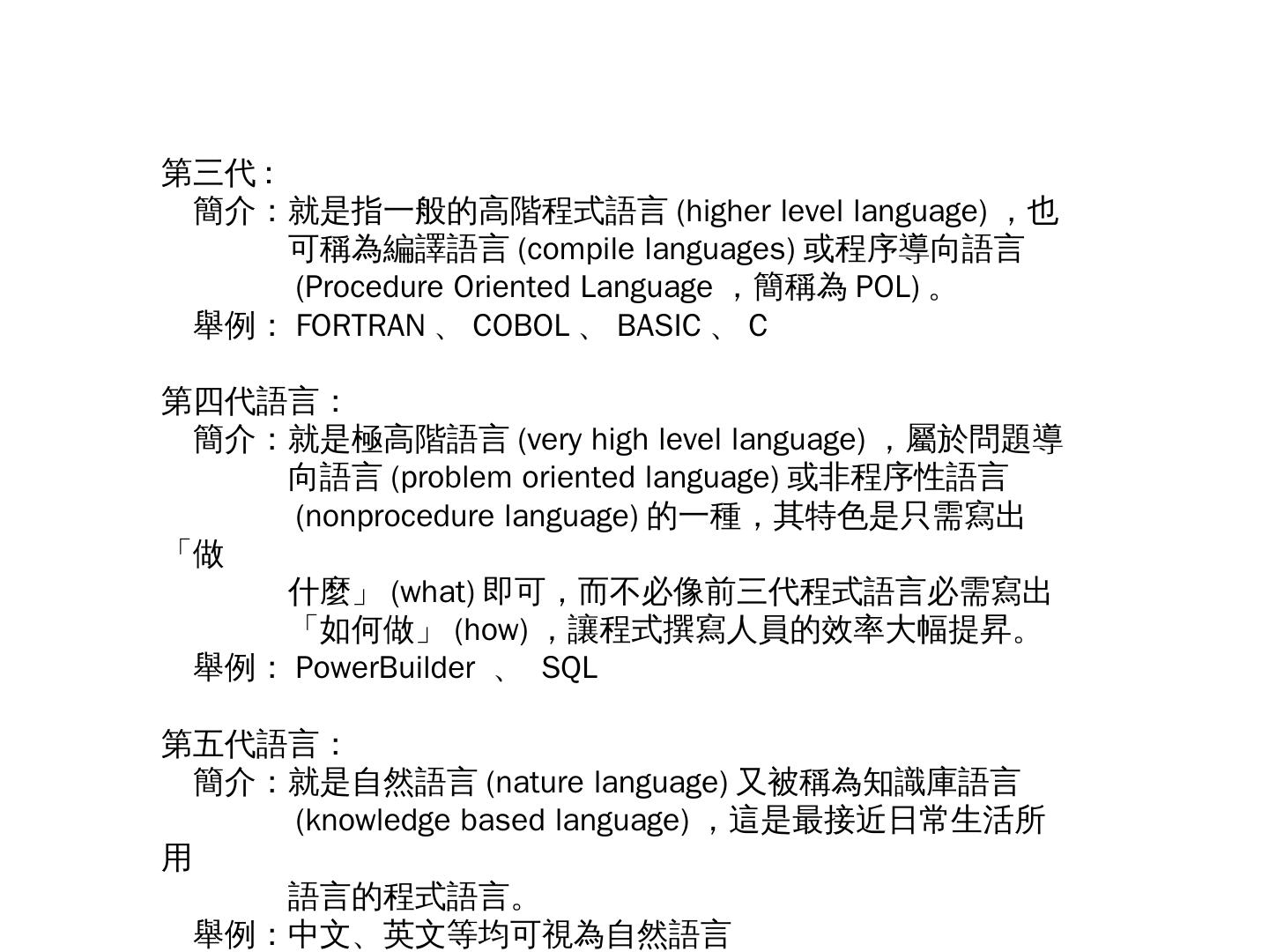 第三代: 簡介:就是指一般的高階程式語言(higher level language),也 可稱為編譯 .... 1、屬於函數型式語言 ( Functional programming language )。 2、算術運算式皆 ...