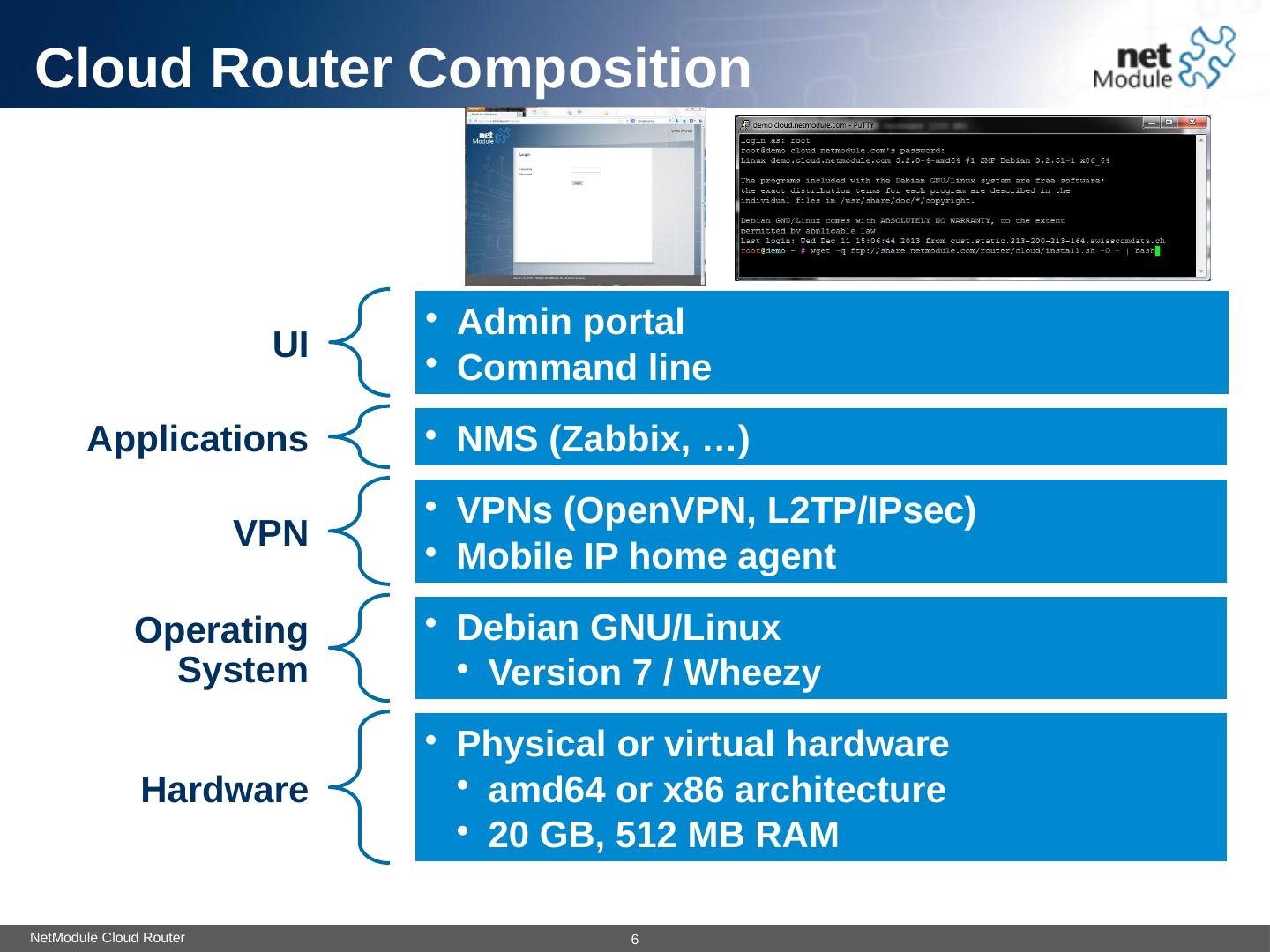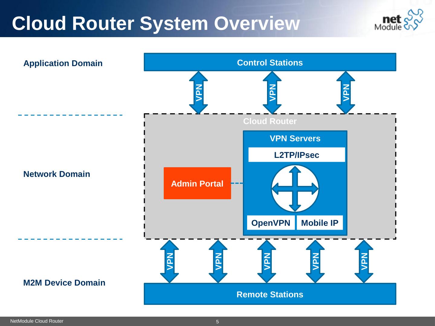 4. NetModule Cloud Router. Cloud Router System Overview. Cloud Router. VPN Servers. Admin Portal. L2TP/IPsec. OpenVPN. Mobile IP. Control Stations.