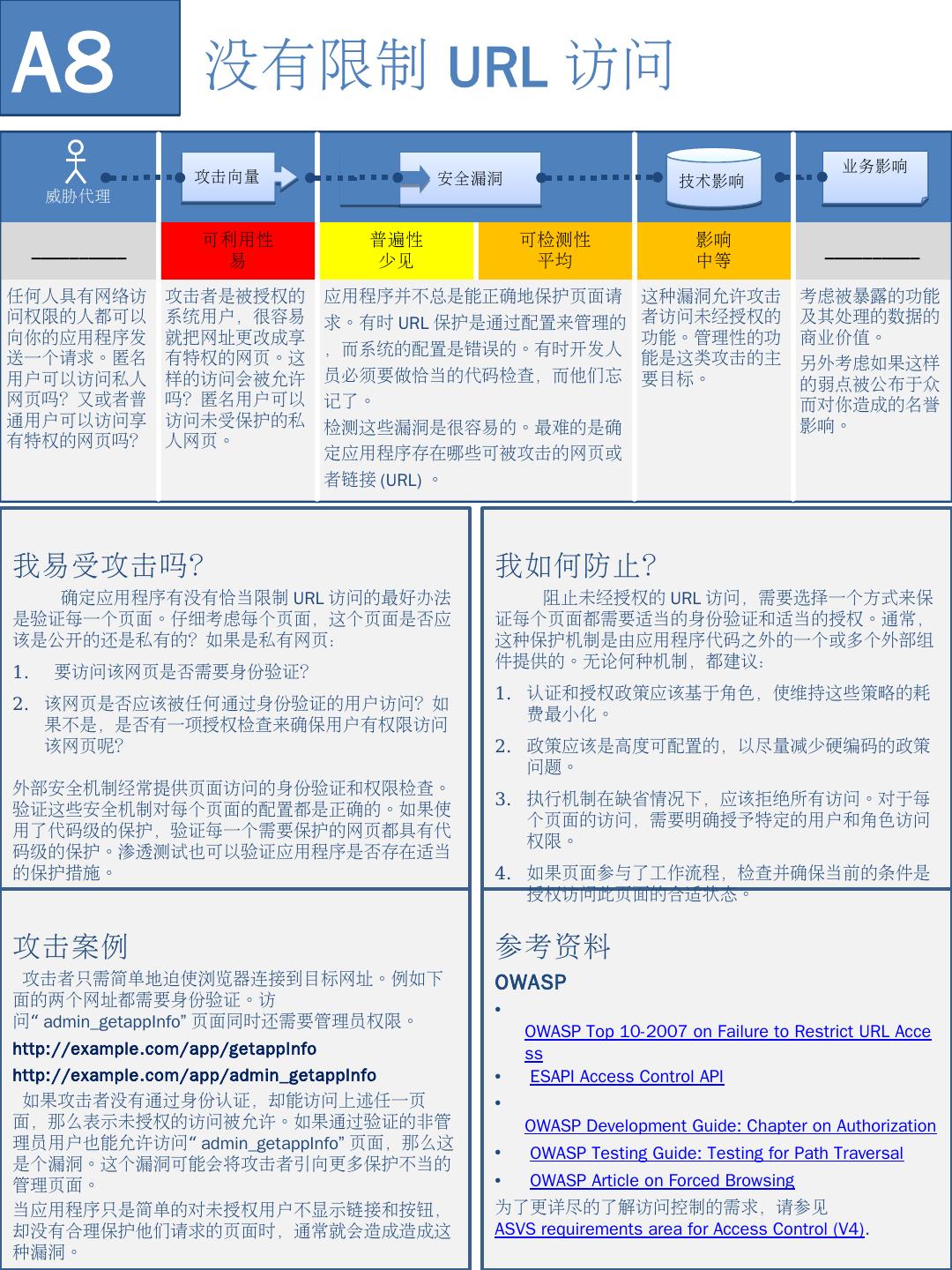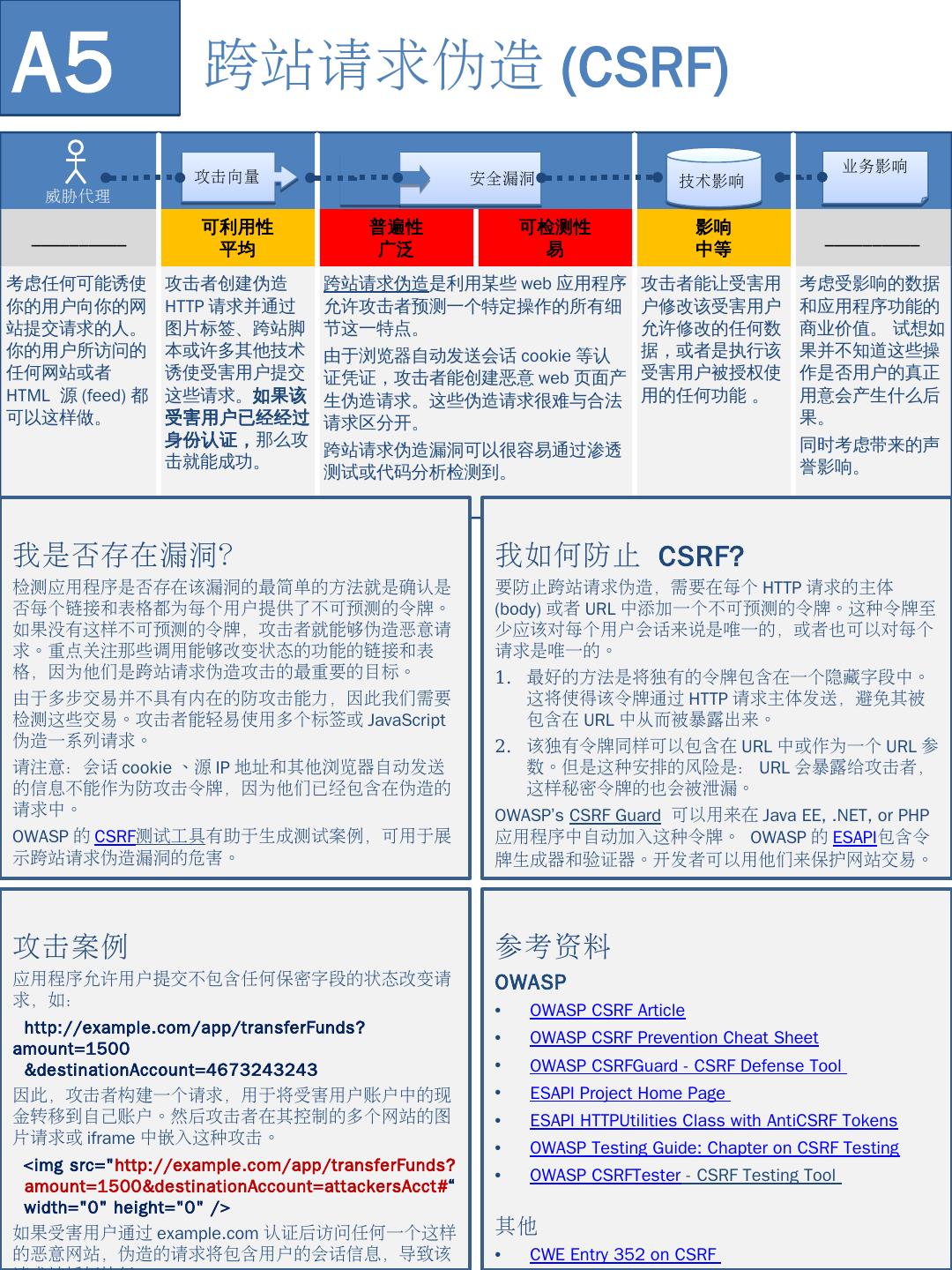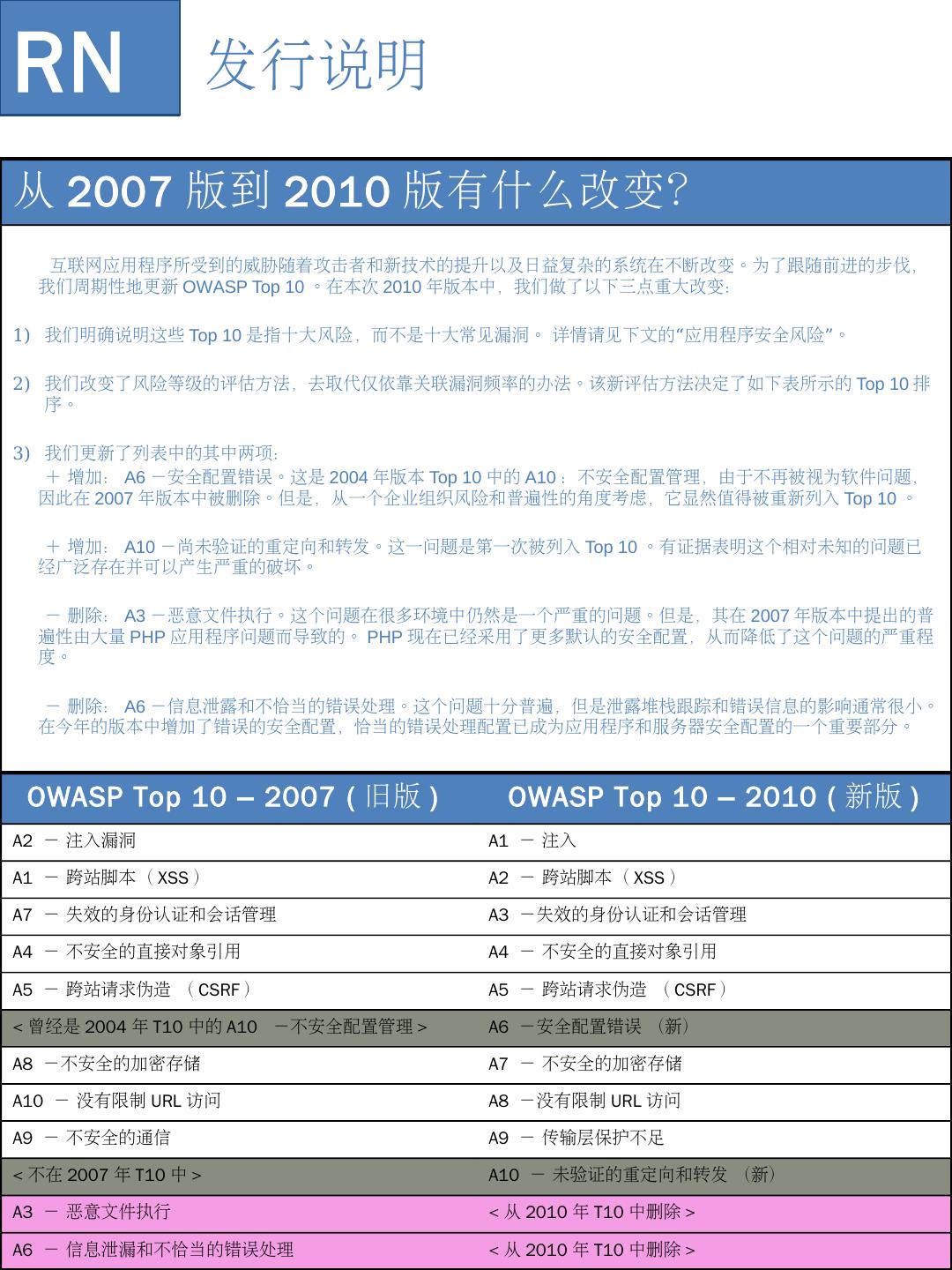 4 .RN 发行说明 从 2007 版到 2010 版有什么改变? 互联网应用程序所受到的威胁随着攻击者和新技术的提升以及日益复杂的系统在不断改变。为了跟随前进的步伐, 我们周期性地更新 OWASP Top 10 。在本次 2010 年版本中,我们做了以下三点重大改变: 1) 我们明确说明这些 Top 10 是指十大风险 ,而不是十大常见漏洞。 详情请见下文的“应用程序安全风险”。 2) 我们改变了风险等级的评估方法,去取代仅依靠关联漏洞频率的办法。该新评估方法决定了如下表所示的 Top 10 排 序。 3) 我们更新了列表中的其中两项: + 增加: A6 -安全配置错误。这是 2004 年版本 Top 10 中的 A10 :不安全配置管理,由于不再被视为软件问题, 因此在 2007 年版本中被删除。但是,从一个企业组织风险和普遍性的角度考虑,它显然值得被重新列入 Top 10 。 + 增加: A10 -尚未验证的重定向和转发。这一问题是第一次被列入 Top 10 。有证据表明这个相对未知的问题已 经广泛存在并可以产生严重的破坏。 - 删除: A3 -恶意文件执行。这个问题在很多环境中仍然是一个严重的问题。但是,其在 2007 年版本中提出的普 遍性由大量 PHP 应用程序问题而导致的。 PHP 现在已经采用了更多默认的安全配置,从而降低了这个问题的严重程 度。 - 删除: A6 -信息泄露和不恰当的错误处理。这个问题十分普遍,但是泄露堆栈跟踪和错误信息的影响通常很小。 在今年的版本中增加了错误的安全配置,恰当的错误处理配置已成为应用程序和服务器安全配置的一个重要部分。 OWASP Top 10 – 2007 ( 旧版 ) OWASP Top 10 – 2010 ( 新版 ) A2 - 注入漏洞 A1 - 注入 A1 - 跨站脚本( XSS ) A2 - 跨站脚本( XSS ) A7 - 失效的身份认证和会话管理 A3 -失效的身份认证和会话管理 A4 - 不安全的直接对象引用 A4 - 不安全的直接对象引用 A5 - 跨站请求伪造 ( CSRF ) A5 - 跨站请求伪造 ( CSRF ) < 曾经是 2004 年 T10 中的 A10 -不安全配置管理 > A6 -安全配置错误 (新) A8 -不安全的加密存储 A7 - 不安全的加密存储 A10 - 没有限制 URL 访问 A8 -没有限制 URL 访问 A9 - 不安全的通信 A9 - 传输层保护不足 < 不在 2007 年 T10 中 > A10 - 未验证的重定向和转发 (新) A3 - 恶意文件执行 < 从 2010 年 T10 中删除 > A6 - 信息泄漏和不恰当的错误处理 < 从 2010 年 T10 中删除 >