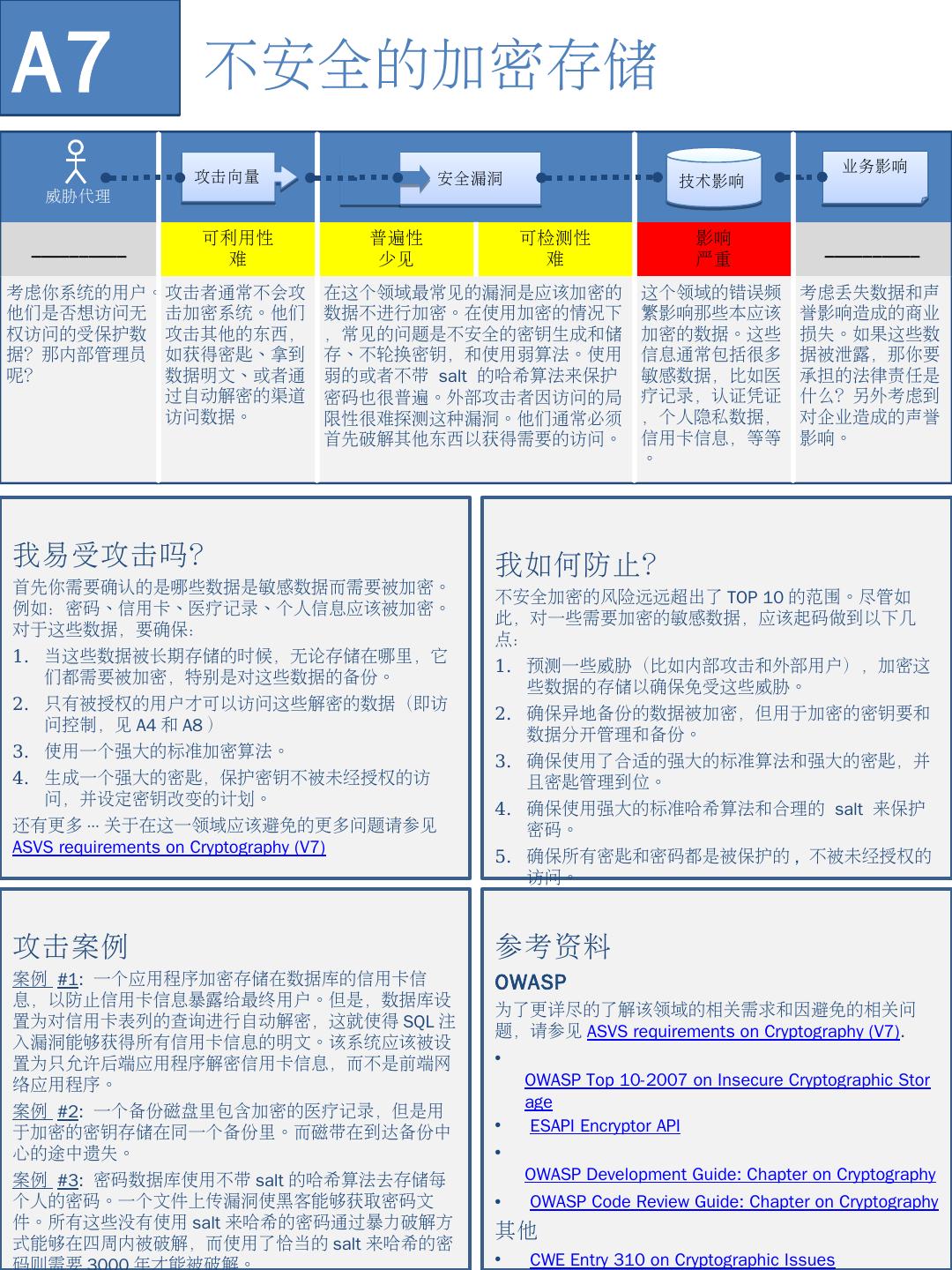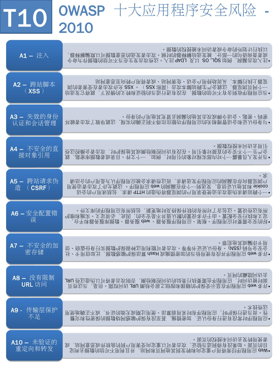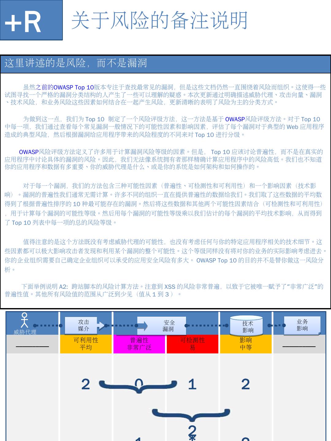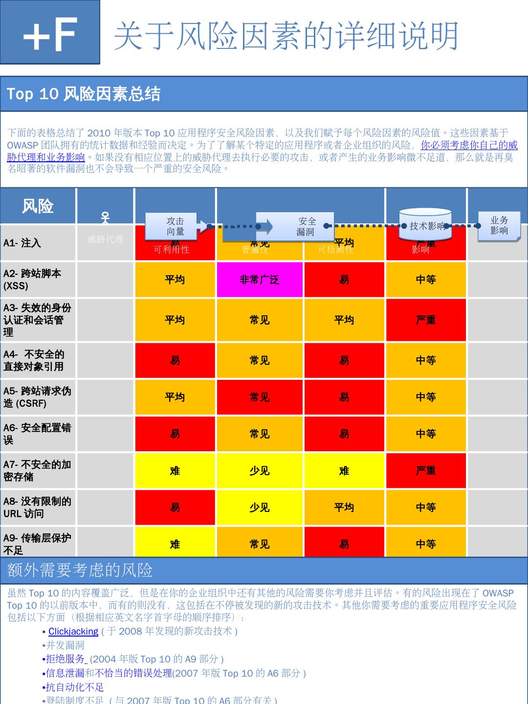 21 . +F 关于风险因素的详细说明 Top 10 风险因素总结 下面的表格总结了 2010 年版本 Top 10 应用程序安全风险因素,以及我们赋予每个风险因素的风险值。这些因素基于 OWASP 团队拥有的统计数据和经验而决定。为了了解某个特定的应用程序或者企业组织的风险,你必须考虑你自己的威 胁代理和业务影响。如果没有相应位置上的威胁代理去执行必要的攻击,或者产生的业务影响微不足道,那么就是再臭 名昭著的软件漏洞也不会导致一个严重的安全风险。 风险 攻击 安全 业务 技术影响 影响 向量 漏洞 A1- 注入 威胁代理 易 常见 平均 严重 可利用性 普遍性 可检测性 影响 A2- 跨站脚本 平均 非常广泛 易 中等 (XSS) A3- 失效的身份 认证和会话管 平均 常见 平均 严重 理 A4- 不安全的 易 常见 易 中等 直接对象引用 A5- 跨站请求伪 平均 常见 易 中等 造 (CSRF) A6- 安全配置错 易 常见 易 中等 误 A7- 不安全的加 难 少见 难 严重 密存储 A8- 没有限制的 易 少见 平均 中等 URL 访问 A9- 传输层保护 难 常见 易 中等 不足 额外需要考虑的风险 A10- 未验证的 平均 少见 易 中等 重定向和转发 虽然 Top 10 的内容覆盖广泛,但是在你的企业组织中还有其他的风险需要你考虑并且评估。有的风险出现在了 OWASP Top 10 的以前版本中,而有的则没有,这包括在不停被发现的新的攻击技术。其他你需要考虑的重要应用程序安全风险 包括以下方面(根据相应英文名字首字母的顺序排序): • Clickjacking ( 于 2008 年发现的新攻击技术 ) •并发漏洞 •拒绝服务 (2004 年版 Top 10 的 A9 部分 ) •信息泄漏和不恰当的错误处理(2007 年版 Top 10 的 A6 部分 ) •抗自动化不足