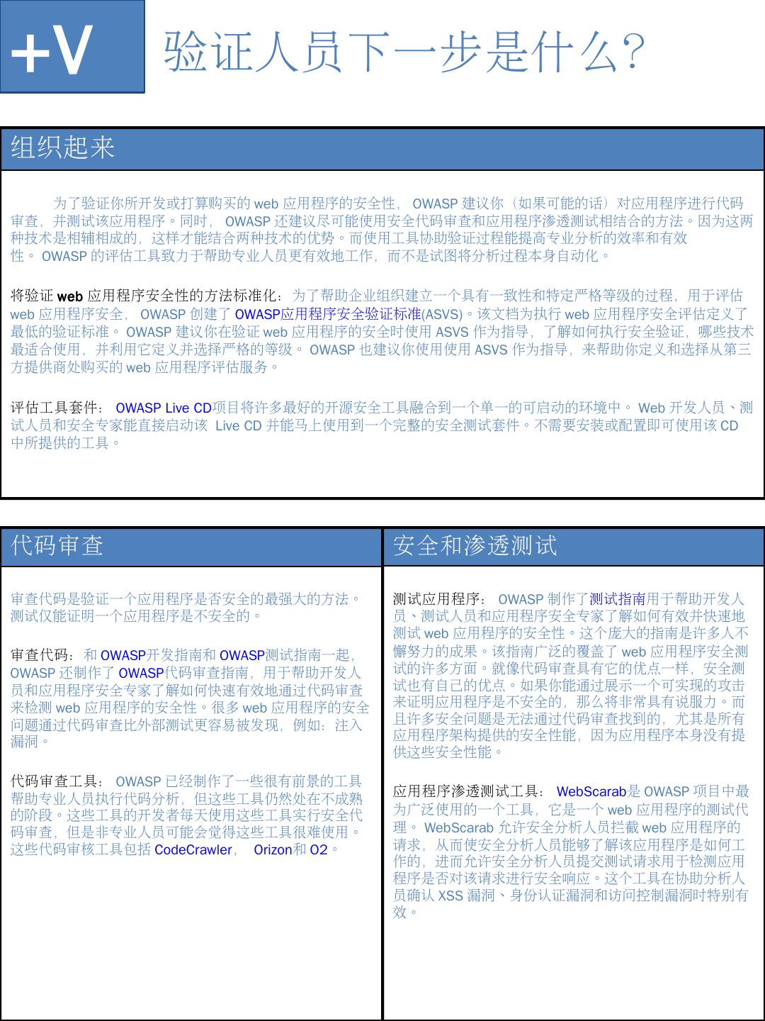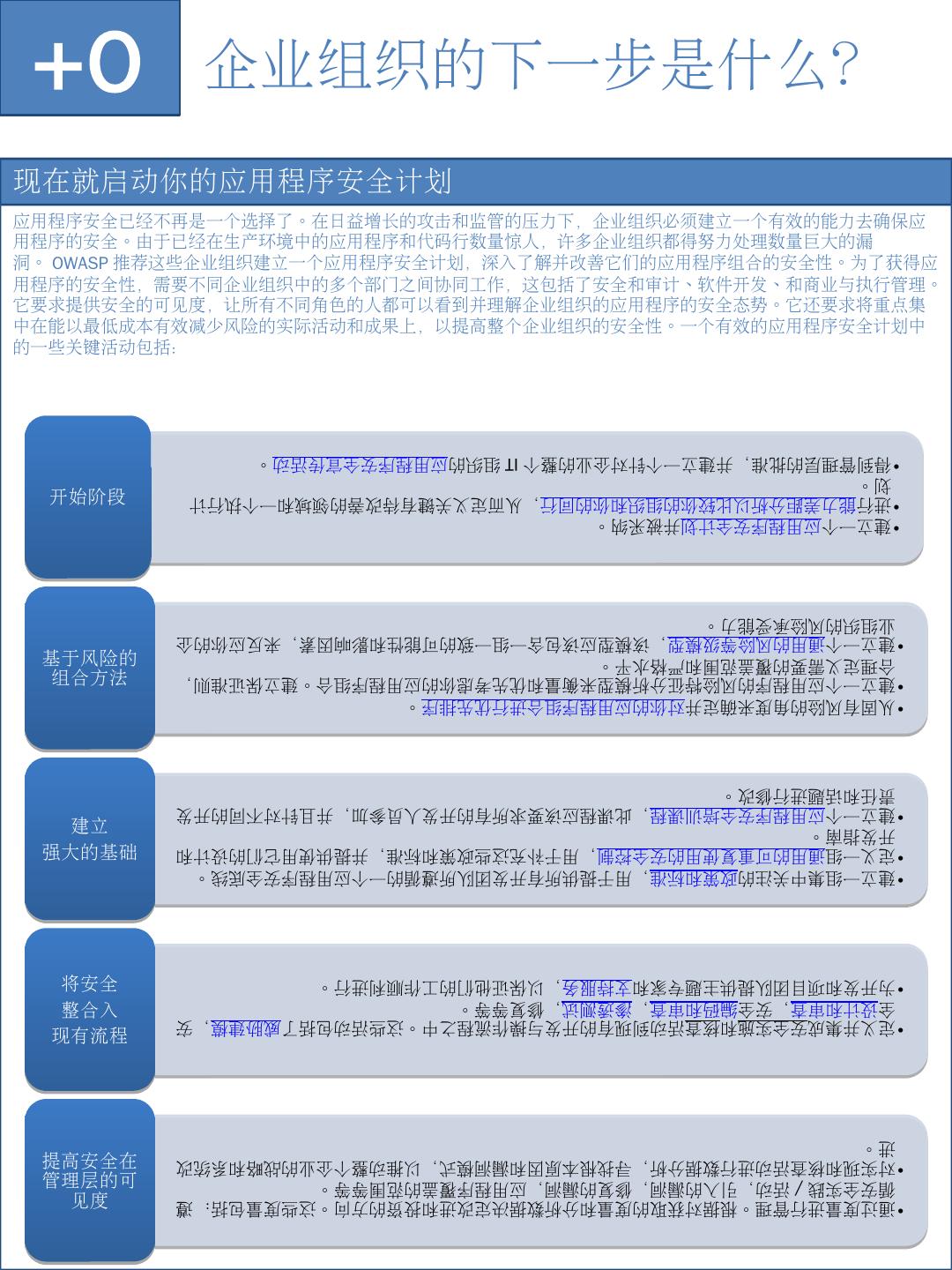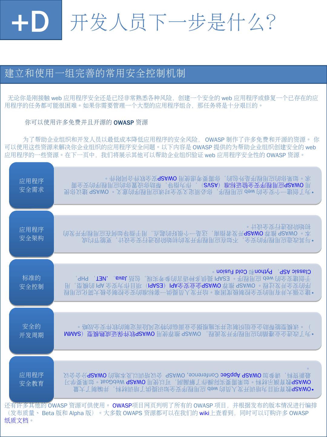 17 .纸质文档。 (发布质量、 Beta 版和 Alpha 版)。大多数 OWAPS 资源都可以在我们的 wiki上查看到,同时可以订购许多 OWASP 还有许多其他的 OWASP 资源可供使用。 OWASP项目网页列明了所有的 OWASP 项目,并根据发布的版本情况进行编排 • OWASP教育项目为培训开发人员的 web 应用程序安全知识提供了培训材料,并编制了大量 安全教育 OWASP教育演示材料。如果需要实际操作了解漏洞,可以使用 OWASP WebGoat。如果要学习 应用程序 最新资料,请参加 OWASP AppSec Conference, OWASP 会议培训以及本地的 OWASP分会会议 。 开发周期 • 为了改进企业遵循的应用程序开发流程, OWASP 推荐使用 OWASP软件保证成熟模型(SAMM )。该模型能帮助企业组织制定并实施根据企业面临的特定风险而定制的软件安全战略。 安全的 • 建立强大并有用的安全控制极度困难。给开发人员提供一套标准的安全控制会极大简化应用程 安全控制 序的安全开发过程。 OWASP 推荐 OWASP企业安全API(ESAPI)项目作为安全 API 的模型,用 于创建安全的 web 应用程序。 ESAPI 提供多种语言的参考实现,包括 Java, .NET, PHP, 标准的 Classic ASP, Python和 Cold Fusion。 • 与其改造应用程序的安全,不如在应用程序开发的初始阶段进行安全设计,更能节约成 安全架构 本。 OWASP 推荐 OWASP开发者指南,这是一个很好的起点,用于指导如何在应用程序开发的 应用程序 初始阶段进行安全设计。 • 为了创建一个安全的 web 应用程序,你必须定义安全对该应用程序的意义。 OWASP 建议你使 安全需求 用 OWASP应用程序安全验证标准(ASVS),作为指导,帮助你设置你的应用程序的安全需 应用程序 求。如果你的应用程序是外包的,你需要考虑使用 OWASP安全软件合同附件。 应用程序的一些资源。在下一页中,我们将展示其他可以帮助企业组织验证 web 应用程序安全性的 OWASP 资源。 可以使用这些资源来解决你企业组织的应用程序安全问题。以下内容是 OWASP 提供的为帮助企业组织创建安全的 web 为了帮助企业组织和开发人员以最低成本降低应用程序的安全风险, OWASP 制作了许多免费和开源 的资源。 你 你可以使用许多免费并且开源的 OWASP 资源 用程序的任务都可能很困难。如果你需要管理一个大型的应用程序组合,那任务将是十分艰巨的。 无论你是刚接触 web 应用程序安全还是已经非常熟悉各种风险,创建一个安全的 web 应用程序或修复一个已存在的应 建立和使用一组完善的常用安全控制机制 开发人员下一步是什么? +D