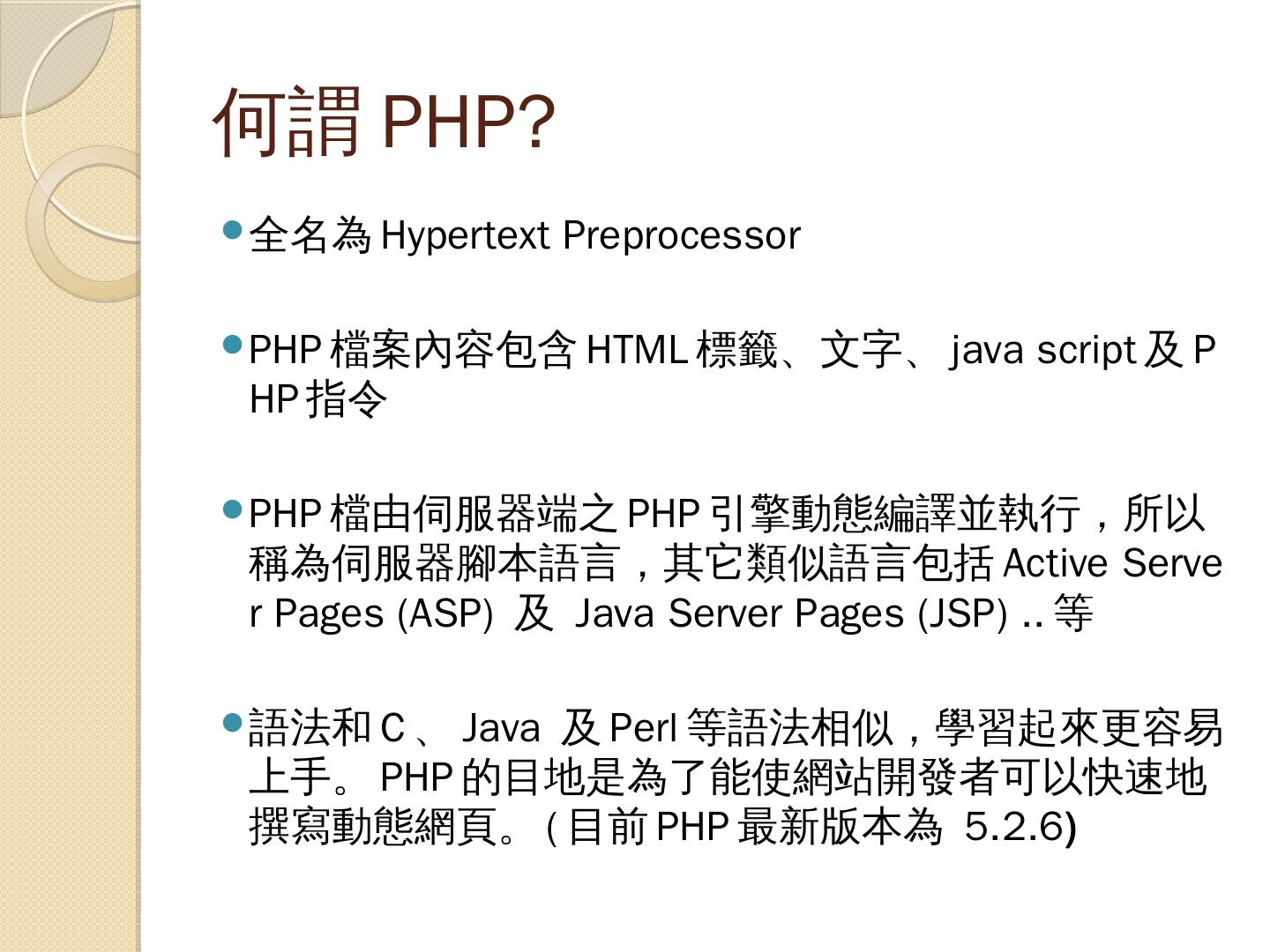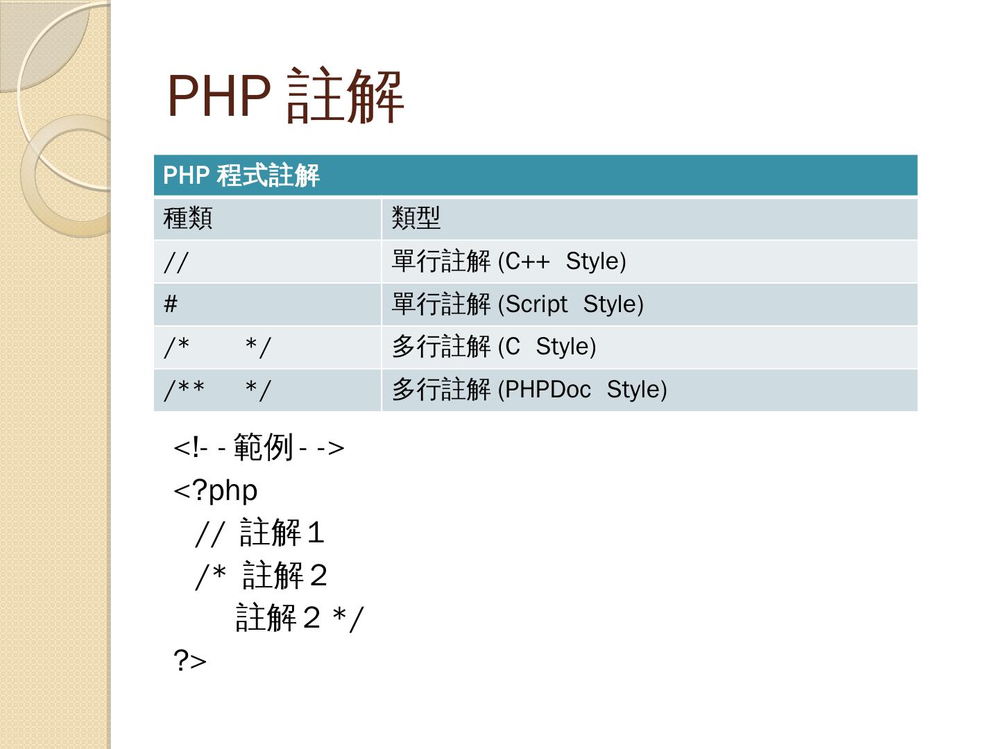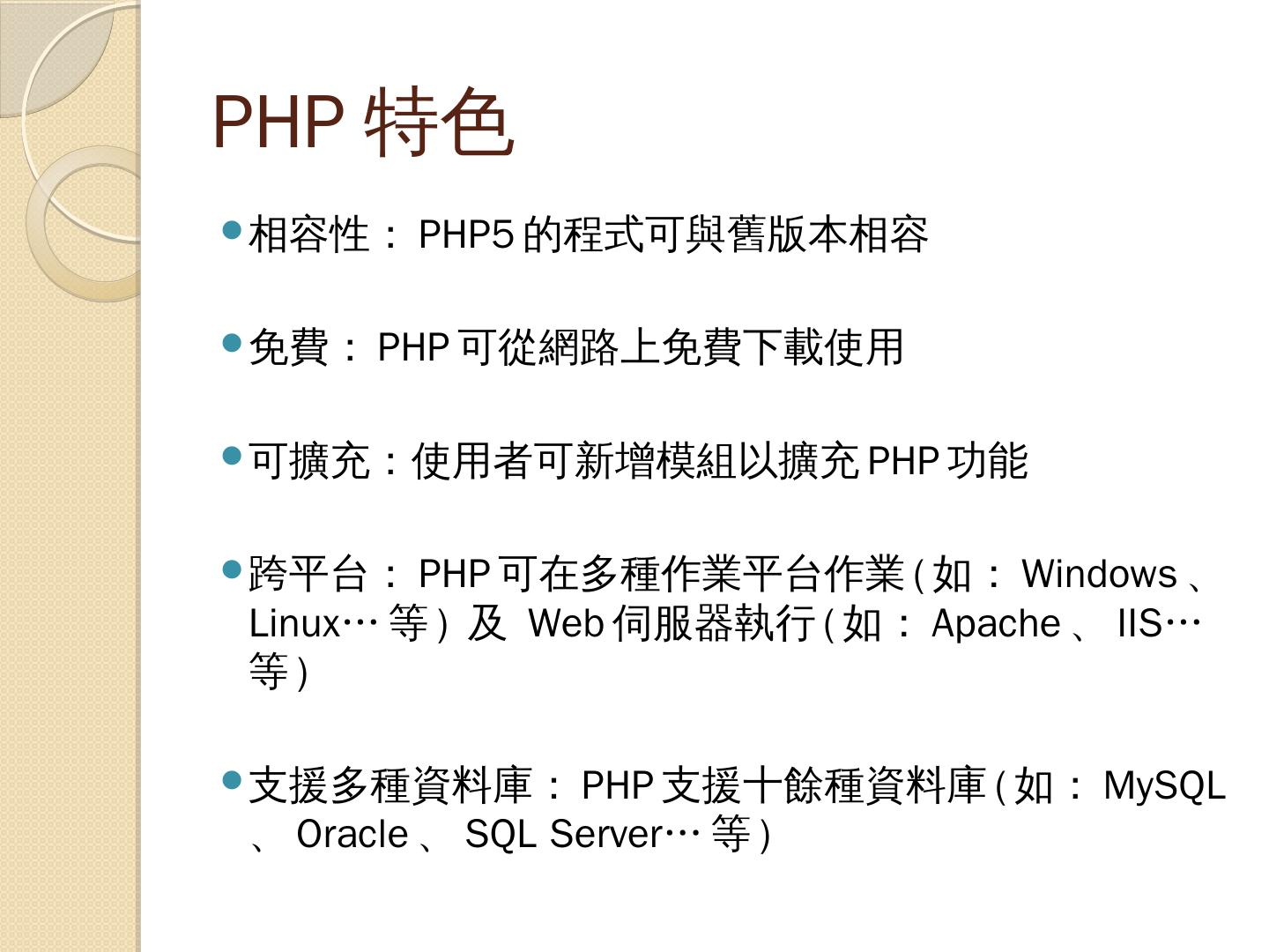 支援多種資料庫:PHP支援十餘種資料庫(如:MySQL、Oracle、SQL Server…等). 撰寫PHP. 只要能夠存成純文字檔的文字編輯器都可以做為PHP程式的編輯器( ...