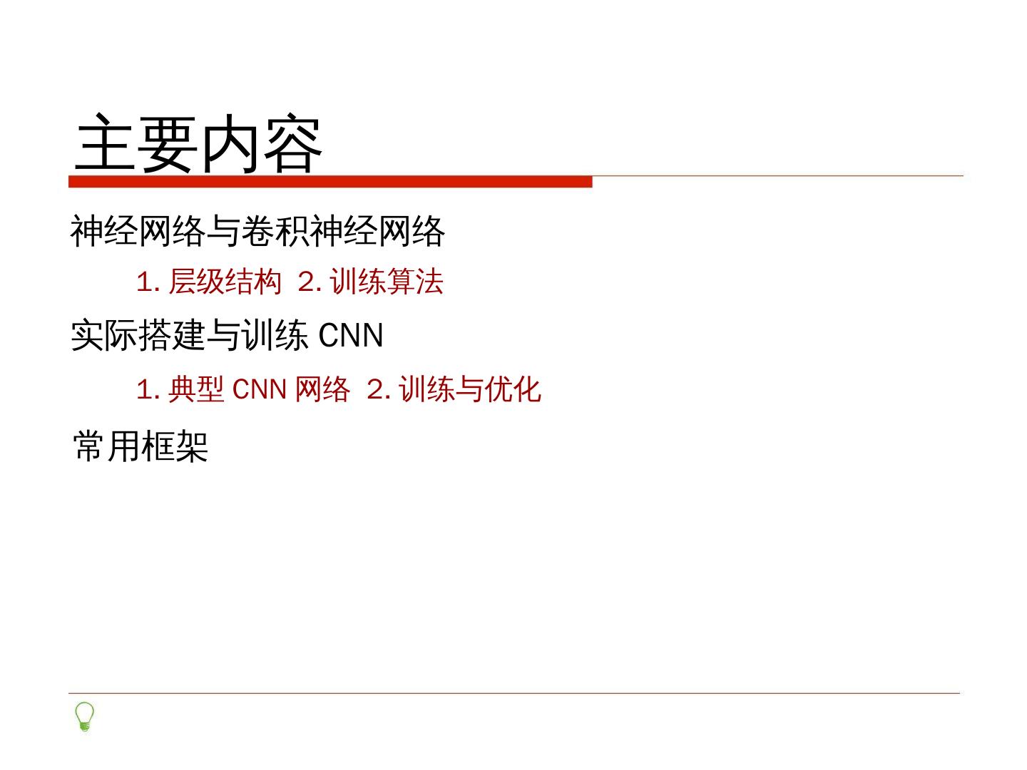 卷积神经网络. 梁昱森. SA16225161. 主要内容. 神经网络与卷积神经网络. 1.层级结构2.训练算法. 实际搭建与训练CNN. 1.典型CNN网络2.训练与优化. 常用框架.
