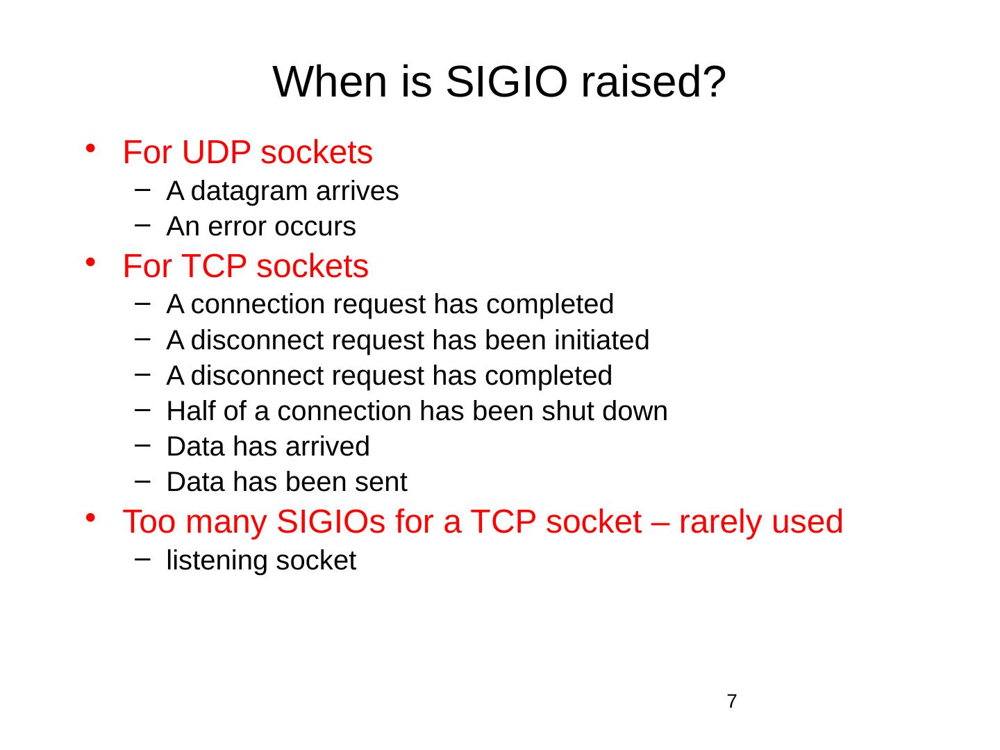 Establish a signal handler for SIGIO. Functions signal/sigaction. Set the socket owner. fcntl with command F_SETOWN. Enable signal-driven I/O for the socket.