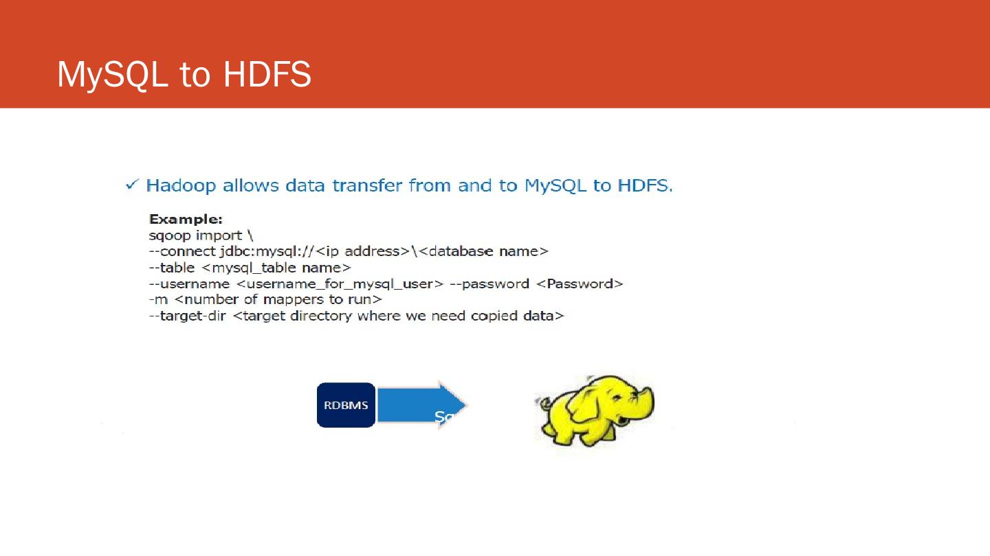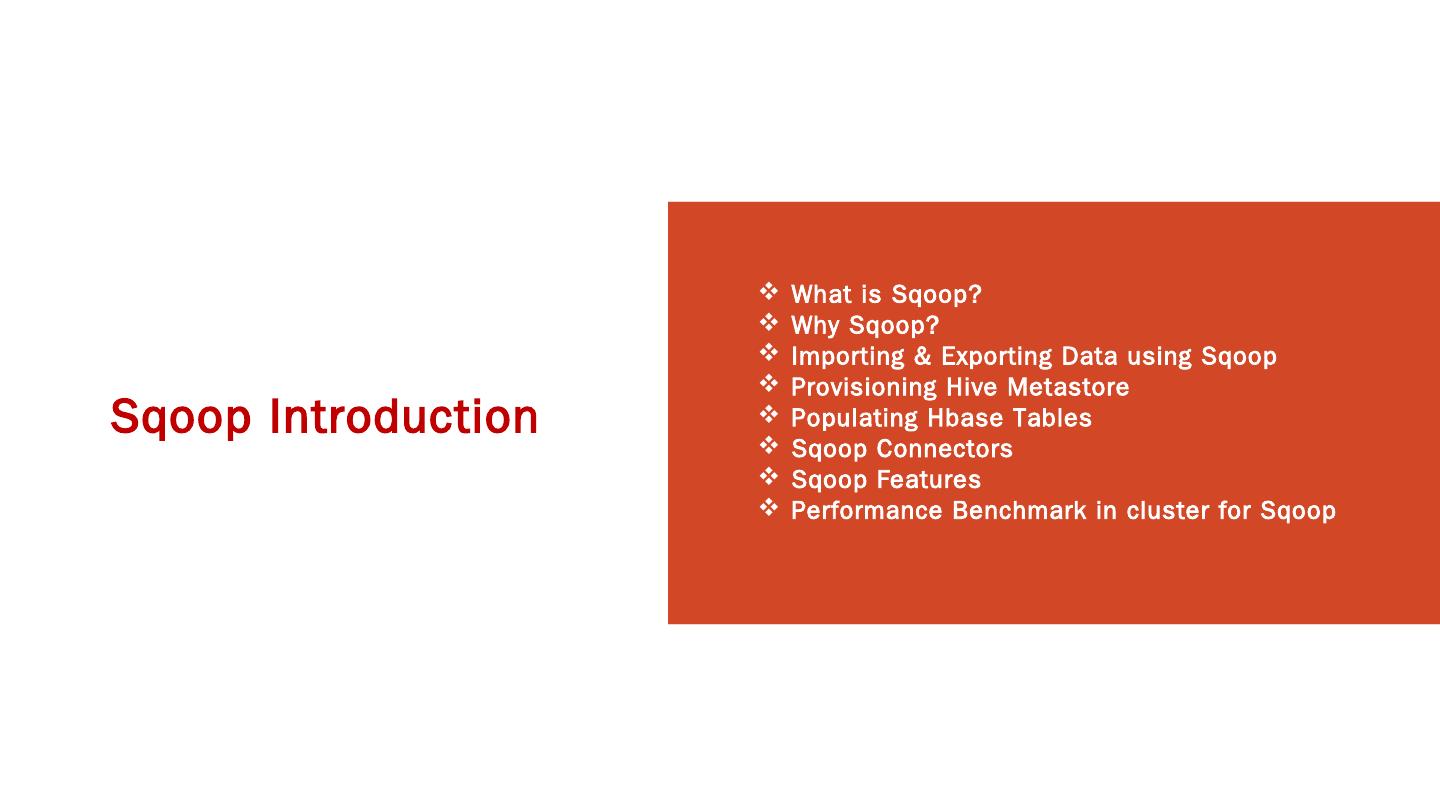 Importing & Exporting Data using Sqoop; Provisioning Hive Metastore; Populating ... Sqoop is a data transfer tool; Sqoop transfer data between hadoop and ...