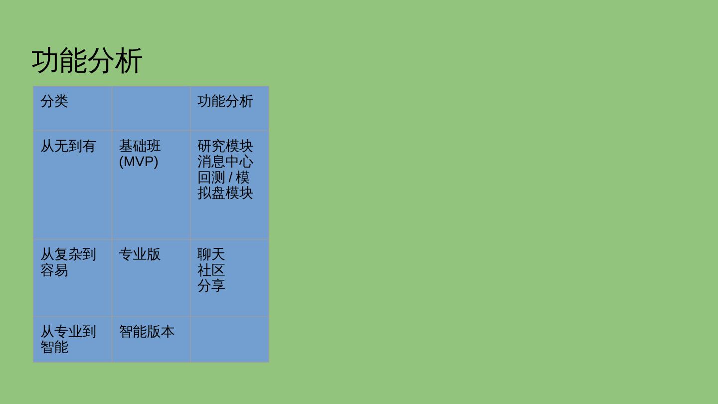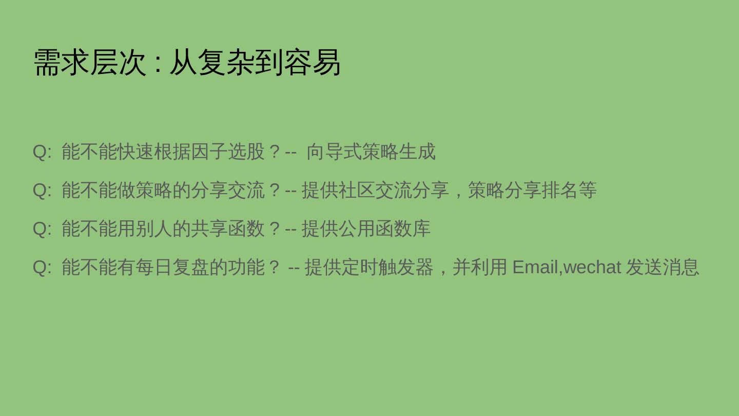 Q: 我需要获取树--完整丰富的数据接口. Q: 我需要做研究分析--- ... 向导式策略生成. Q: 能不能做策略的分享交流? ... UserCase(最小可用版本). juypter notebook.