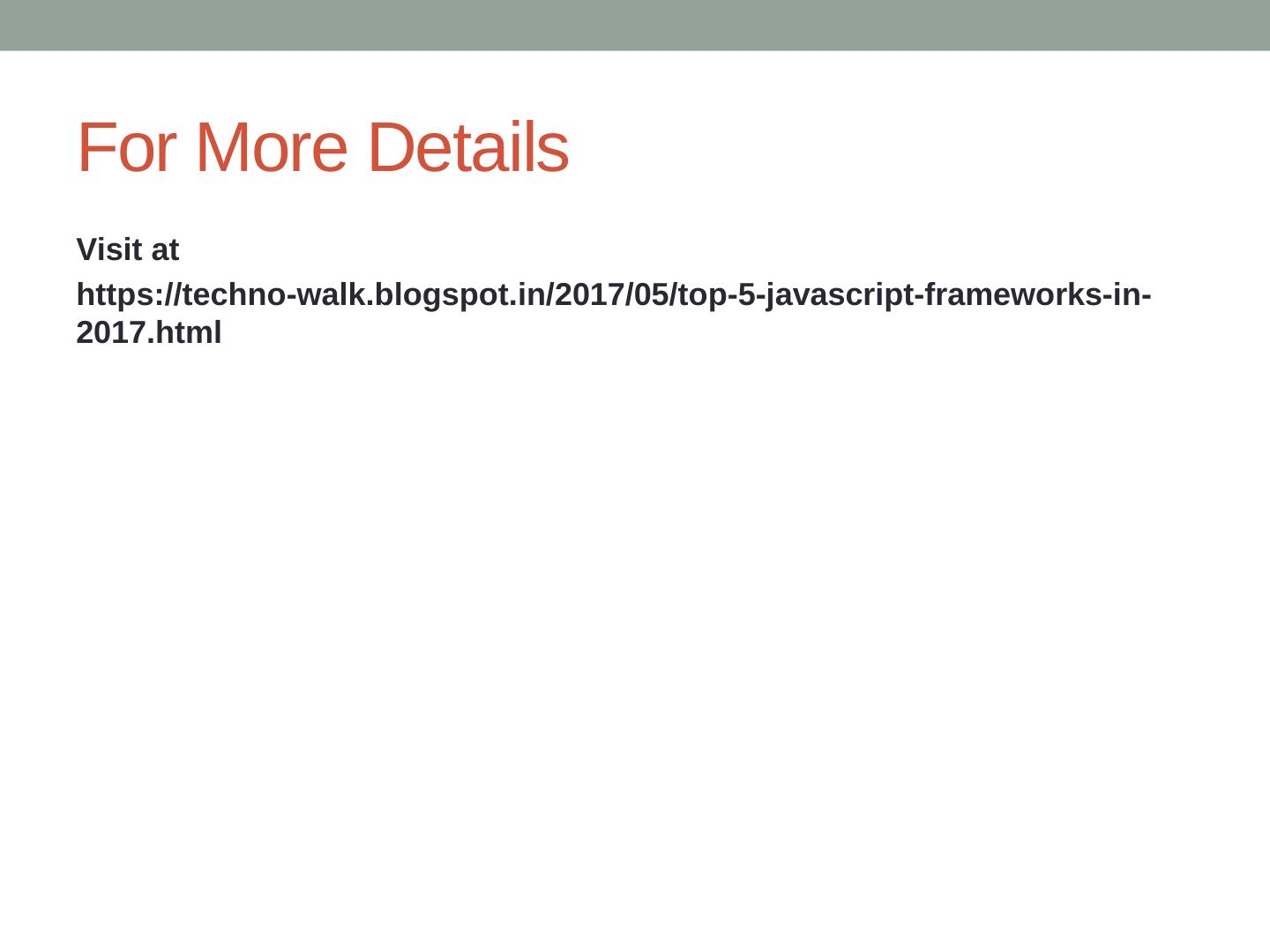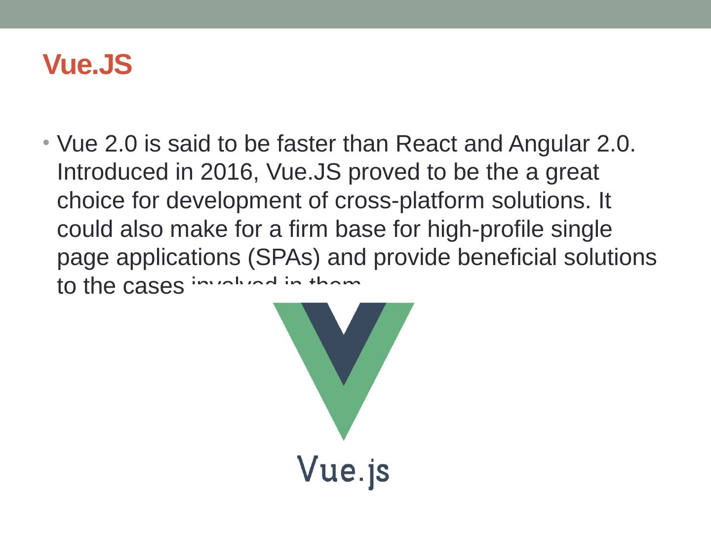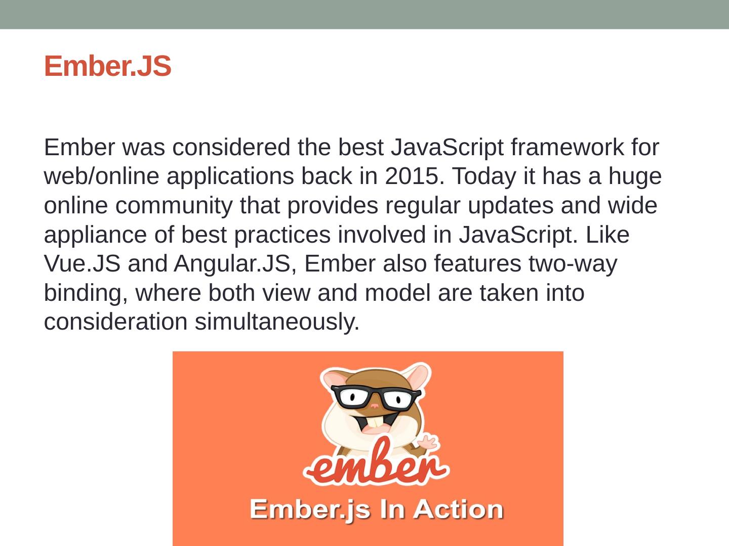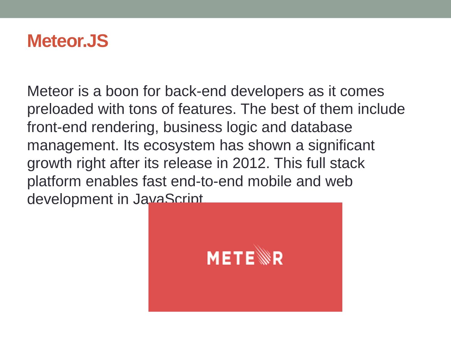 Top JavaScript Frameworks. Angular.JS; React.JS; Vue.JS; Ember.JS; Meteor.JS. Angular.JS. In 2016, the AngularJS had hit the market after a long wait.