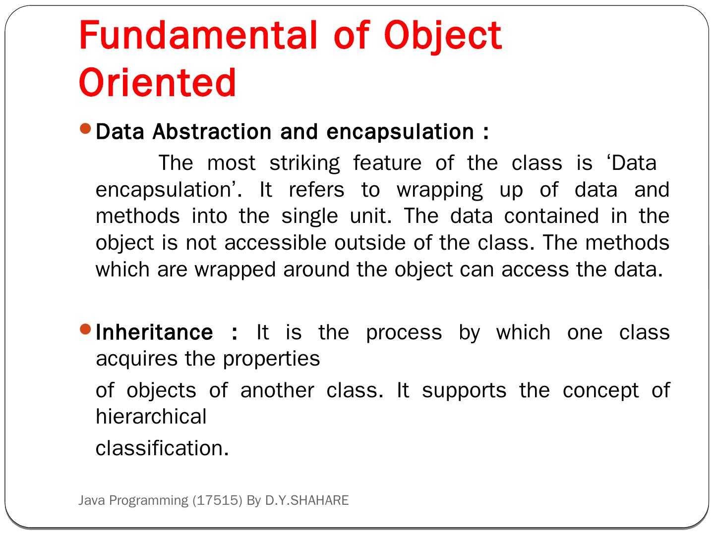 INTRODUCTION TO JAVA. Java Programming (17515) By D.Y.SHAHARE. Fundamental of Object Oriented Programming. Java Programming (17515) By D.Y. ...