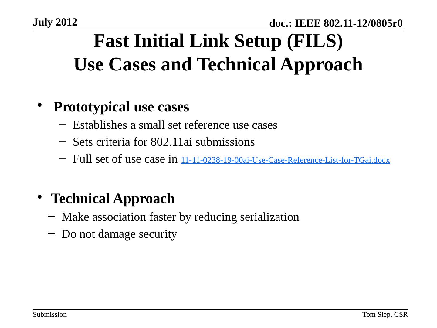 No public info is yet available for 802.11ai. July 2012. Tom Siep, CSR. doc.: IEEE 802.11-12/0805r0. Submission. Fast Initial Link Setup (FILS)