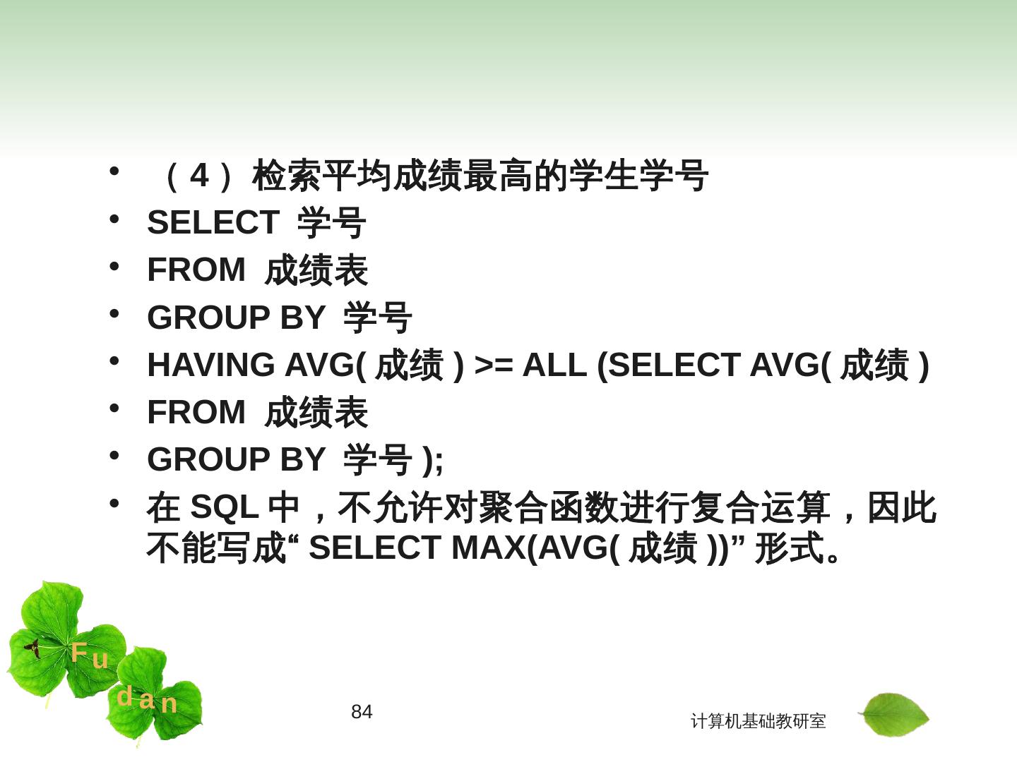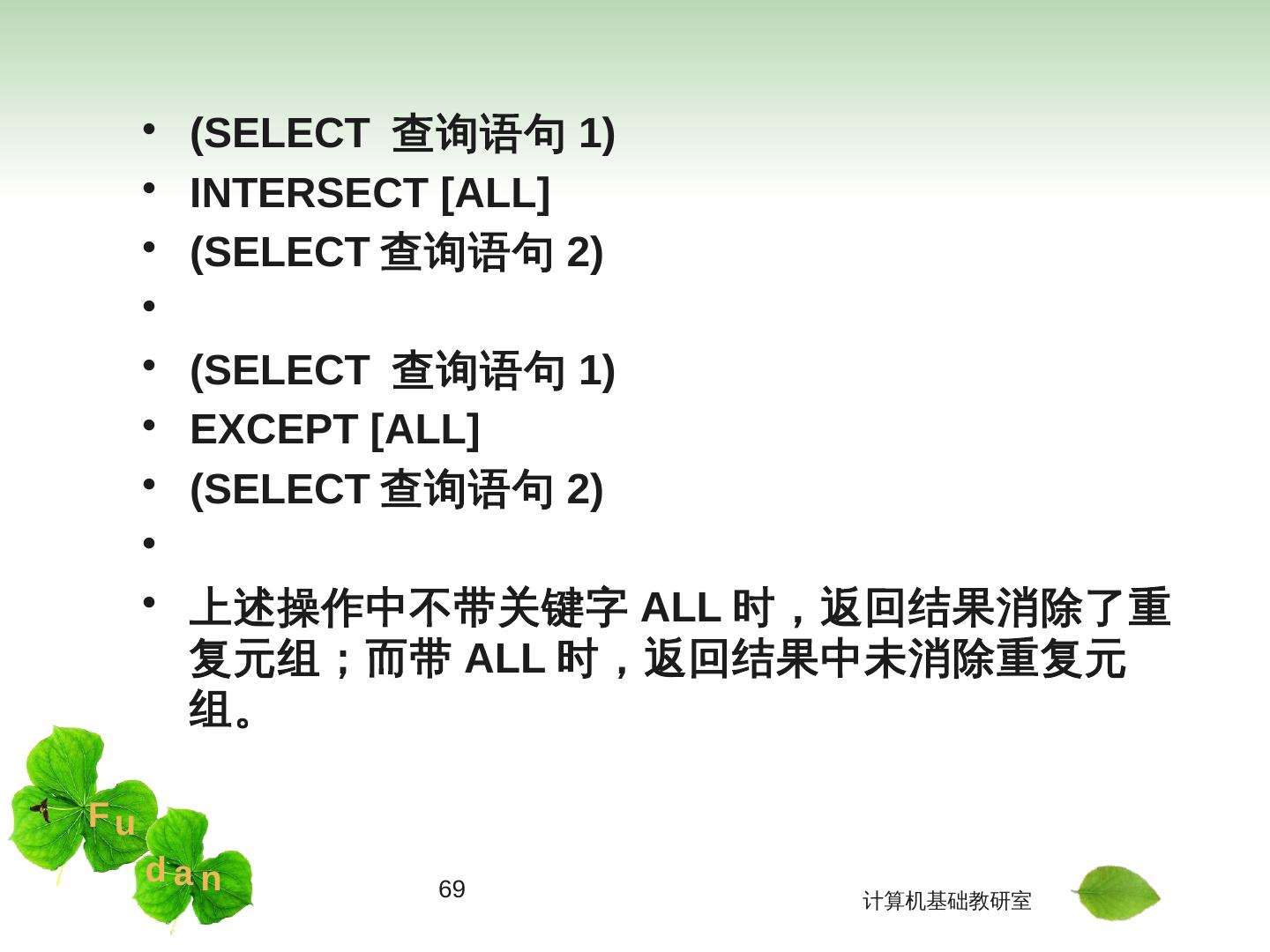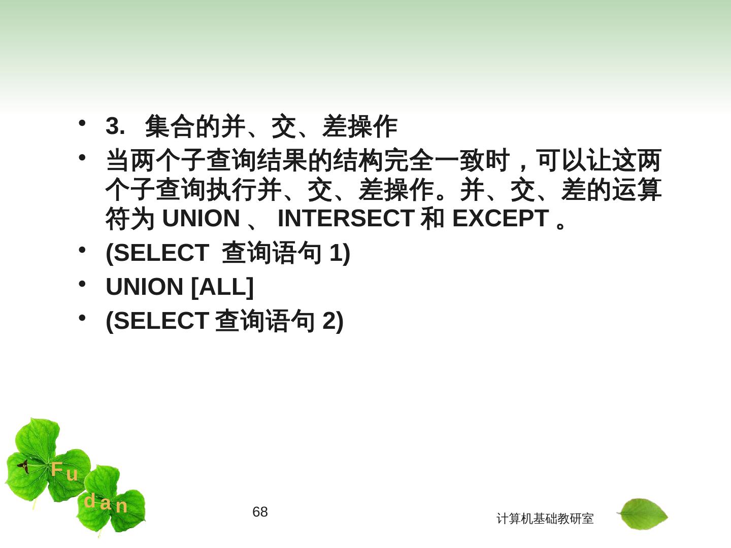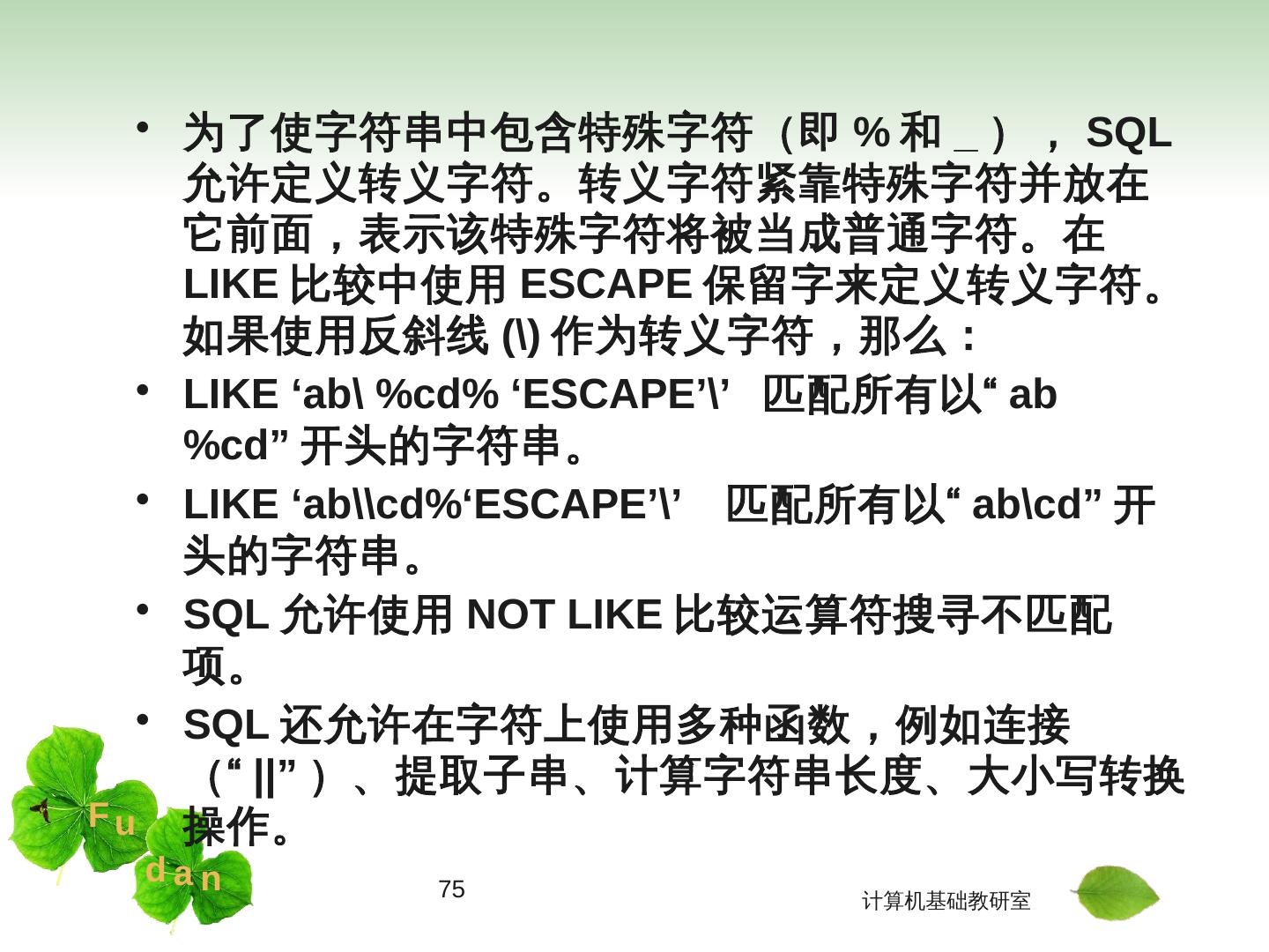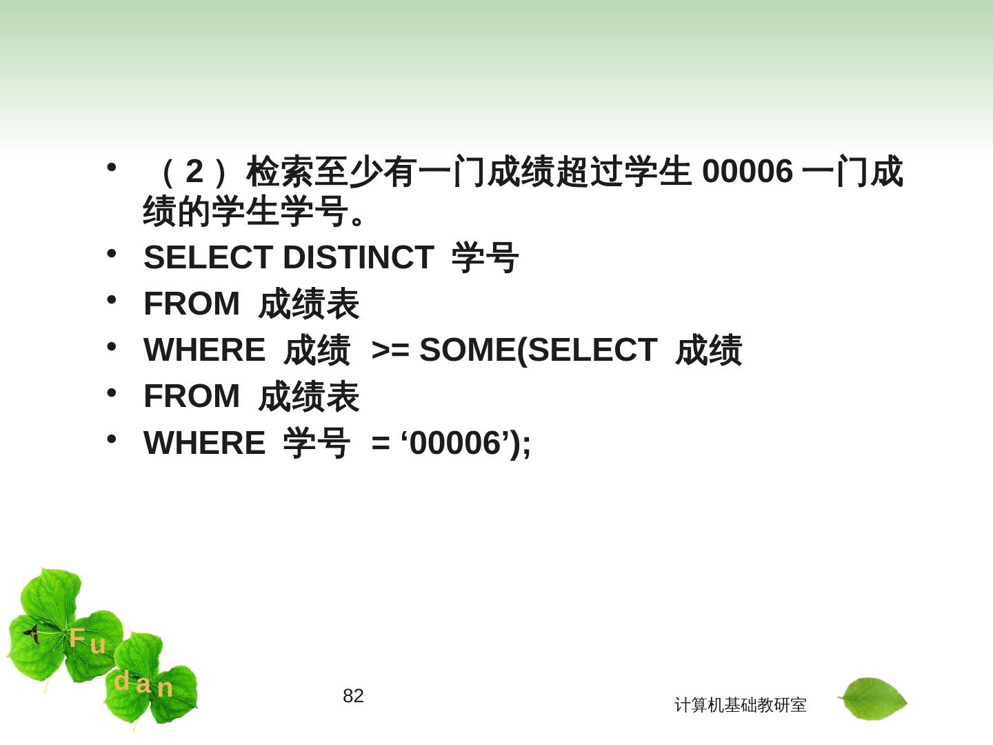 SQL具有如下特点:; (1)SQL具有十分灵活和强大的查询功能,其SELECT语句能完成相当复杂的查询操作,包括各种关系代数操作、统计、排序等操作;; (2)SQL不是 ...