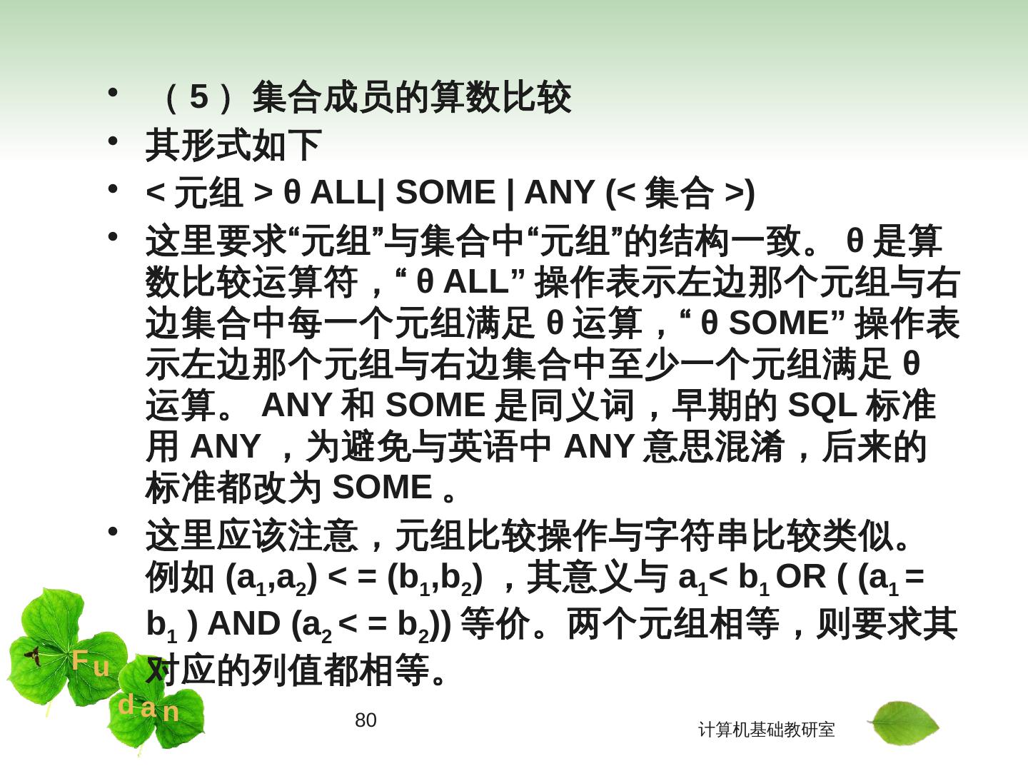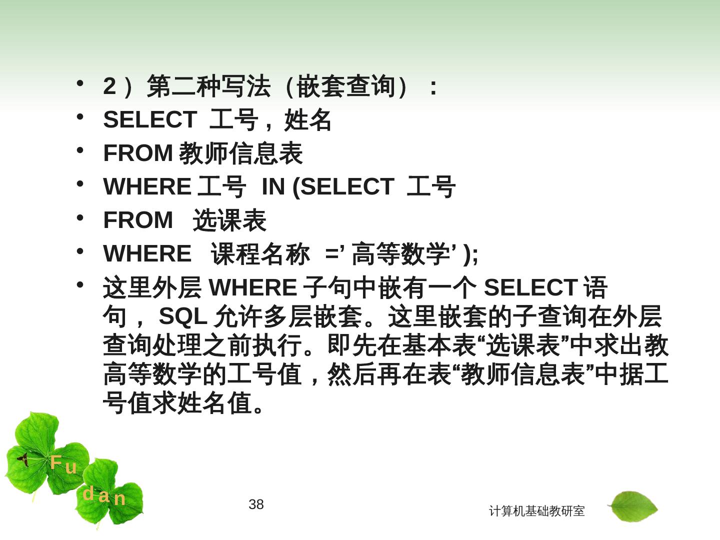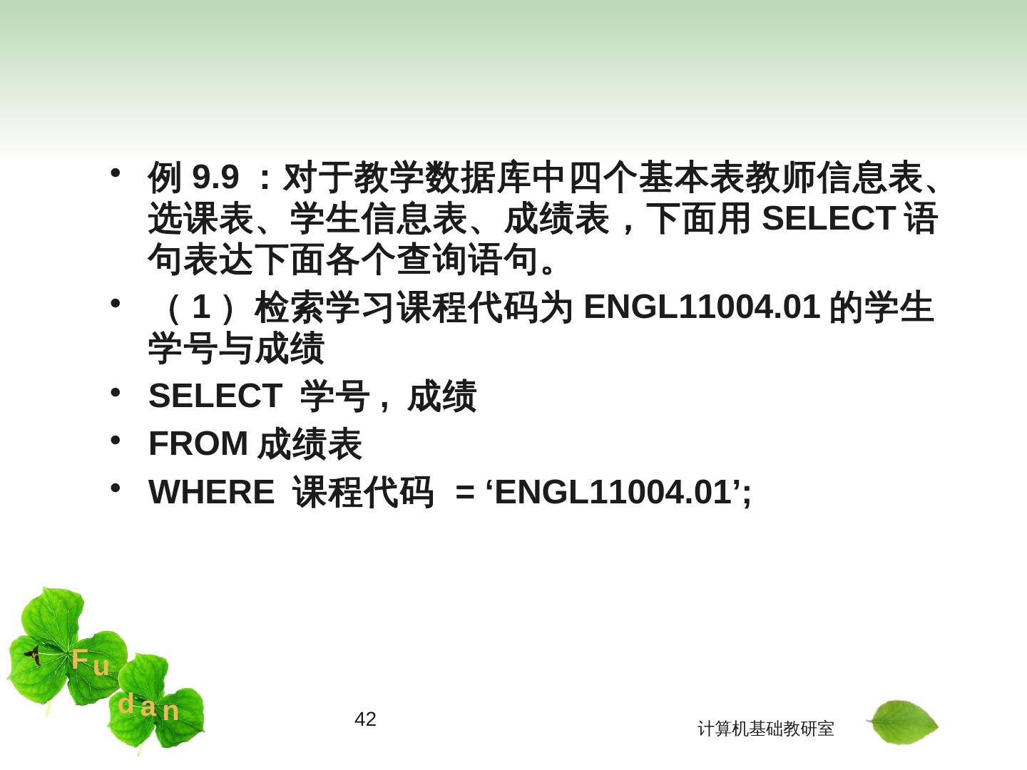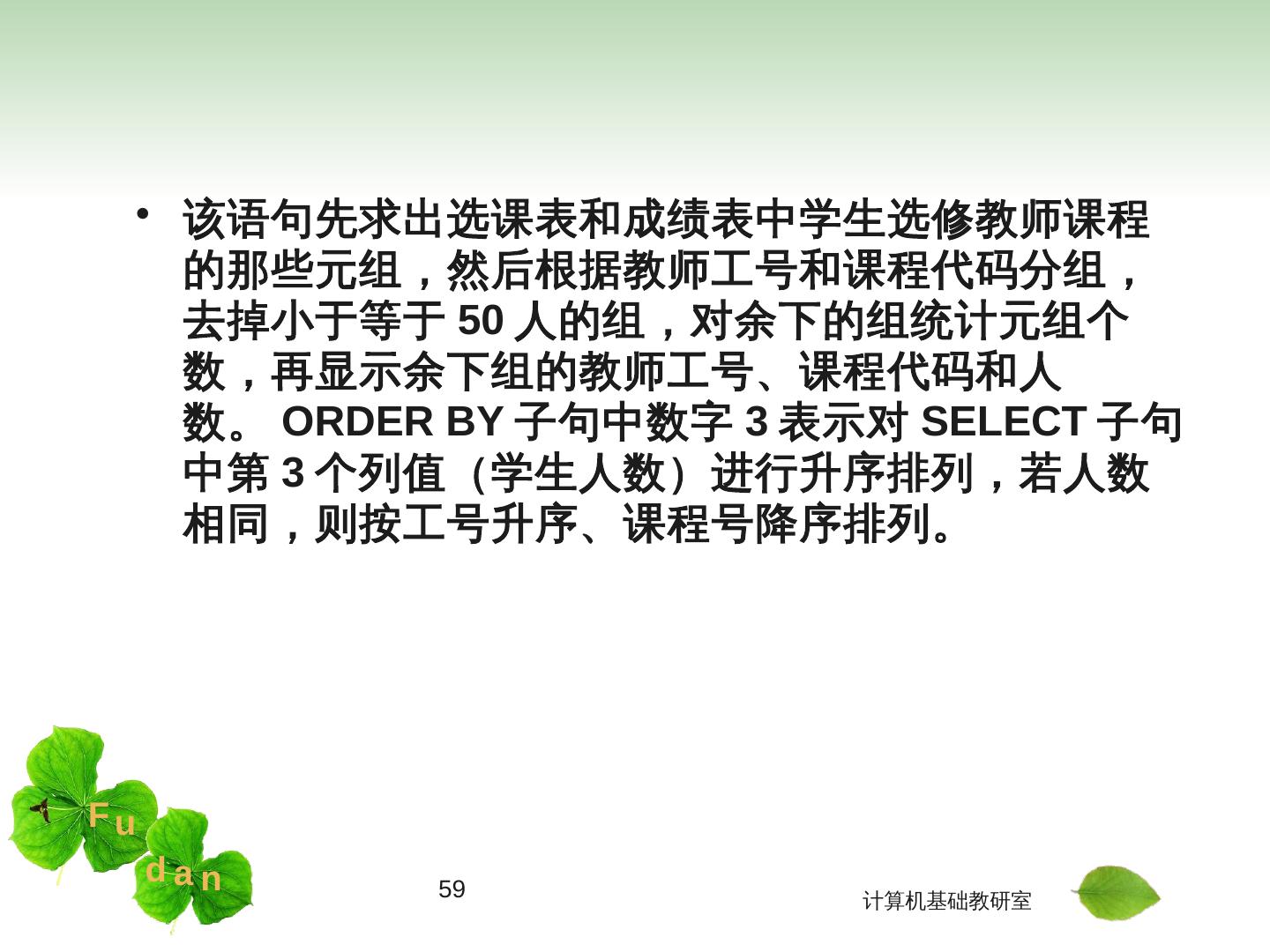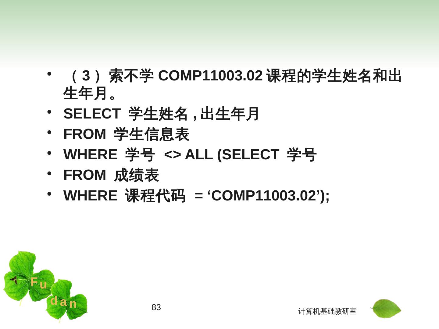 SQL具有如下特点:; (1)SQL具有十分灵活和强大的查询功能,其SELECT语句能完成相当复杂的查询操作,包括各种关系代数操作、统计、排序等操作;; (2)SQL不是 ...