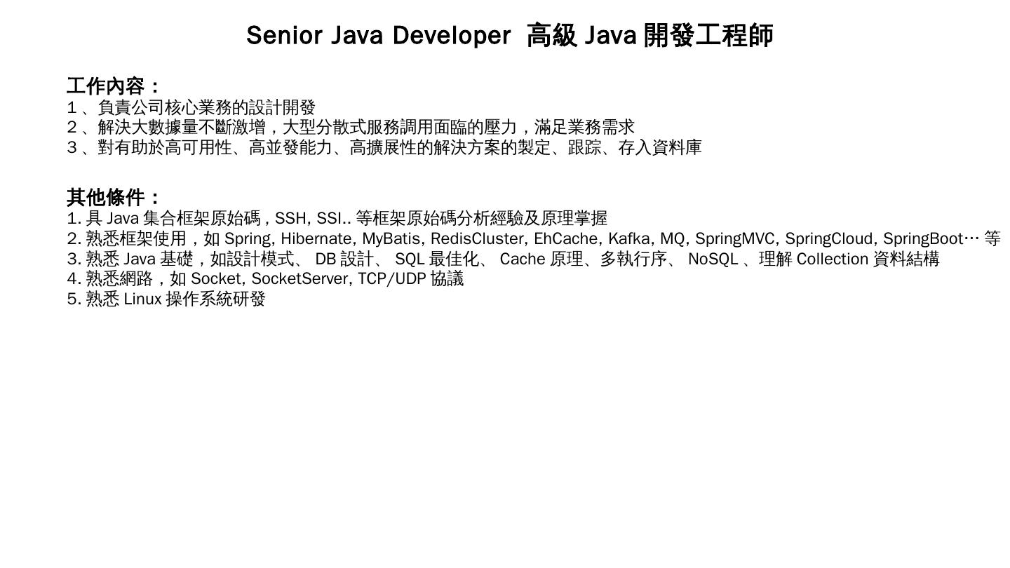 等框架原始碼分析經驗及原理掌握. 4.熟悉框架使用,如Spring, Hibernate, MyBatis, RedisCluster, EhCache, Kafka, MQ, SpringMVC, SpringCloud, SpringBoot…等.